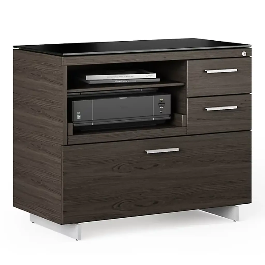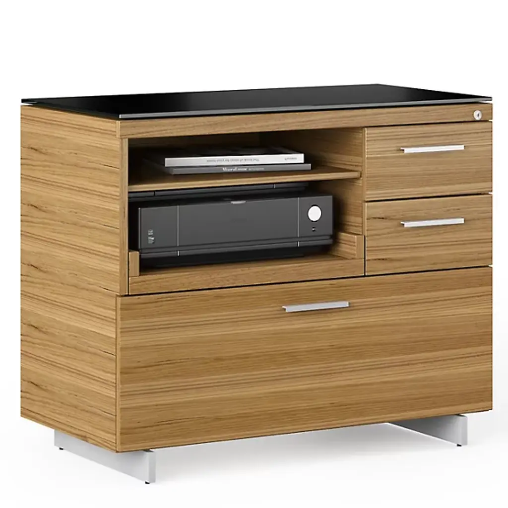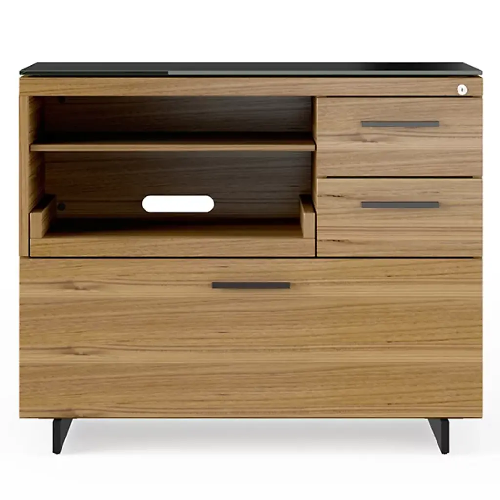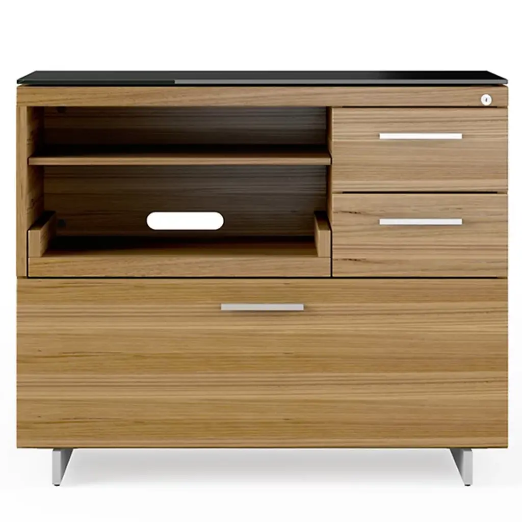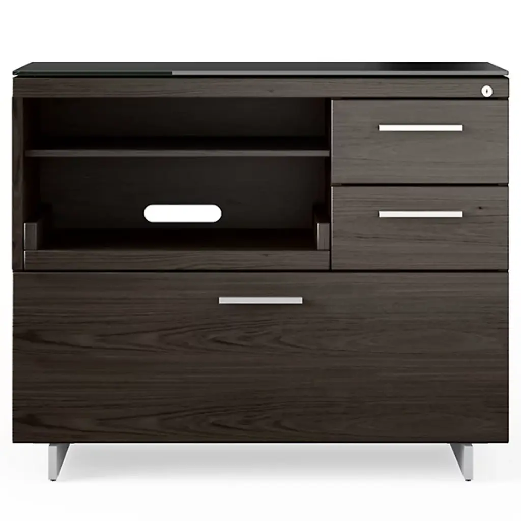 Smart aesthetics and high functionality. The Sequel 20 Multifunction Cabinet by BDI brings stylish modular storage to a home office or executive space. Designed to provide efficient storage and organization in the modern workspace, the multi-functional cabinet features a pull-out printer shelf, a pair of drawers to manage office supplies and a large bottom filing drawer to organize office documents. Wrapped in finely grained Hardwood Veneer and topped with a smooth, scratch and ding resistant Tempered Glass surface, this handsome unit adds a polished look and high-functioning equipment and storage space in a large office. For a compact space, partner the cabinet with the Sequel 20 Desk / Console Return for a complete workspace and storage solution.