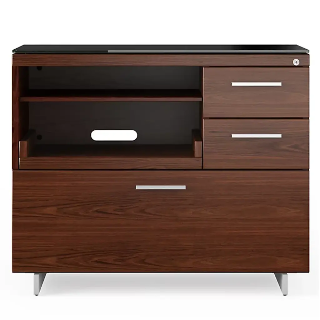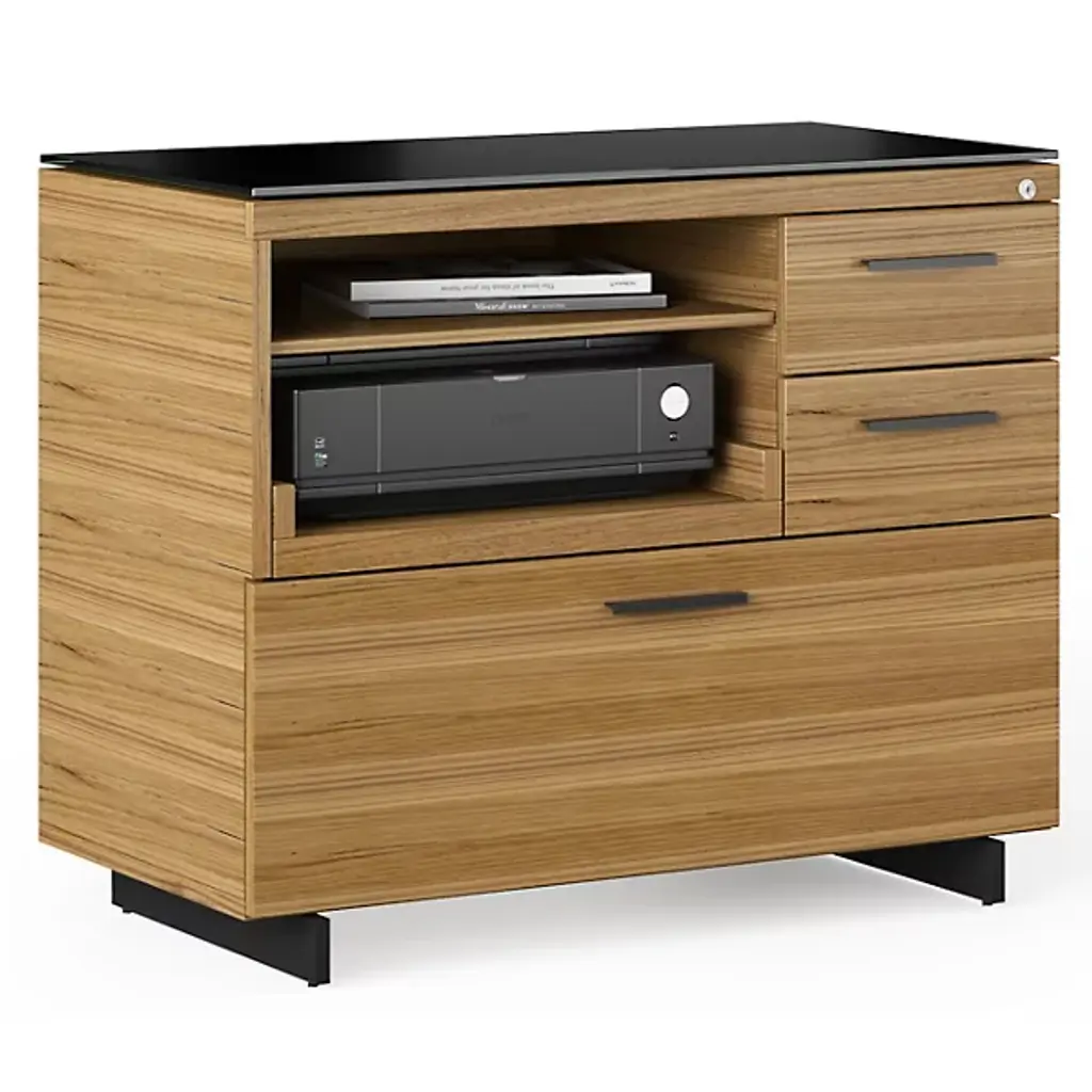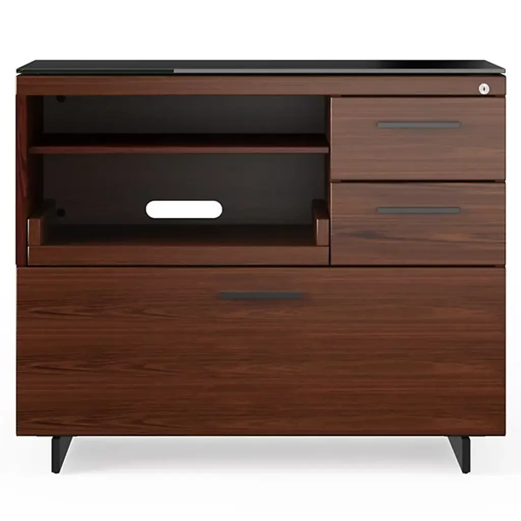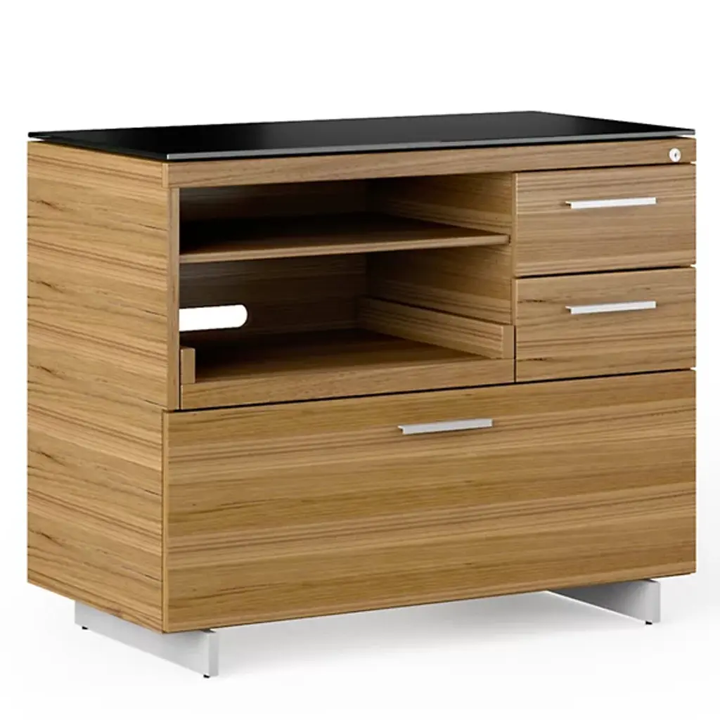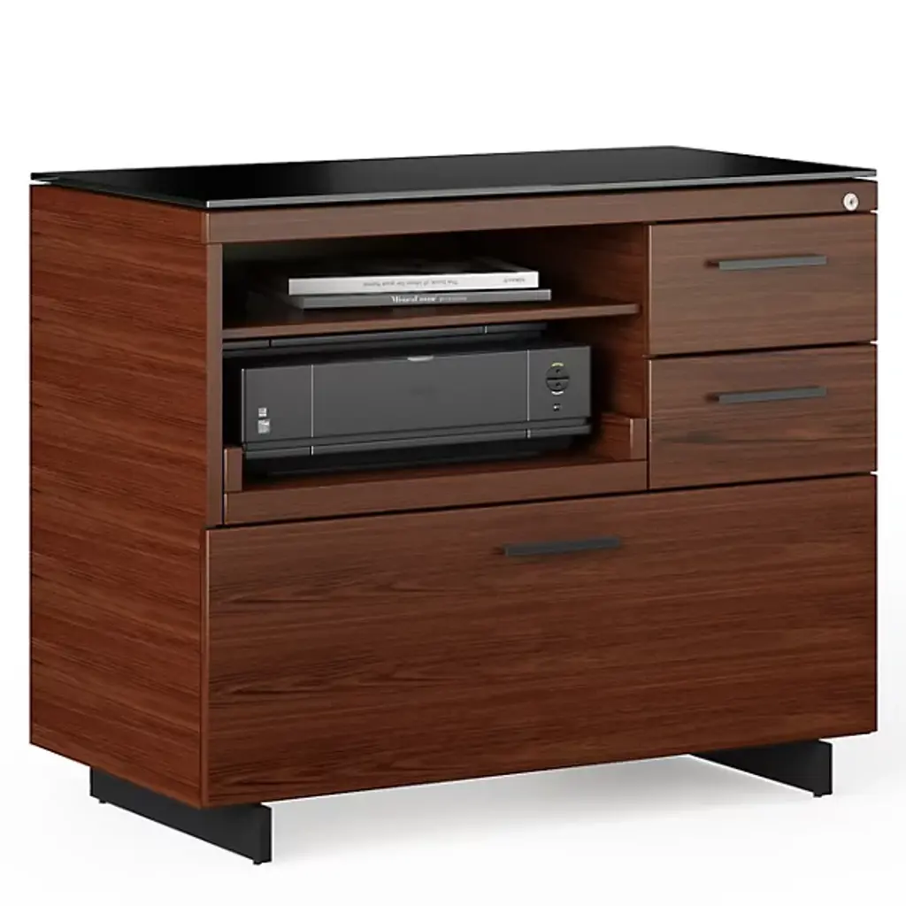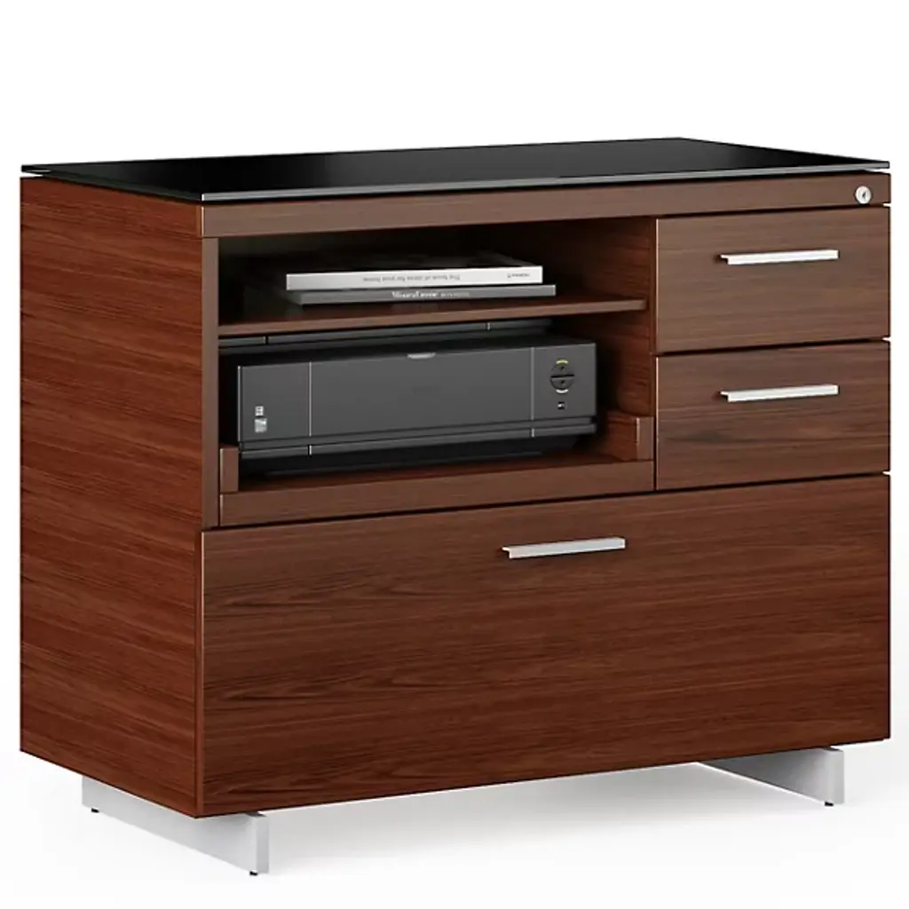 Smart aesthetics and high functionality. The Sequel 20 Multifunction Cabinet by BDI brings stylish modular storage to a home office or executive space. Designed to provide efficient storage and organization in the modern workspace, the multi-functional cabinet features a pull-out printer shelf, a pair of drawers to manage office supplies and a large bottom filing drawer to organize office documents. Wrapped in finely grained Hardwood Veneer and topped with a smooth, scratch and ding resistant Tempered Glass surface, this handsome unit adds a polished look and high-functioning equipment and storage space in a large office. For a compact space, partner the cabinet with the Sequel 20 Desk / Console Return for a complete workspace and storage solution.