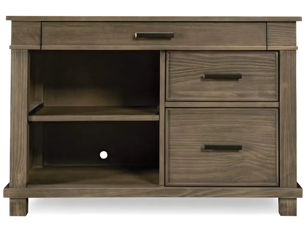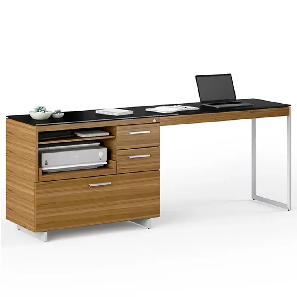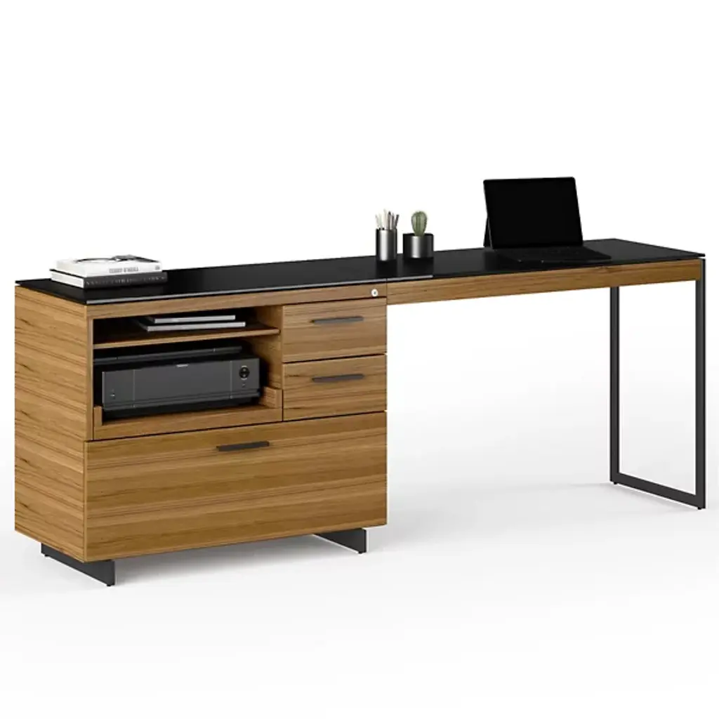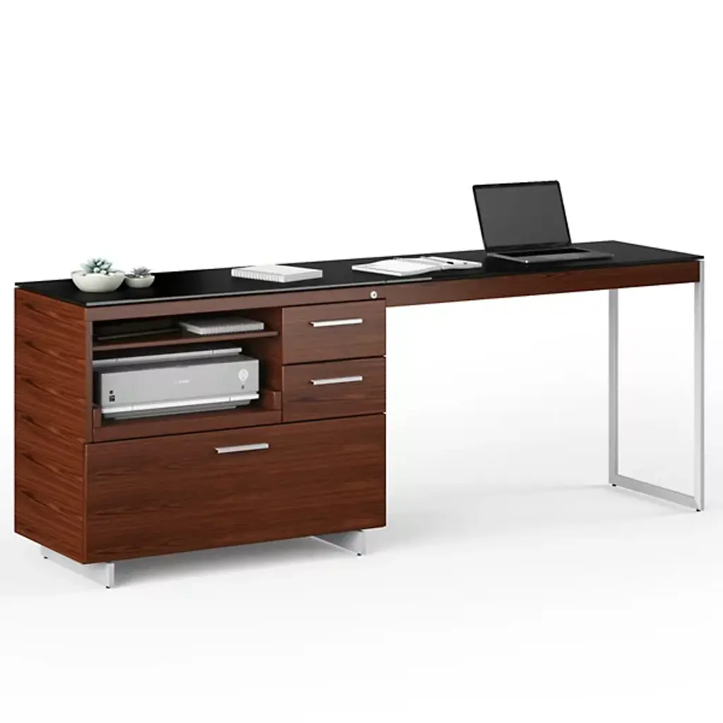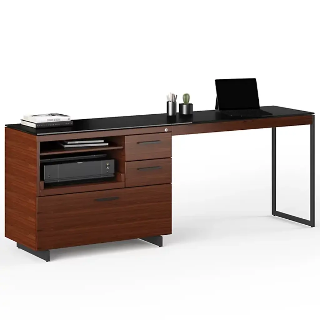 Smart aesthetics and high functionality. The Sequel 20 Multifunction Cabinet by BDI brings stylish modular storage to a home office or executive space. Designed to provide efficient storage and organization in the modern workspace, the multi-functional cabinet features a pull-out printer shelf, a pair of drawers to manage office supplies and a large bottom filing drawer to organize office documents. Wrapped in finely grained Hardwood Veneer and topped with a smooth, scratch and ding resistant Tempered Glass surface, this handsome unit adds a polished look and high-functioning equipment and storage space in a large office. For a compact space, partner the cabinet with the Sequel 20 Desk / Console Return for a complete workspace and storage solution.