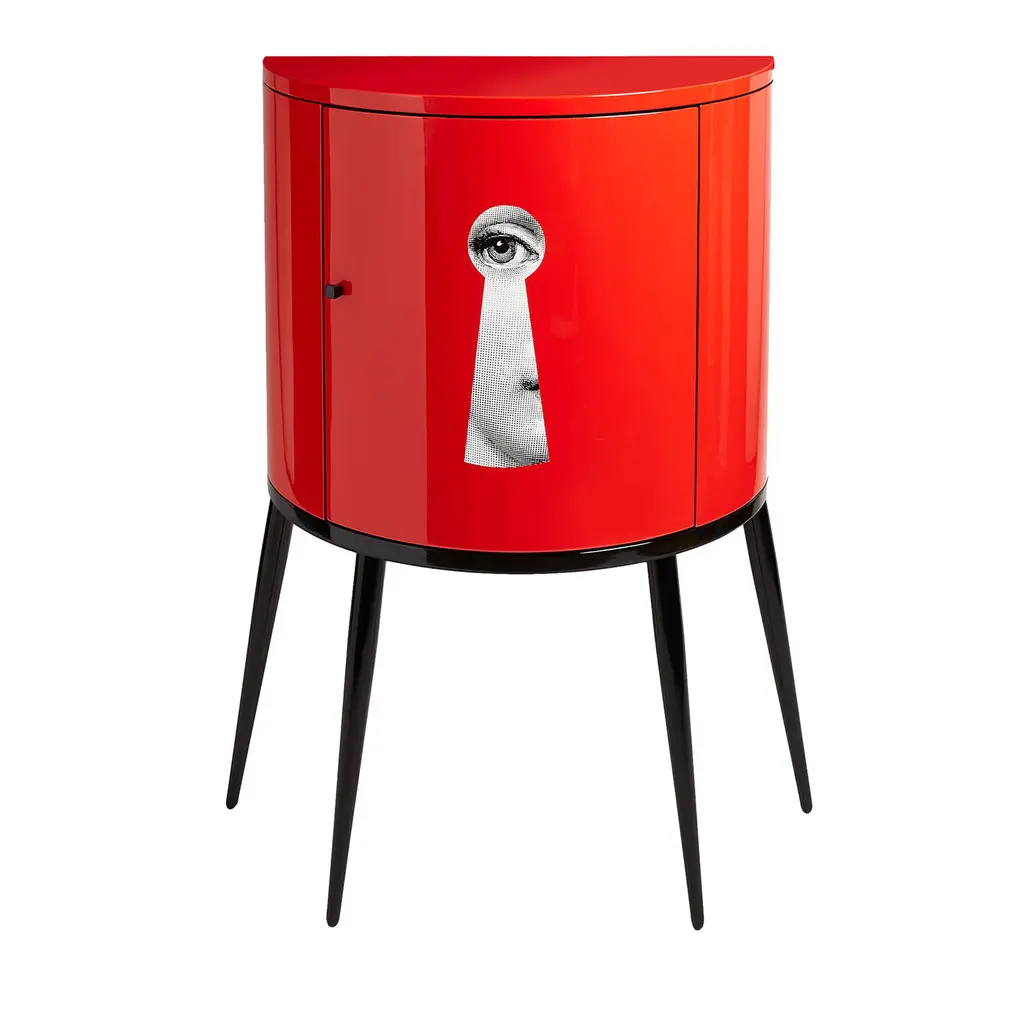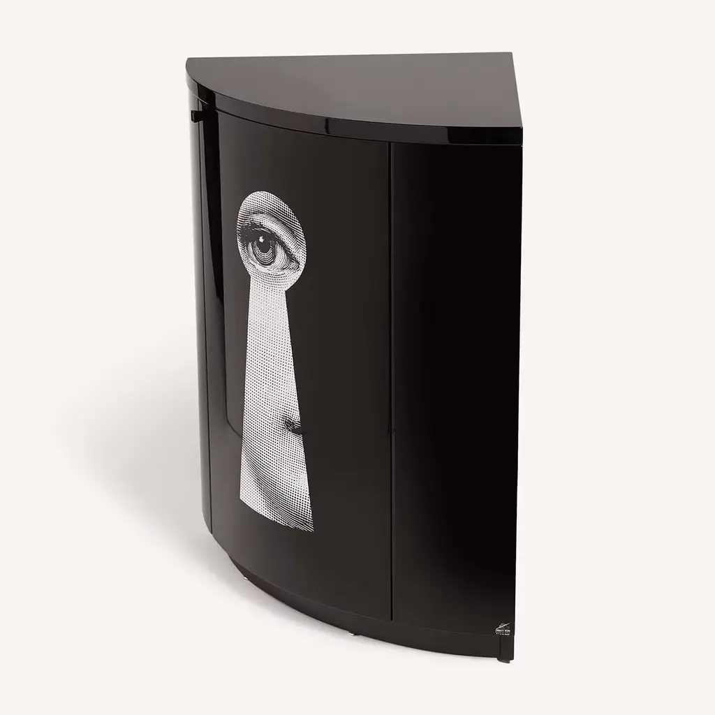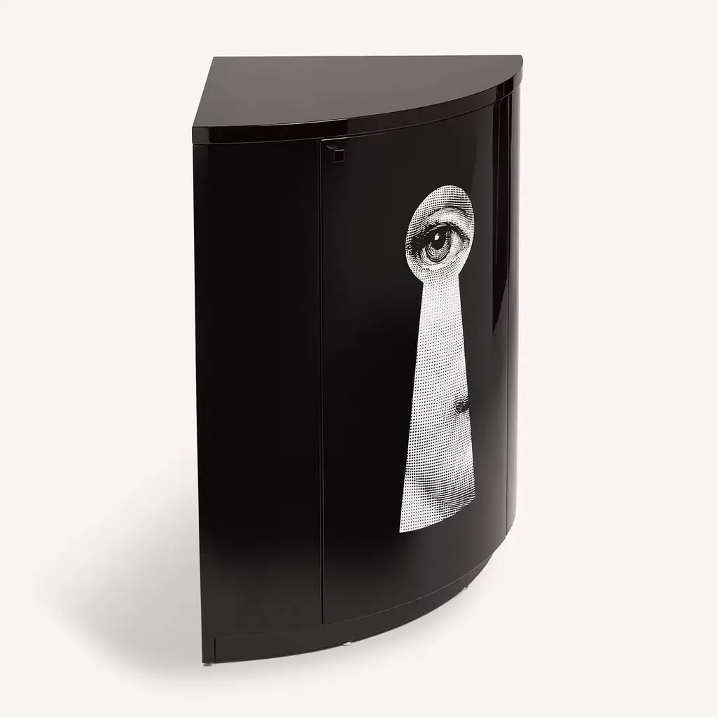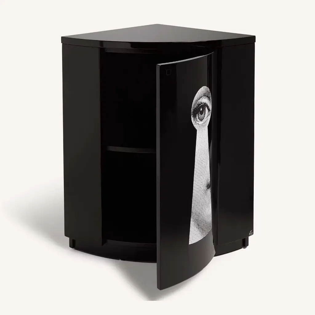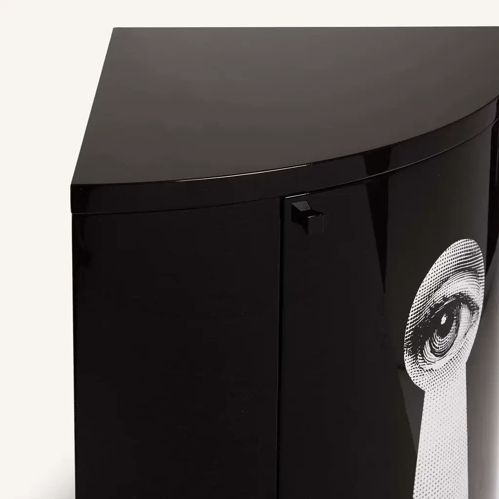 Designed to be placed in the corner of a room, this screen-printed and hand-lacquered piece of furniture still manages to become the center of attention thanks to the power of its hypnotic and surreal decoration, inspired by the gaze of Lina Cavalieri. Any minor discrepancies between similar creations are the result of craftsmanship and attest to the uniqueness of each product.