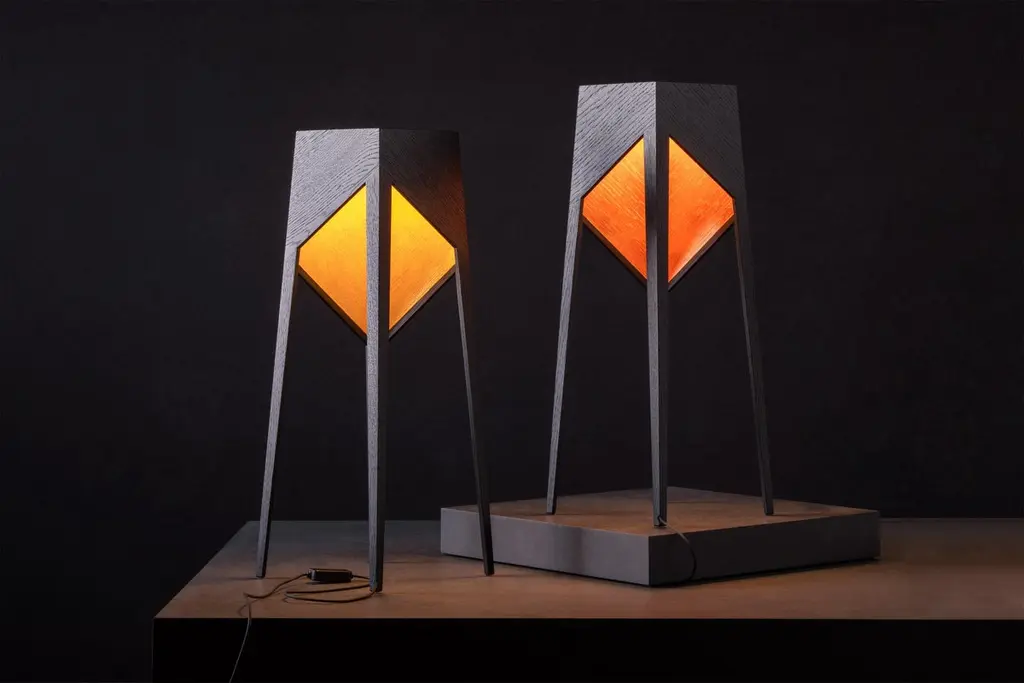 Set of 2 Luise Ltd baby floor lamp by Matthias Scherzinger.Limited Edition of 2.Dimensions: H 46.5 x 18 cm.Materials: solid wood - oak black stained hard wax. Inside surface: copper leaf, gold leaf.All our lamps can be wired according to each country. If sold to the USA it will be wired for the USA for instance.LED 15 Wattcolour temperature 3.000 Kelvinlong life-time 50.000 Houtput / LED 1.230-1.830 Lumentextile cable 3 m white / blackdimmable by use of pedal button.Luise is a solid wood stand-alone lamp. She presents a self-assured pure expression of form by her seamless transition from her lamp shade to the supporting base. The radiant white kern provides for a delicate and ambient lighting.Luise blends easily into any environment at the same time offering a useful storage surface on her lampshade. Luise sets a specific accent and is an absolute eye-catcher. In her design we paid particular attention to a pristine naturalness and an ergonomic employment of materials.The lamp family comprises three individual objects.It all began in Glottertal, Germany. Born in 1978, Matthias developed early on a deep connection to nature and culture during his childhood. This was supported by the family‘s farming business (field, forest, vineyard, grassland). So, his rootedness in tradition and home arose early. Then, the handling of wood was restricted to the maintenance and care of the family forest.During school, Matthias’ strengths soon became visible. These all happened to be of the artistic kind. Driven by his practical nature, he was destined to start working in skilled crafts and trades after graduation. So in 1999, he decided to start an apprenticeship as a joiner/cabinet maker. Following his first professional years, he felt like a change. Following his inner voice in search of development and self-fulfillment, he initiated a journey in search of his new self.In 2014 he returned to his origins and founded his own furniture label by the name of FREUDWERK - Design & Manufaktur.Initially, FREUDWERK was merely a design studio located in Glottertal, Germany. In the meantime, Matthias owns and operates his own factory in Reute, Germany, where he develops and crafts his creations in a very skilled, careful and elaborate way. Alongside his own collection, Matthias manufactures designs from individual customer specifications. FREUDWERK services deliver conceptualisation, prototyping and serial manufacturing, that is, a wholistic design from beginning to end.