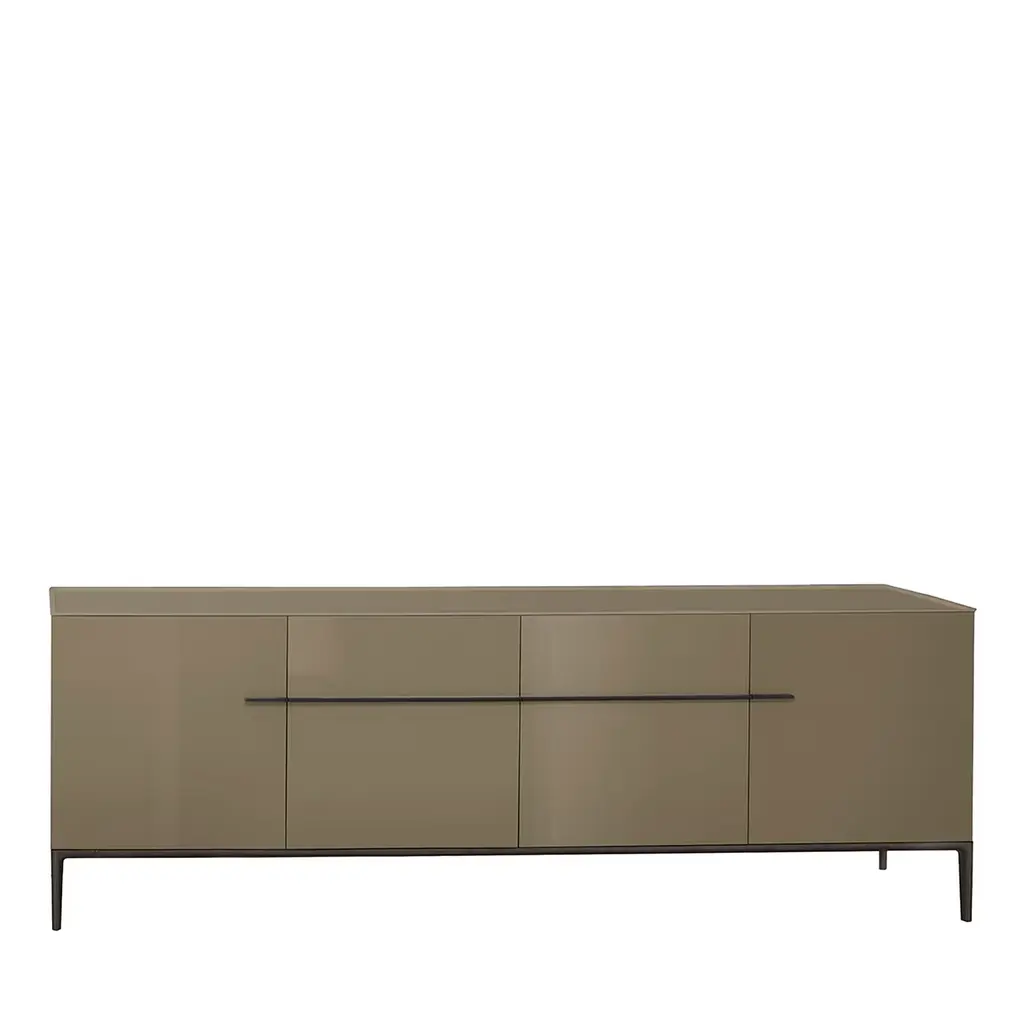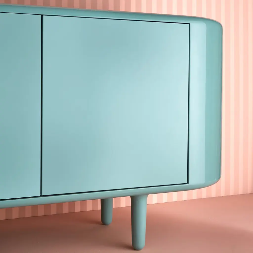 The distinctive design of the famous Italian high-speed express train ETR 300 (aka Settebello) is the inspiration behind this cabinet, whose well-balanced proportions and soft, rounded lines are the perfect fit for a modern home. Supported by four straight feet, the elongated oval frame of light blue lacquered MDF features four handless doors with a push-pull opening. Available in other finishes and customizable dimensions, ask the Concierge for details.