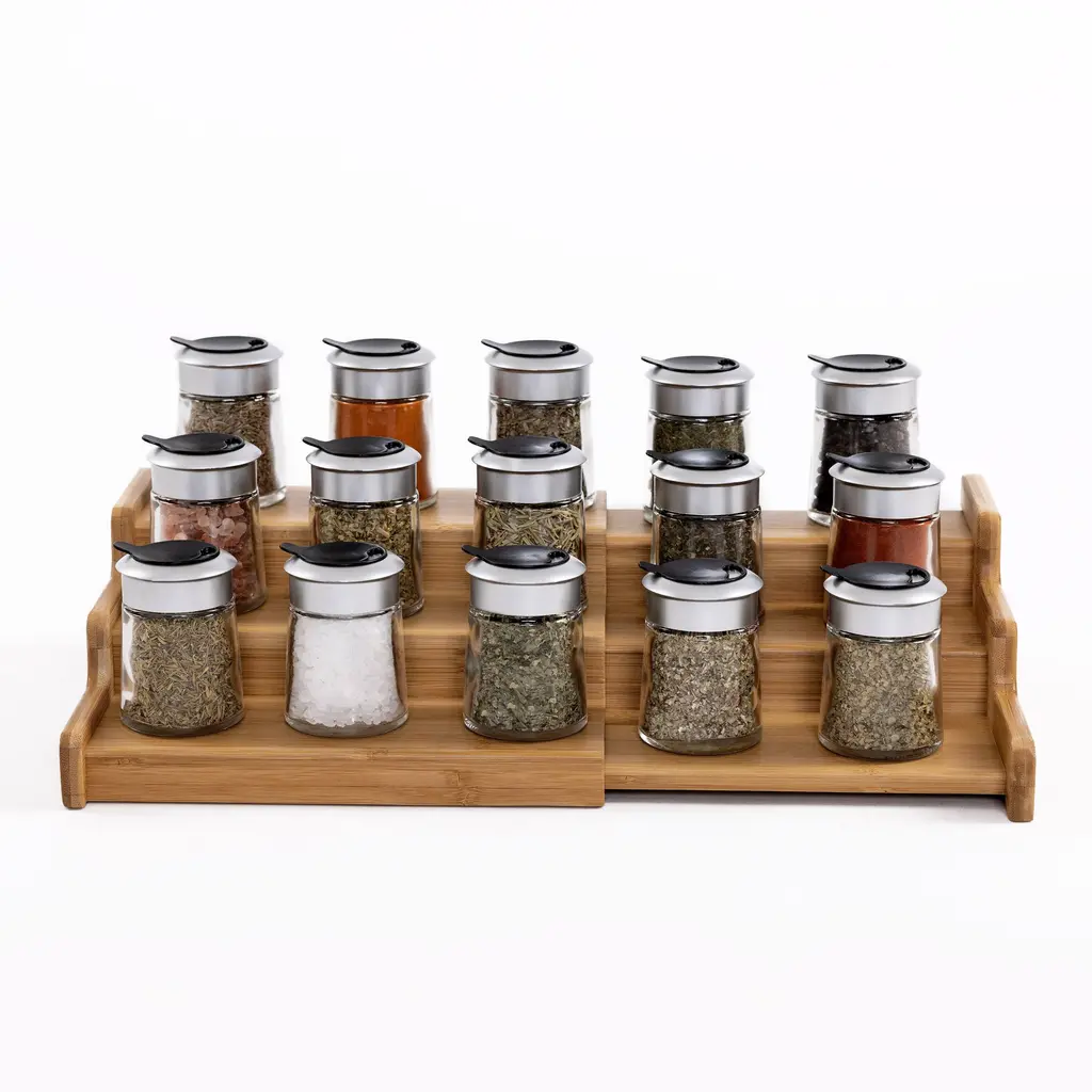Organize your cabinets or pantry with Seville Classics 3-Tier Expandable Bamboo Spice Rack Step Shelf Organizer. This step shelf spice rack is handcrafted from fast-growing, sustainable, all-natural bamboo. Spice rack is designed to expand and fit your growing spice collection. The shelf nearly doubles in size when expanded from 8.75 to 15 inches wide. Step shelf design features three levels for easy storage and display of bottles; easily read labels at a glance. Ideal for use in your kitchen, pantry, bathroom or vanity area to organize spices, small bottles and jars, perfumes, nail polishes, lotions, or other cosmetics. Unit measures 8.25 inches deep and just over 3 inches high. Easy to wipe clean with soap and water; air dry and do not submerge.Features:
