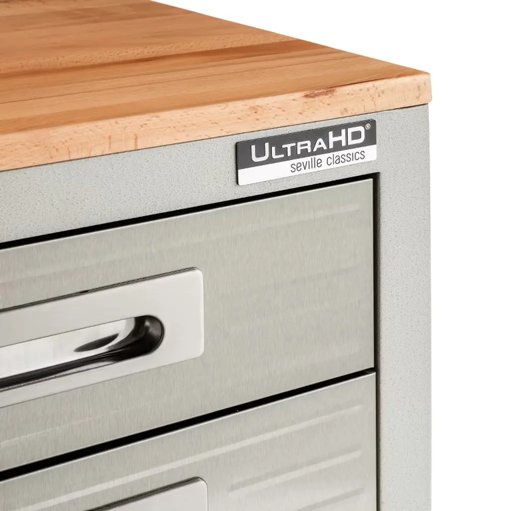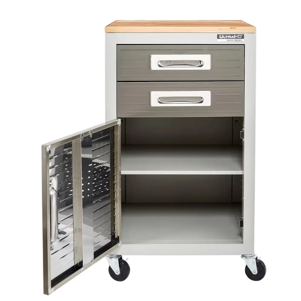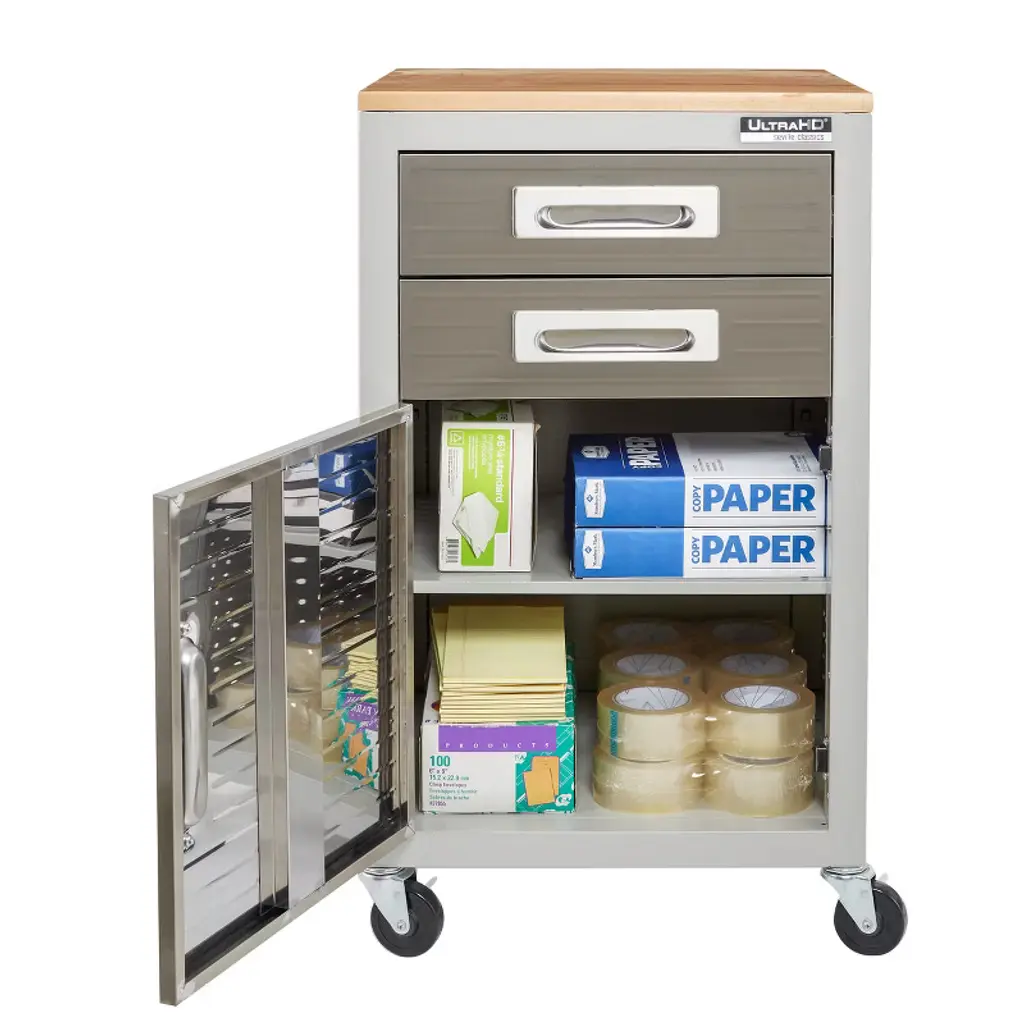 Utility and mobility come together in Seville Classics UltraHD 2-Drawer Rolling Storage Cabinet. Our cabinet is engineered for heavy-duty use with a body constructed of commercial-grade steel. The 3/4" solid hardwood top is intended for use as a work surface for everyone from home mechanics to professional tradesmen. It's the perfect multipurpose rolling cabinet for offices, warehouses, store rooms, and for use around the house.