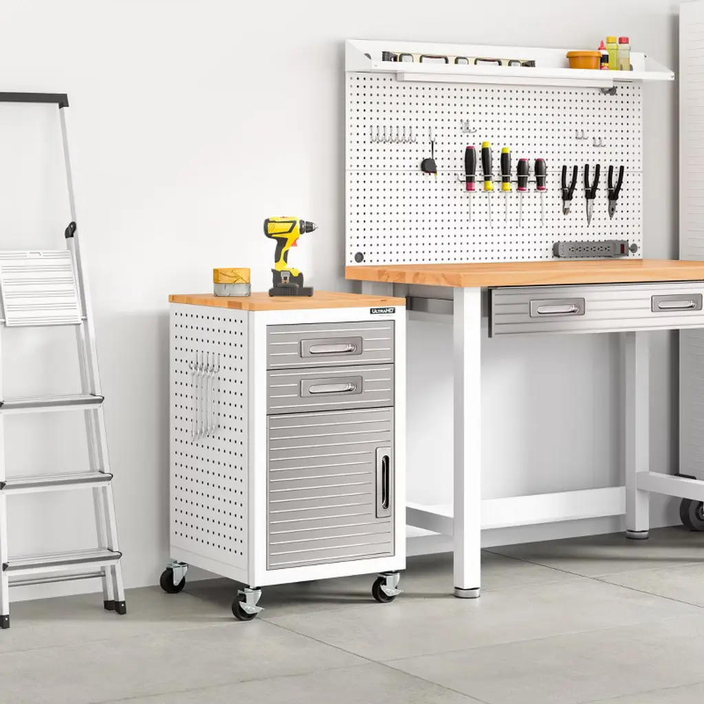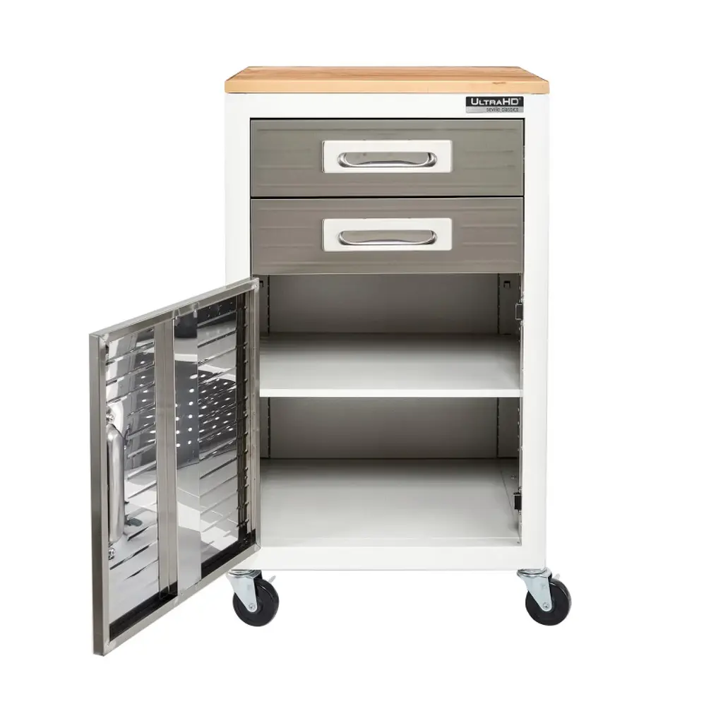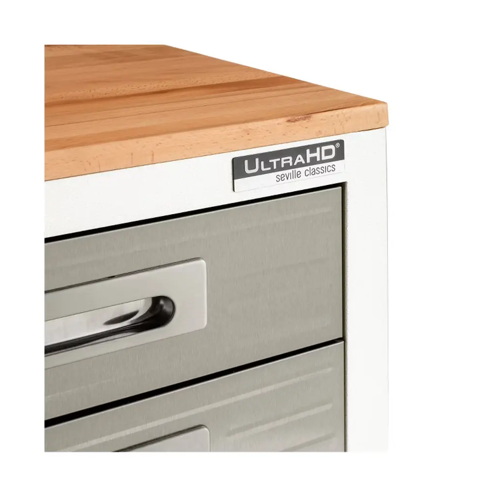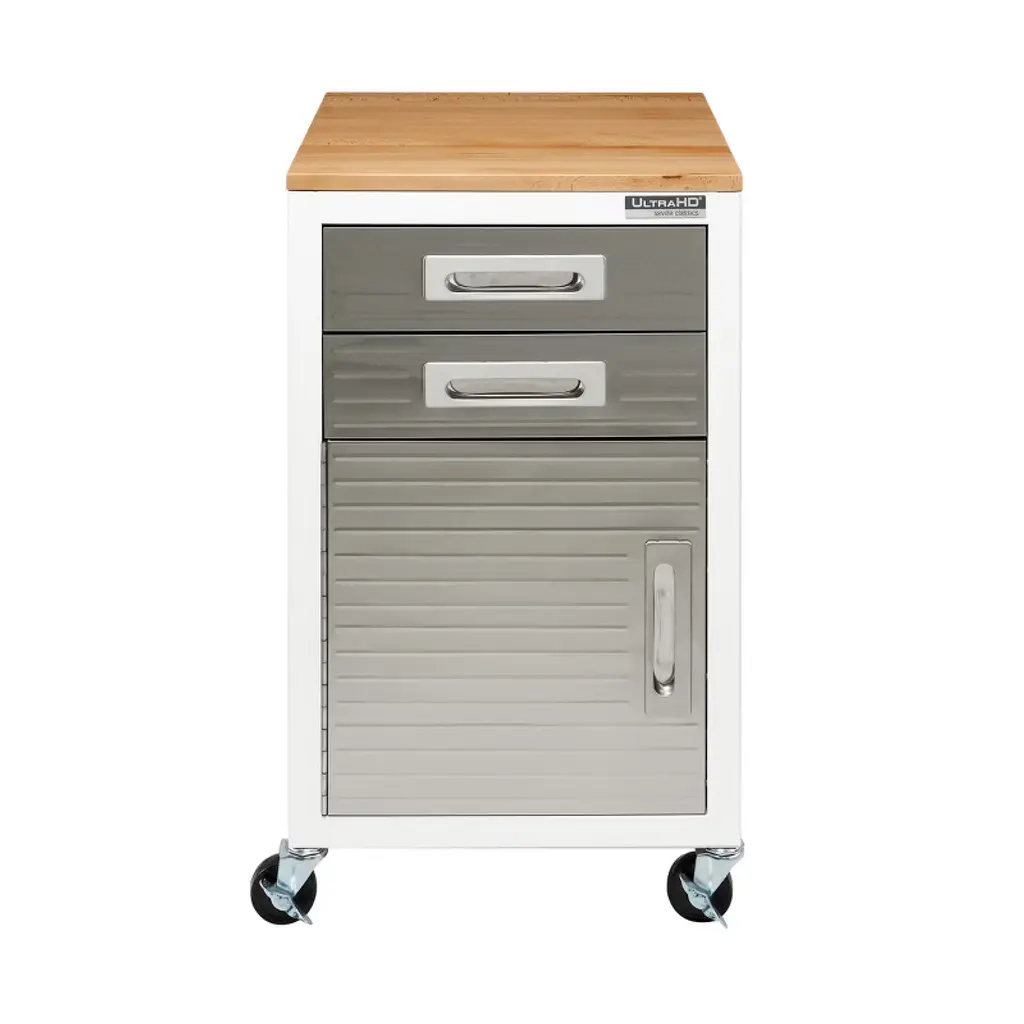 Utility and mobility come together in Seville Classics UltraHD 2-Drawer Rolling Storage Cabinet. Our cabinet is engineered for heavy-duty use with a body constructed of commercial-grade steel. The 3/4" solid hardwood top is intended for use as a work surface for everyone from home mechanics to professional tradesmen. It's the perfect multipurpose rolling cabinet for offices, warehouses, store rooms, and for use around the house.