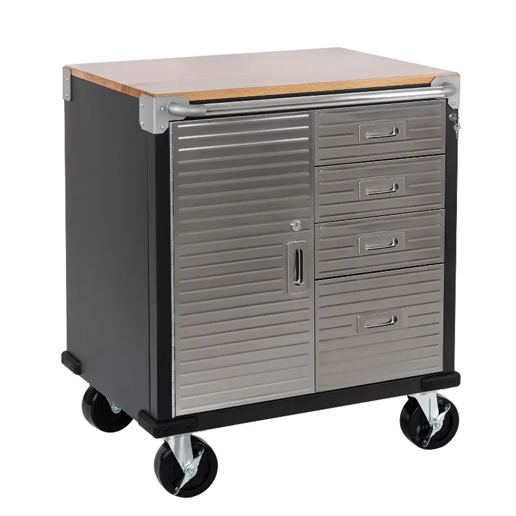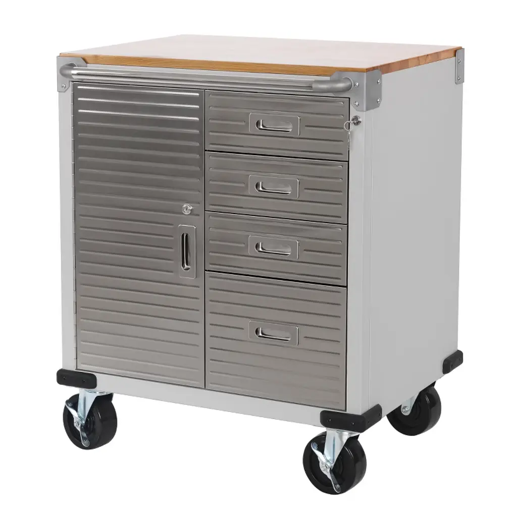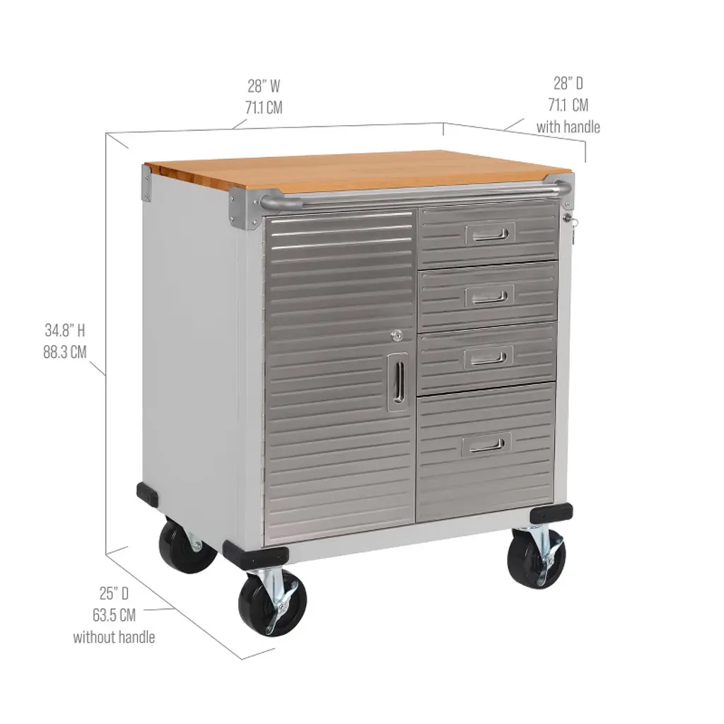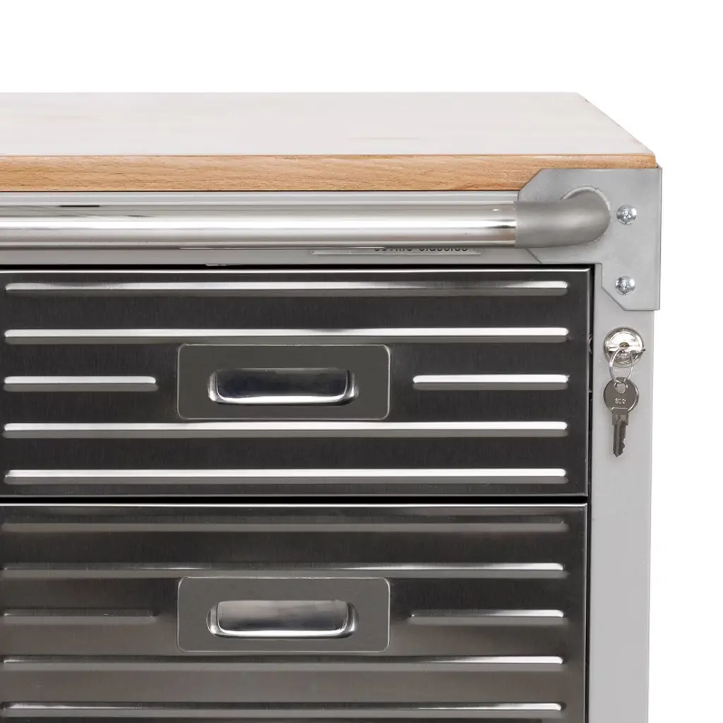 Utility and mobility come together in Seville Classics UltraHD 4-Drawer Rolling Cabinet. Our cabinet is engineered for heavy-duty use with a body constructed of ribbed, commercial-grade steel. The 3/4" solid hardwood top is intended for use as a work surface for everyone from home mechanics to professional tradesmen. Control the cabinet while it's on the move with the thick tubular handle finished in chrome. Black polycarbonate bumpers protect the corners while the cart is in motion, and helps keep your workshop safe while is stopped. It's the perfect multipurpose cabinet for businesses and homes alike.