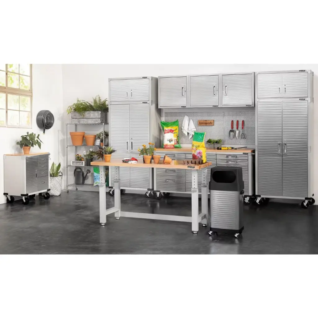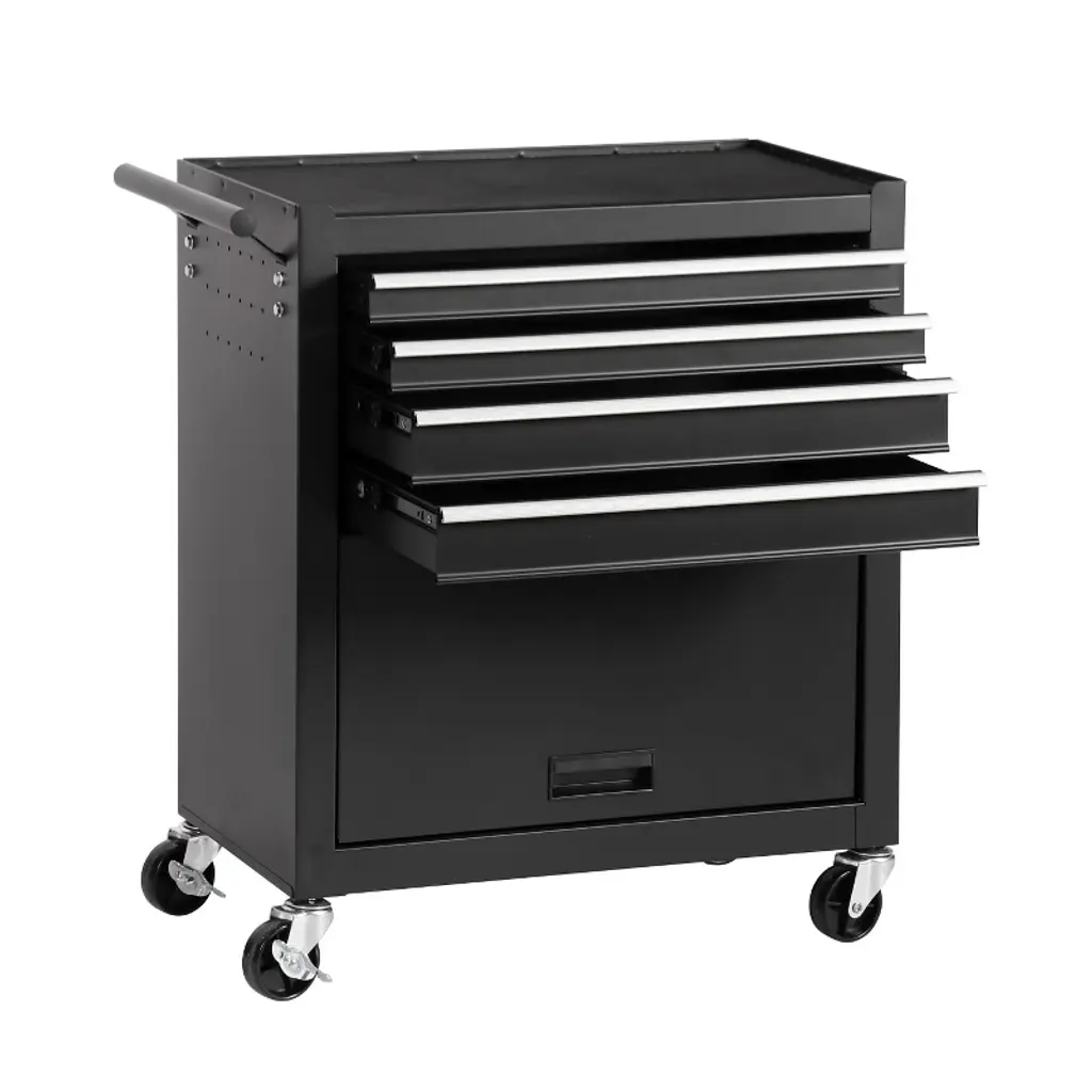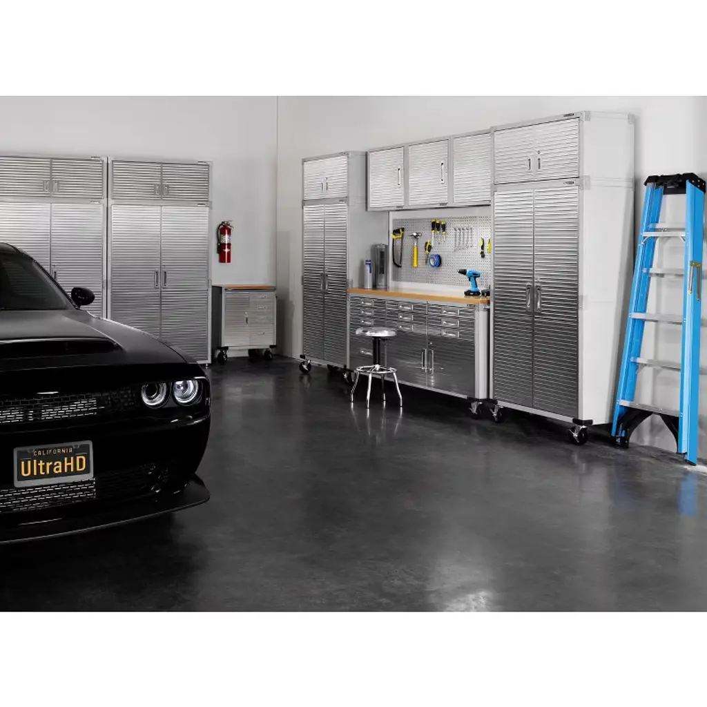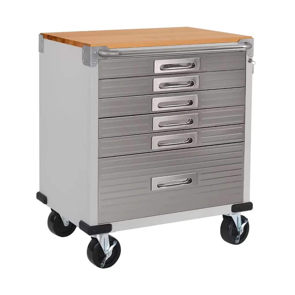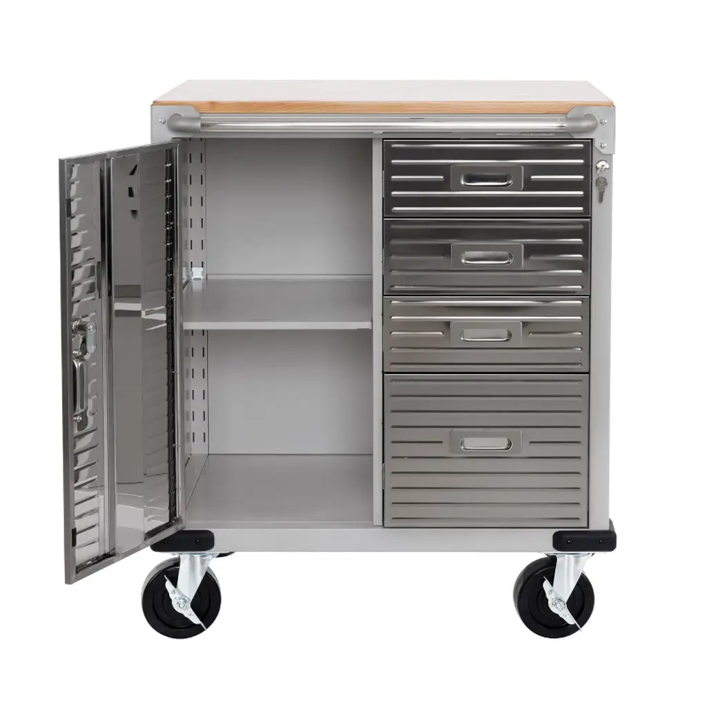 Utility and mobility come together in Seville Classics UltraHD 4-Drawer Rolling Cabinet. Our cabinet is engineered for heavy-duty use with a body constructed of ribbed, commercial-grade steel. The 3/4" solid hardwood top is intended for use as a work surface for everyone from home mechanics to professional tradesmen. Control the cabinet while it's on the move with the thick tubular handle finished in chrome. Black polycarbonate bumpers protect the corners while the cart is in motion, and helps keep your workshop safe while is stopped. It's the perfect multipurpose cabinet for businesses and homes alike.