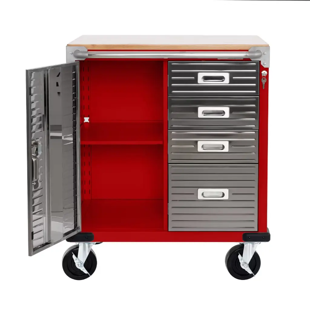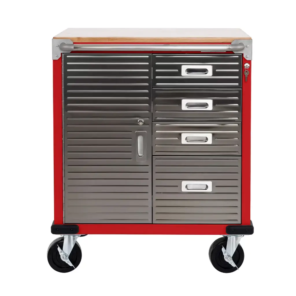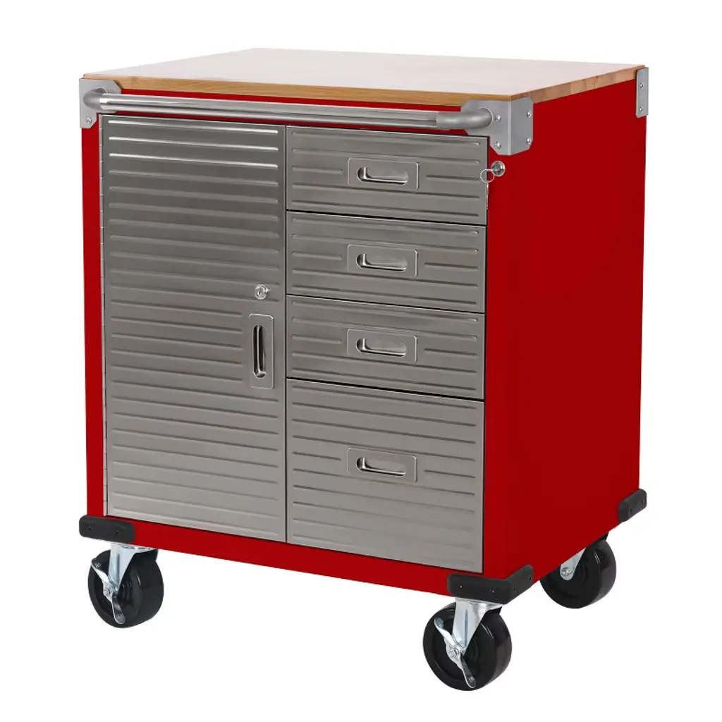 Utility and mobility come together in Seville Classics UltraHD 4-Drawer Rolling Cabinet. Our cabinet is engineered for heavy-duty use with a body constructed of ribbed, commercial-grade steel. The 3/4" solid hardwood top is intended for use as a work surface for everyone from home mechanics to professional tradesmen. Control the cabinet while it's on the move with the thick tubular handle finished in chrome. Black polycarbonate bumpers protect the corners while the cart is in motion, and helps keep your workshop safe while is stopped. It's the perfect multipurpose cabinet for businesses and homes alike.