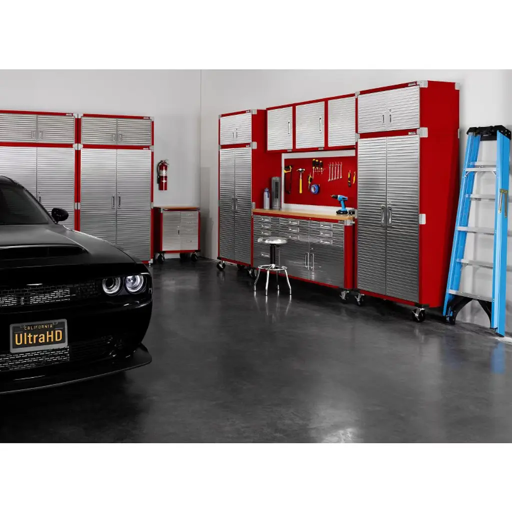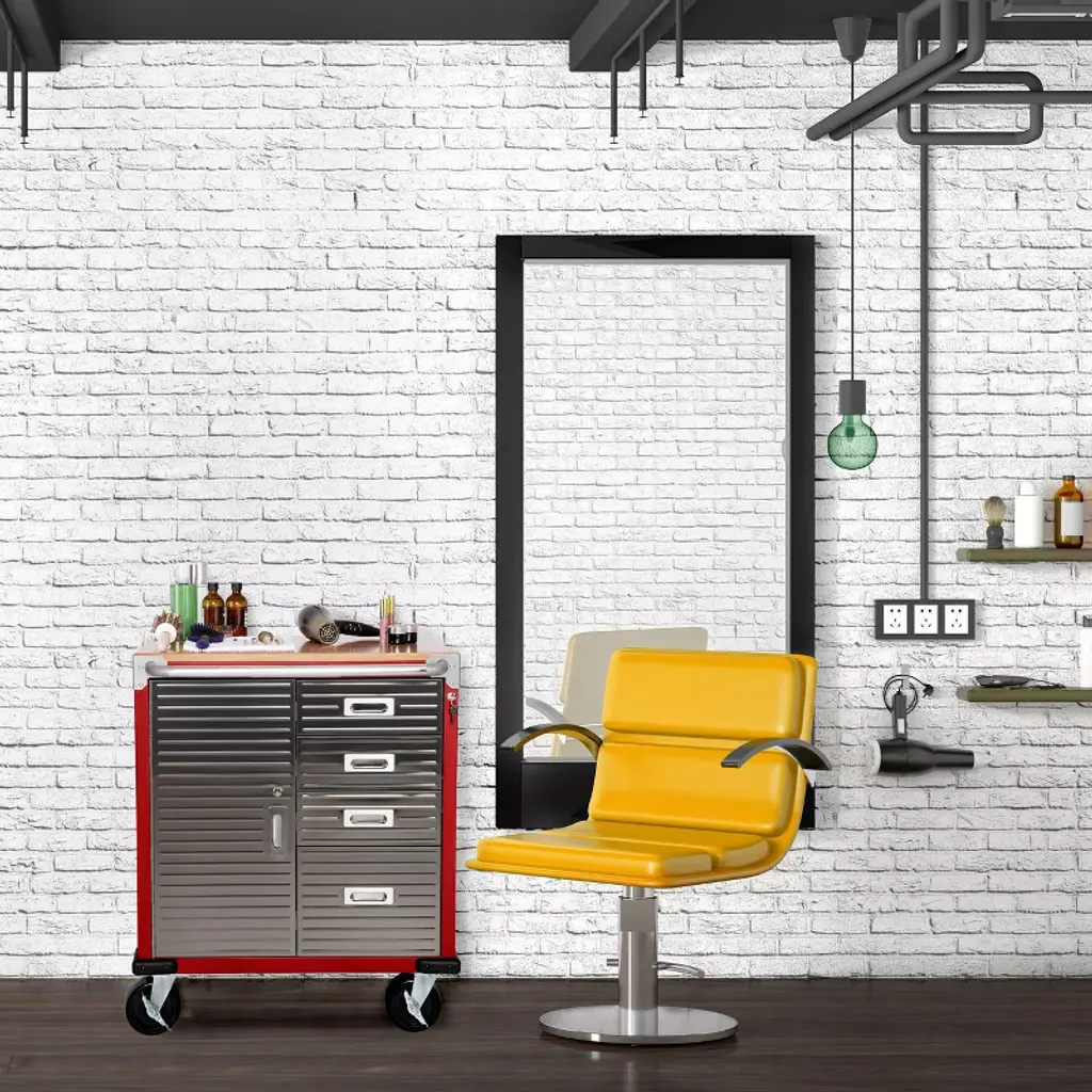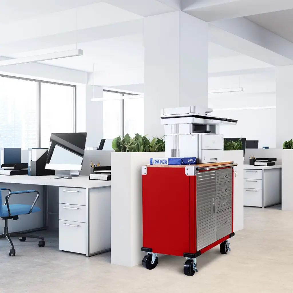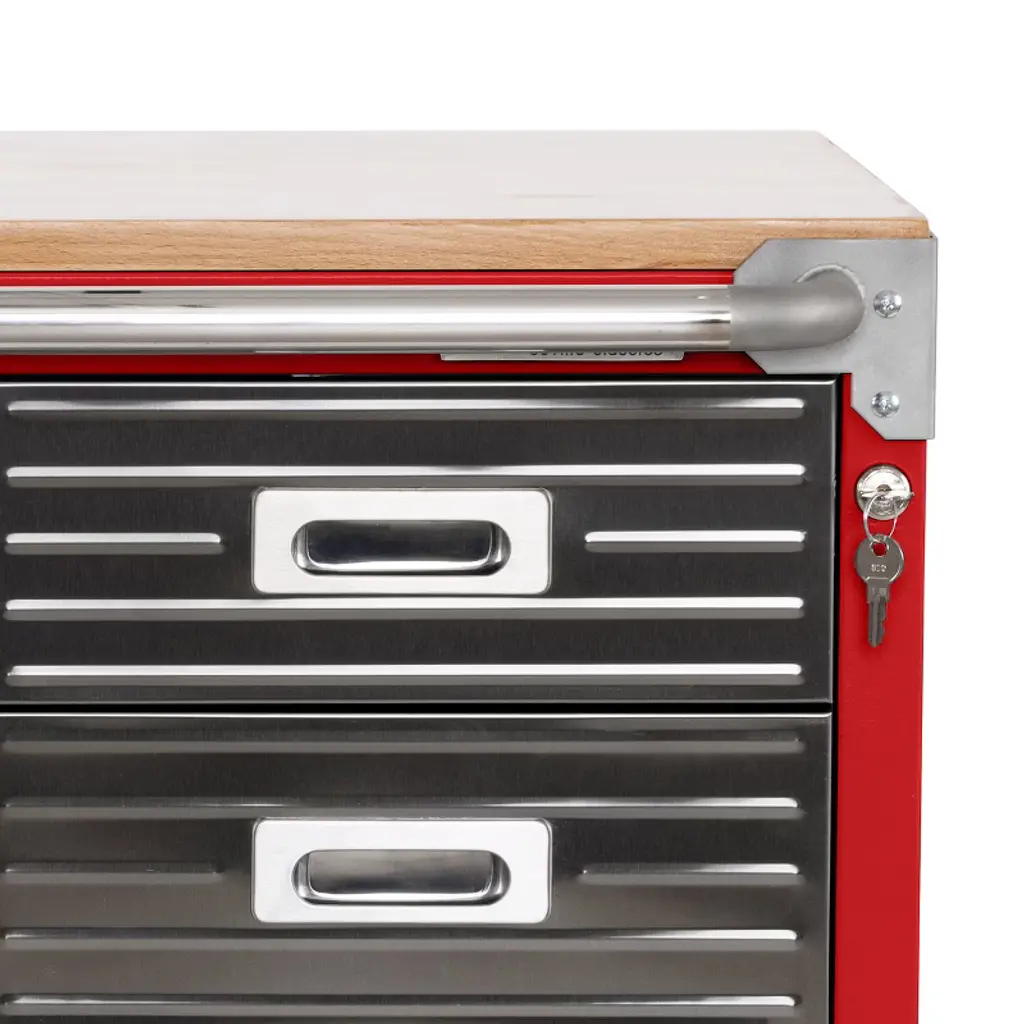 Utility and mobility come together in Seville Classics UltraHD 4-Drawer Rolling Cabinet. Our cabinet is engineered for heavy-duty use with a body constructed of ribbed, commercial-grade steel. The 3/4" solid hardwood top is intended for use as a work surface for everyone from home mechanics to professional tradesmen. Control the cabinet while it's on the move with the thick tubular handle finished in chrome. Black polycarbonate bumpers protect the corners while the cart is in motion, and helps keep your workshop safe while is stopped. It's the perfect multipurpose cabinet for businesses and homes alike.