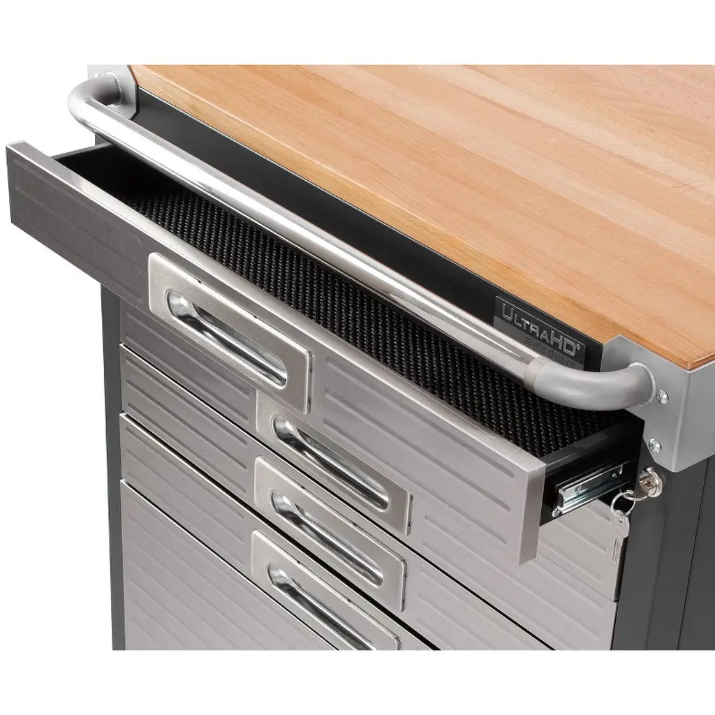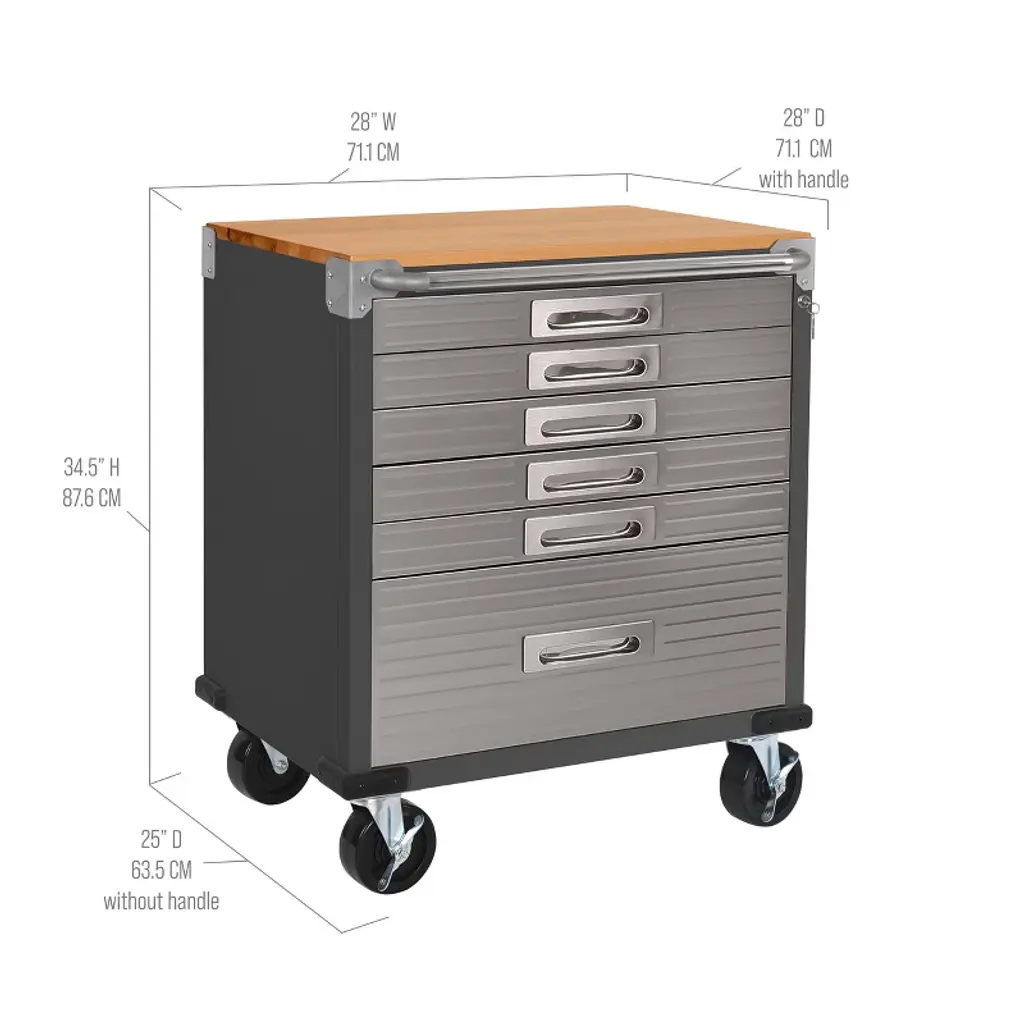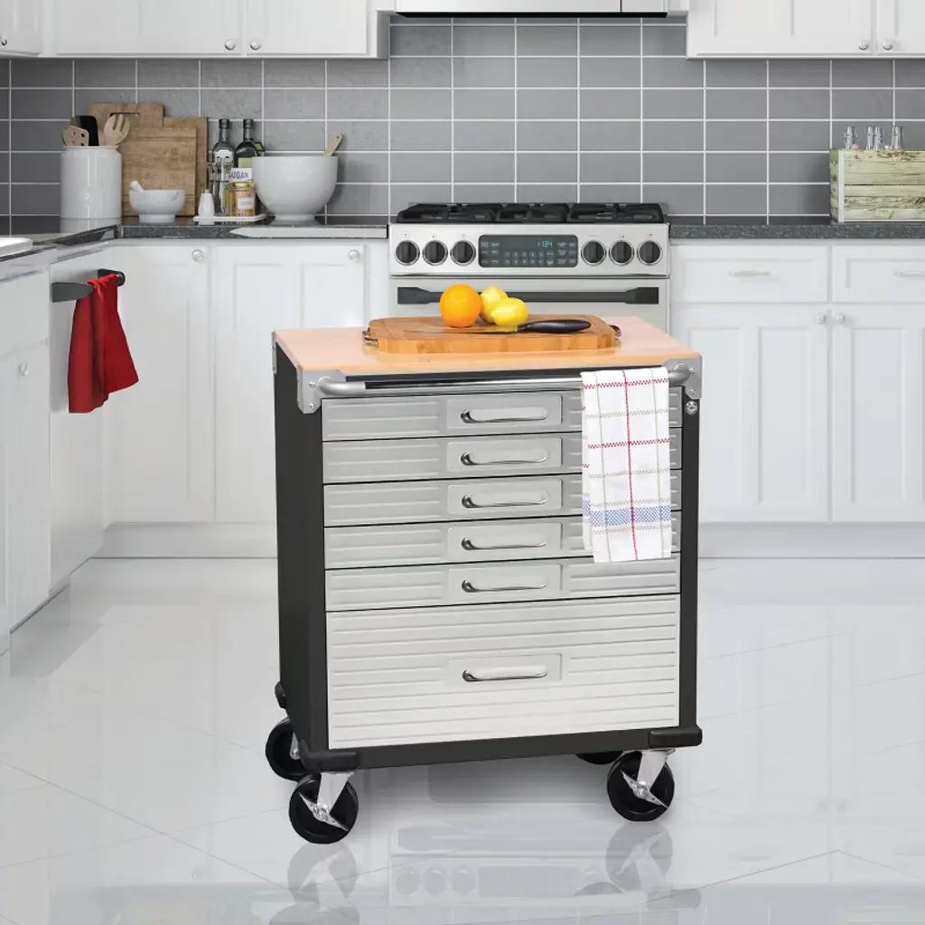 Utility and mobility come together in Seville Classics UltraHD 6-Drawer Rolling Cabinet. Our rolling cabinet is engineered for heavy-duty use with a body constructed of commercial-grade steel. The body is finished in a durable powder-coat finish for long lasting protection. The 3/4" solid hardwood top is intended for use as a work surface for everyone from home mechanics to professional tradesmen. Control the rolling cabinet while it's on the move with the thick tubular handle finished in chrome. Black polycarbonate bumpers protect the corners while the cart is in motion and helps keep your workshop safe while is stopped. It's the perfect multipurpose rolling cabinet for offices, warehouses, store rooms, and for use around the house.