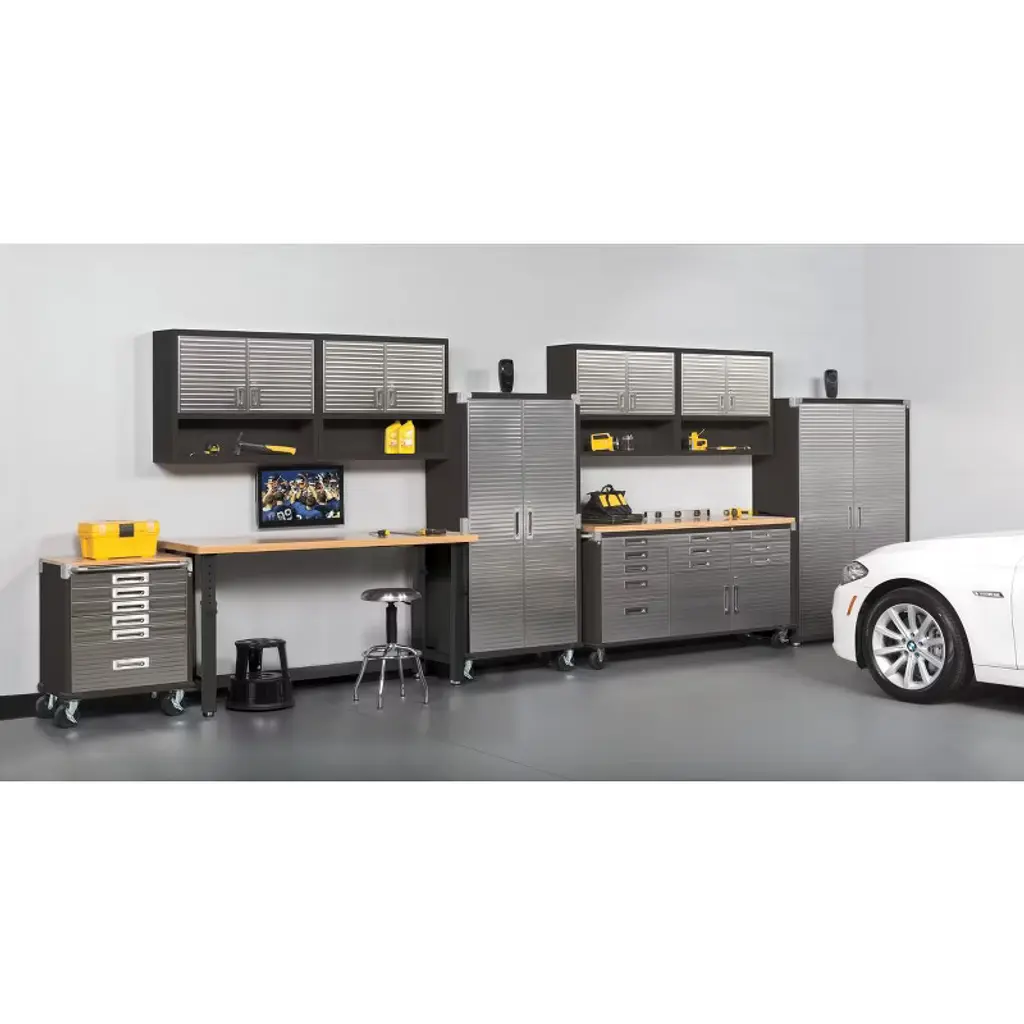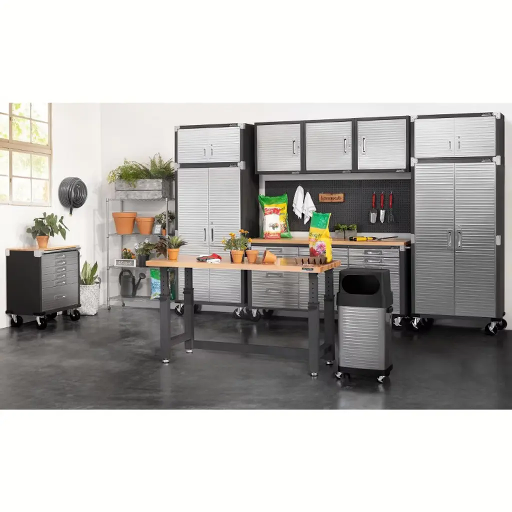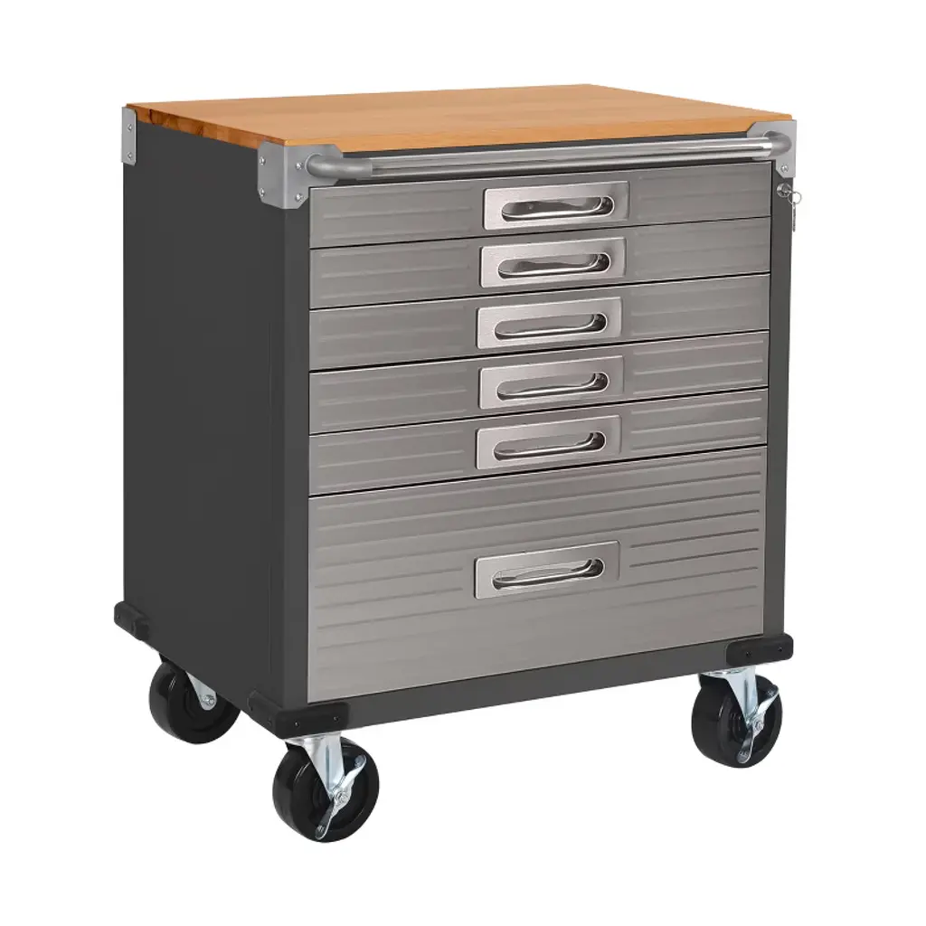 Utility and mobility come together in Seville Classics UltraHD 6-Drawer Rolling Cabinet. Our rolling cabinet is engineered for heavy-duty use with a body constructed of commercial-grade steel. The body is finished in a durable powder-coat finish for long lasting protection. The 3/4" solid hardwood top is intended for use as a work surface for everyone from home mechanics to professional tradesmen. Control the rolling cabinet while it's on the move with the thick tubular handle finished in chrome. Black polycarbonate bumpers protect the corners while the cart is in motion and helps keep your workshop safe while is stopped. It's the perfect multipurpose rolling cabinet for offices, warehouses, store rooms, and for use around the house.