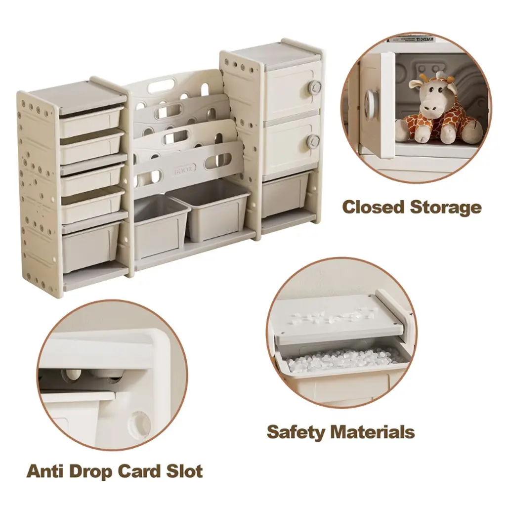 SEVOBAL kids toy storage organizer combines 8 removable bins, 4-tier book organizers, and 2 cabinets, making it ideal for playrooms, bedrooms, and kids' rooms. It helps children learn to organize items, saves space, and is easy to clean. With multi-functional storage and a safe design, it keeps kids' spaces tidy and kid-friendly.