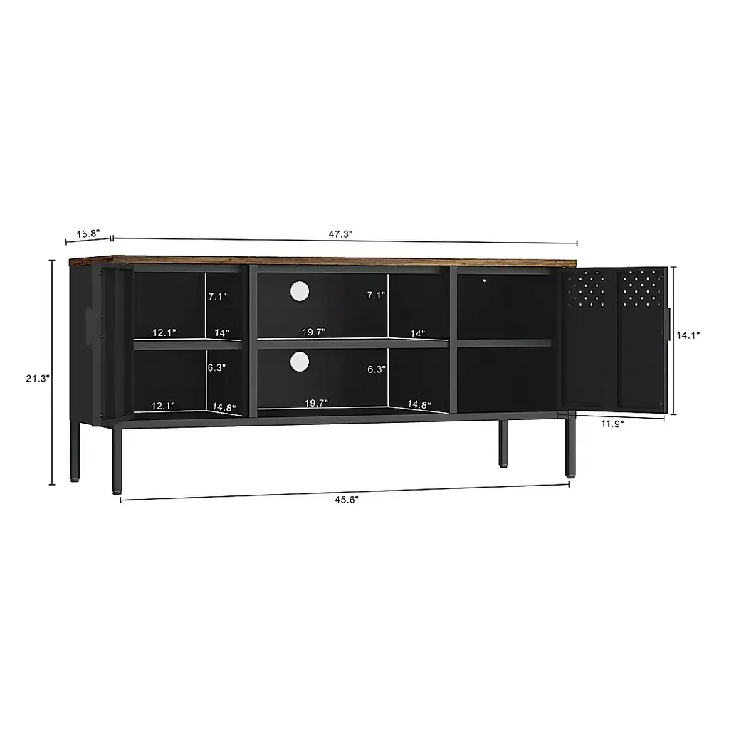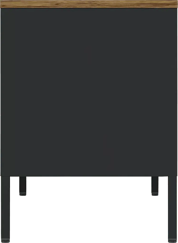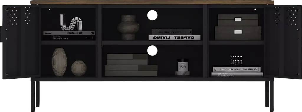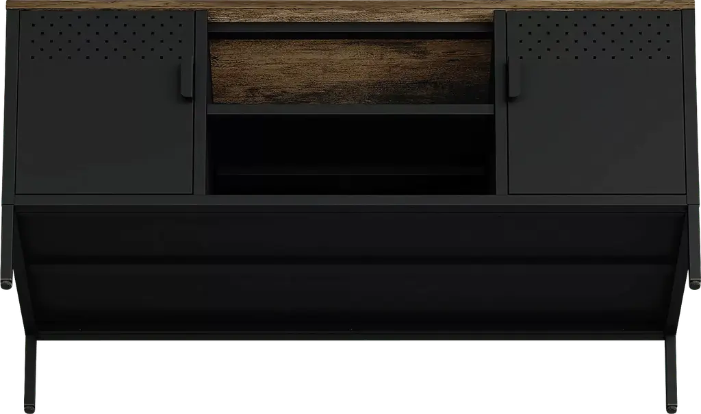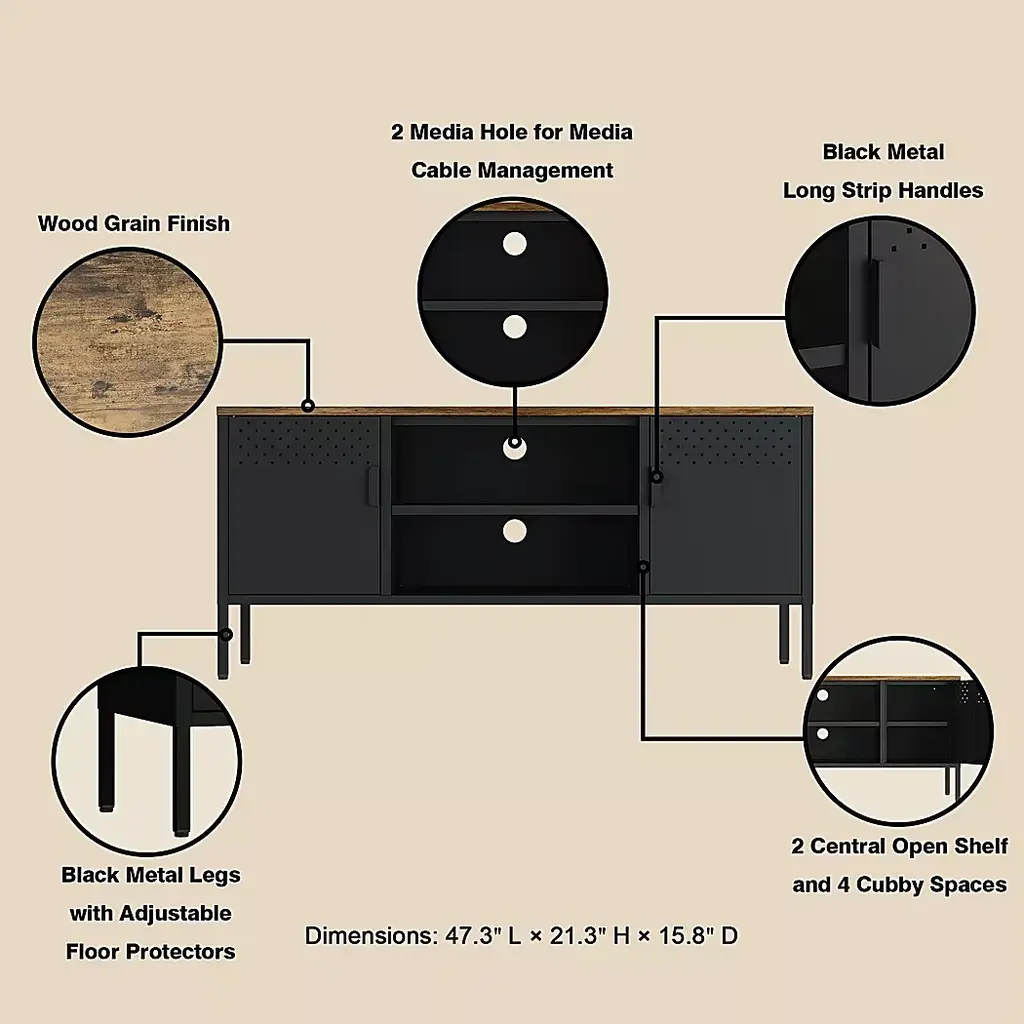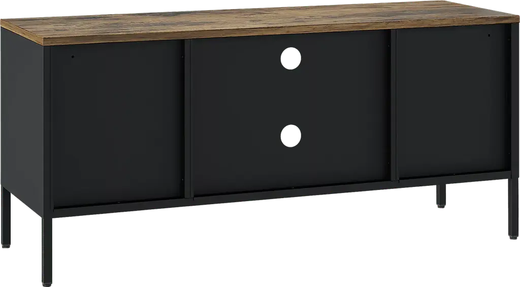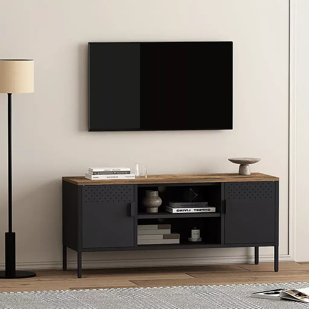 The Shadoworks black console is where rustic charm meets modern sophistication, creating the perfect centerpiece for your living space. With its sleek metal cabinetry and warm, natural wood top, this piece blends seamlessly into any decor style, offering both beauty and functionality. The console features ample storage and a clean, minimalistic design, making it an ideal choice for organizing your media essentials while elevating your home's aesthetic. Whether you're hosting movie nights or simply relaxing, the Shadoworks adds an elegant touch to your entertainment area. Customer assembly is required.