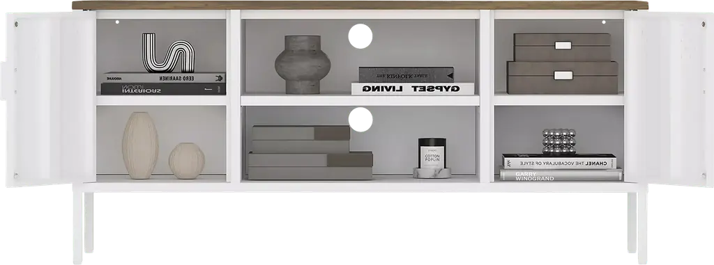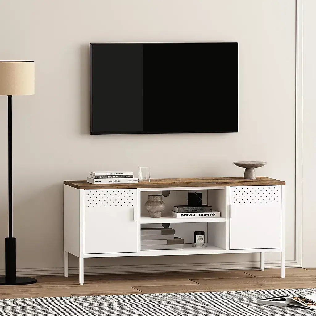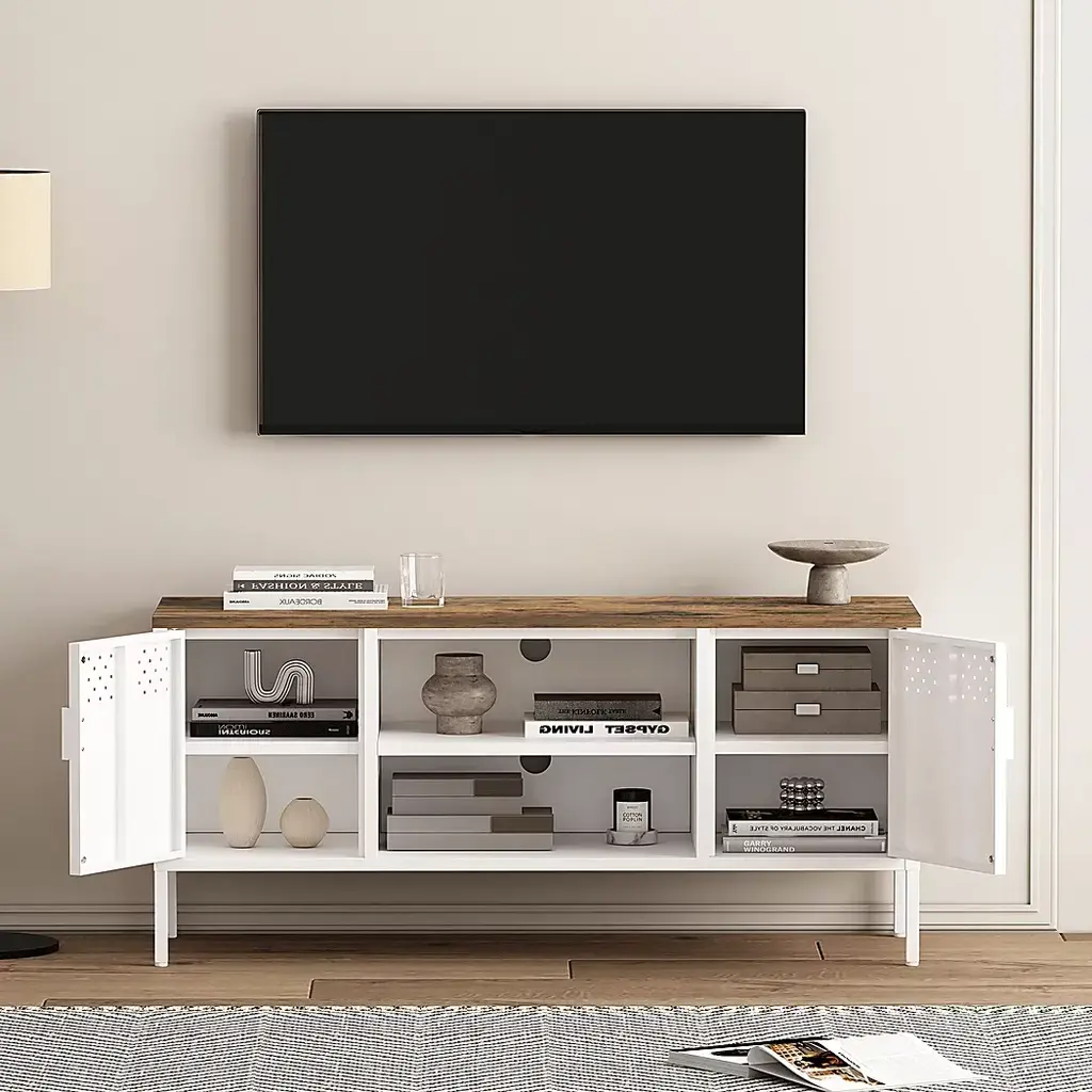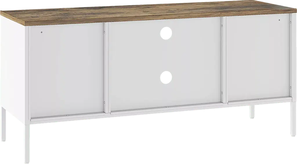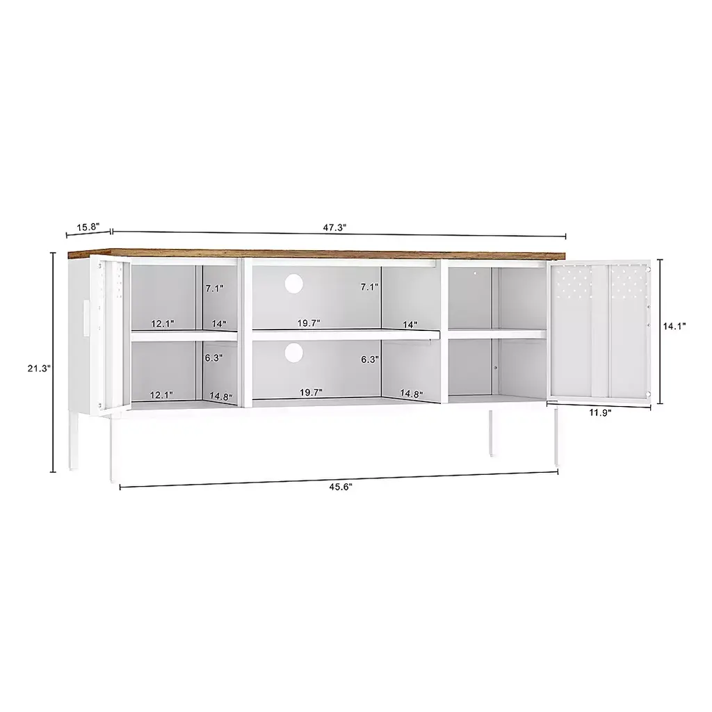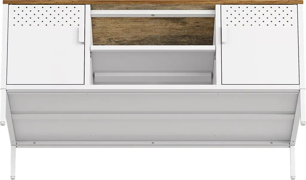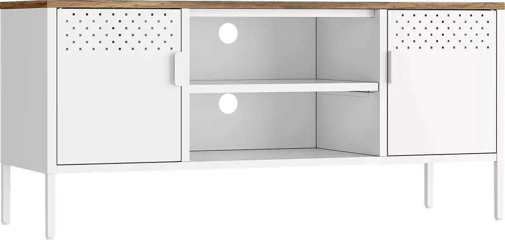 The Shadoworks white console is where rustic charm meets modern sophistication, creating the perfect centerpiece for your living space. With its sleek metal cabinetry and warm, natural wood top, this piece blends seamlessly into any decor style, offering both beauty and functionality. The console features ample storage and a clean, minimalistic design, making it an ideal choice for organizing your media essentials while elevating your home's aesthetic. Whether you're hosting movie nights or simply relaxing, the Shadoworks adds an elegant touch to your entertainment area. Customer assembly is required.