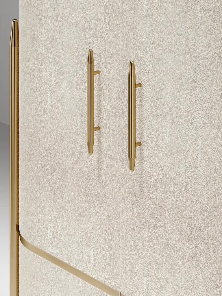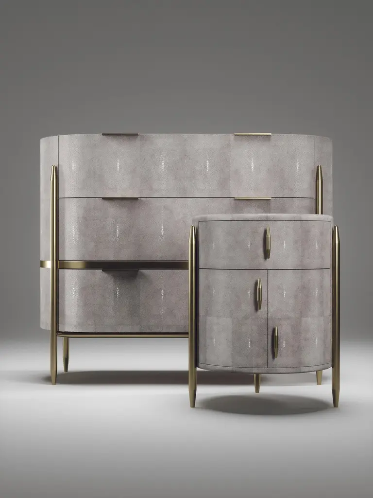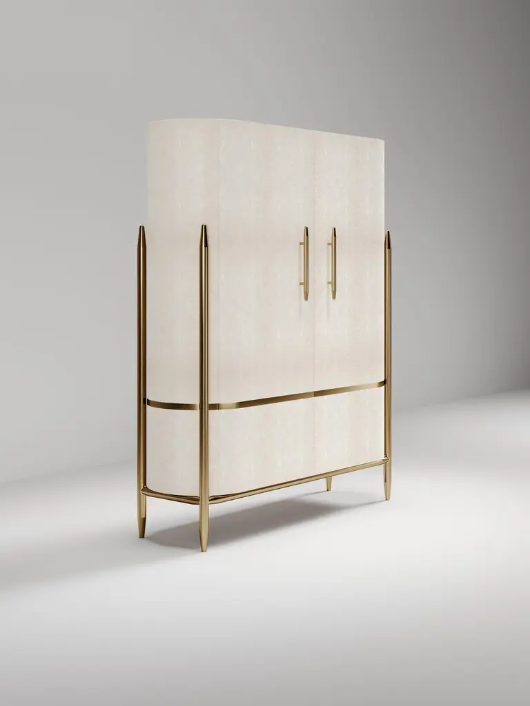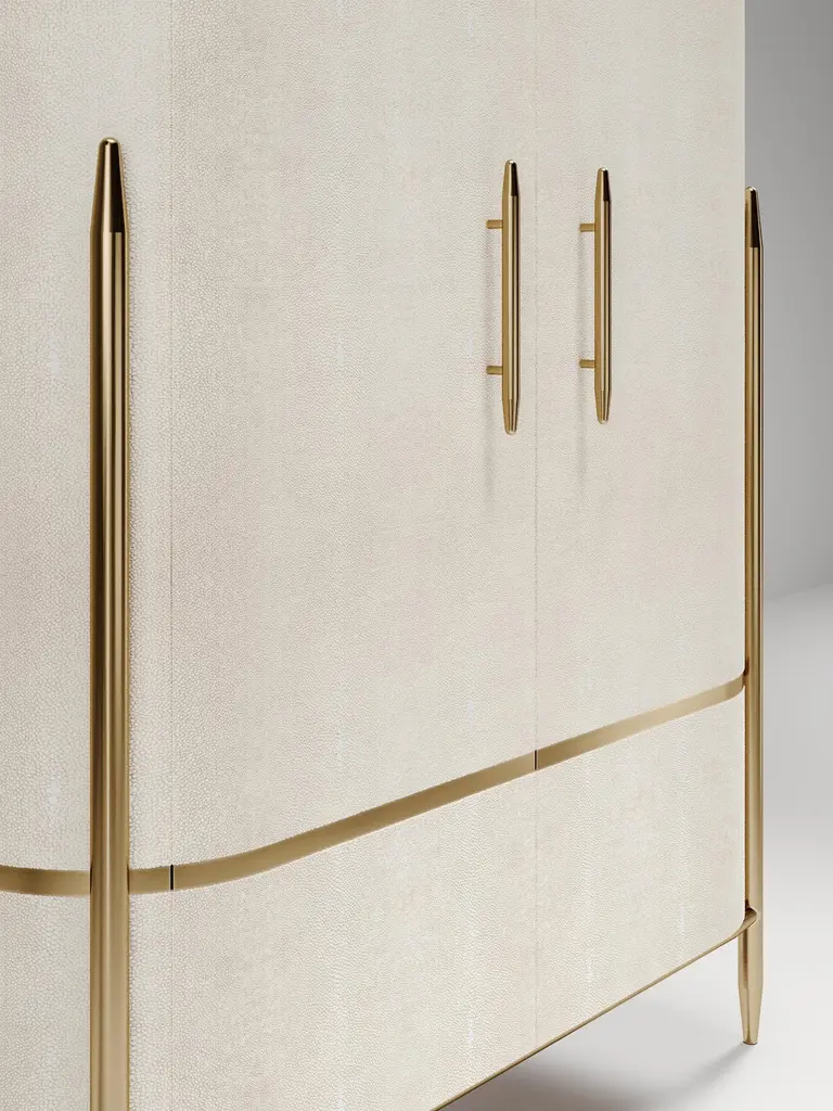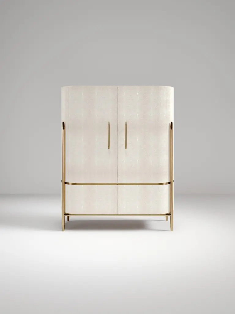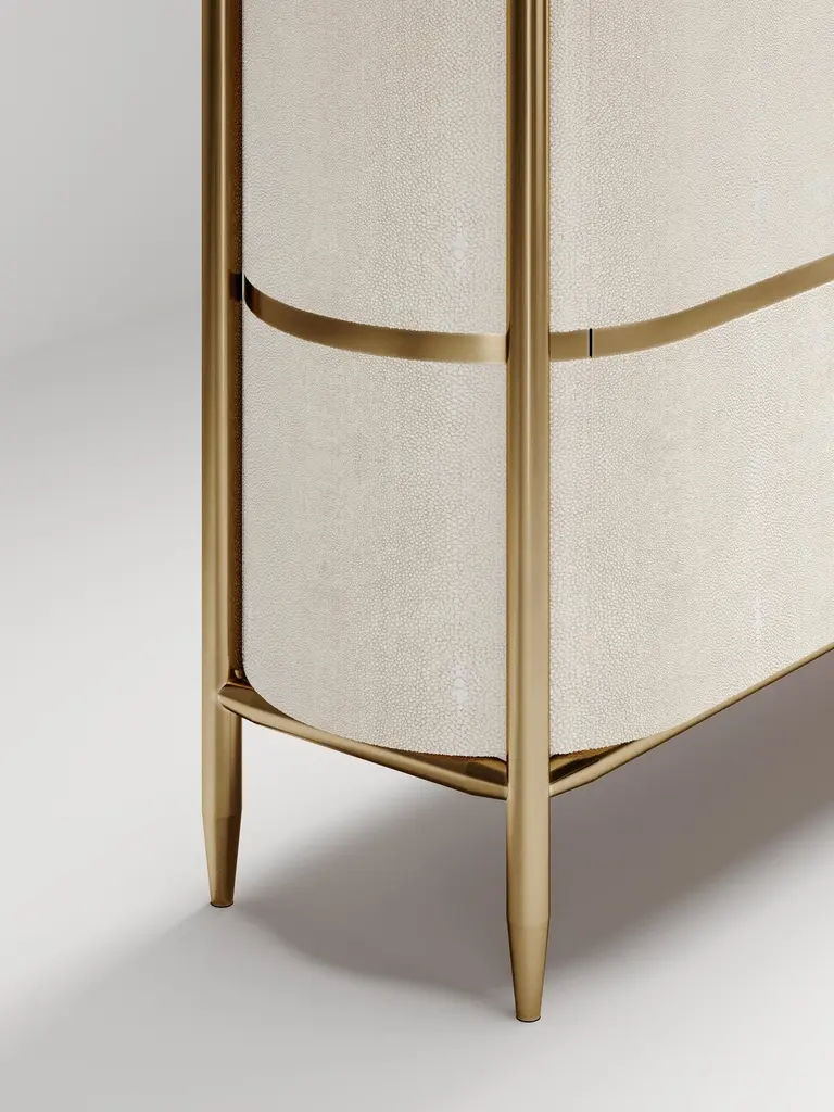The Paris based label has distinguished themselves since their launch, with their iconic use of shagreen mixed with brass and other exotic materials. All furniture is handcrafted by skilled artisans, ultimately making each piece unique, designed in Paris and produced in the Philippines.The Dandy Oval Cabinet by Kifu Paris is an elegant and a luxurious home accent, inlaid in cream shagreen with bronze-patina brass details. This piece includes 2 drawers total and 4 shelves. The interiors are inlaid in gemelina wood veneer. Available as chest of drawers versions and as bedside tables; see images at end of slide. This piece is designed by Kifu Augousti, the daughter of Ria and Yiouri Augousti. Custom sizing/finishing available on request.All shagreen pieces are hand-dyed by artisans.The dimensions of this piece are 130 x 45 x 160 cmAll Kifu Paris pieces are handmade by artisans, ultimately making each piece unique. Custom color or sizing available on request. Wipe clean with soft dry cloth.Although inspired by her parents, her collection of home accessories and furniture is a distinct identity of its own. Kifu uses handmade techniques of elaborate inlay patterns of shagreen, shells, semi-precious stones, materials she experienced as a child growing up in her parent’s studio, but interpreted in a younger quirkier way reflecting her youth. From her "jewelry inspired knobs" on decorative boxes, gold bar boxes and an extravagant inlay pattern mix of shagreen and shell inspired by galactic constellations, as seen on her enormous round mirror is refreshing to see. Kifu embodies whimsical elements throughout her collection and is not afraid to be daring and unexpected in her approach to design.All shagreen-covered items should be kept out of direct sunlight, color variants may occur on the stingray and other exotic finishes, but this showcases the Parisian label's commitment to creating authentic luxurious products using natural components.For all pieces inlaid with stone and semi-precious stones, due to the natural quality of the material color tonality and pattern placement may differ slightly per piece.