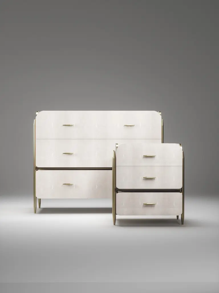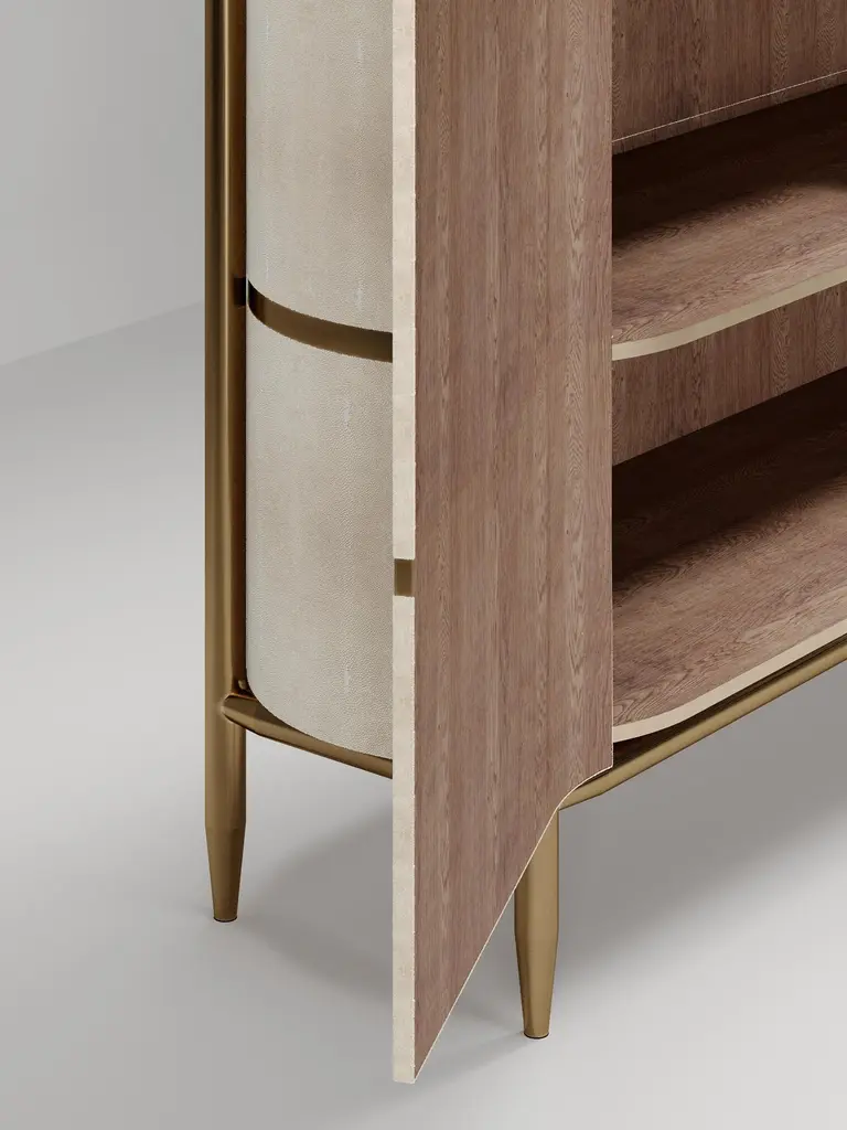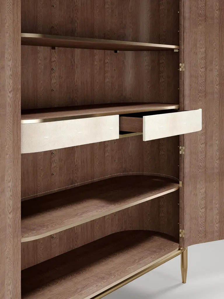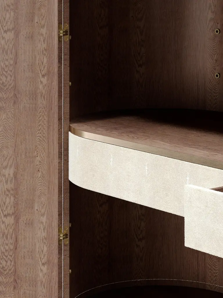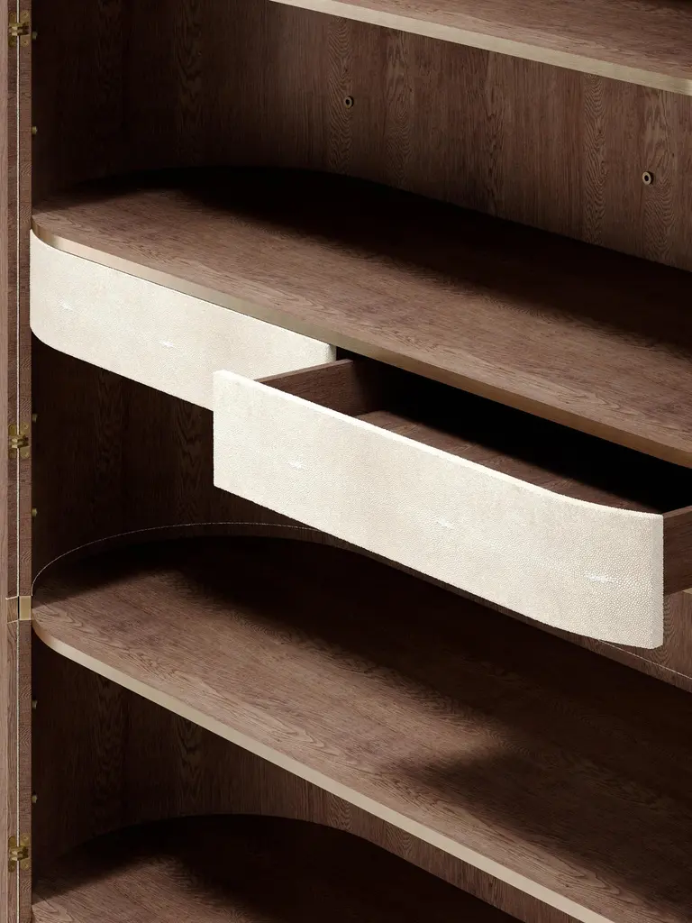 The Paris based label has distinguished themselves since their launch, with their iconic use of shagreen mixed with brass and other exotic materials. All furniture is handcrafted by skilled artisans, ultimately making each piece unique, designed in Paris and produced in the Philippines.The Dandy Oval Cabinet by Kifu Paris is an elegant and a luxurious home accent, inlaid in cream shagreen with bronze-patina brass details. This piece includes 2 drawers total and 4 shelves. The interiors are inlaid in gemelina wood veneer. Available as chest of drawers versions and as bedside tables; see images at end of slide. This piece is designed by Kifu Augousti, the daughter of Ria and Yiouri Augousti. Custom sizing/finishing available on request.All shagreen pieces are hand-dyed by artisans.The dimensions of this piece are 130 x 45 x 160 cmAll Kifu Paris pieces are handmade by artisans, ultimately making each piece unique. Custom color or sizing available on request. Wipe clean with soft dry cloth.Although inspired by her parents, her collection of home accessories and furniture is a distinct identity of its own. Kifu uses handmade techniques of elaborate inlay patterns of shagreen, shells, semi-precious stones, materials she experienced as a child growing up in her parent’s studio, but interpreted in a younger quirkier way reflecting her youth. From her "jewelry inspired knobs" on decorative boxes, gold bar boxes and an extravagant inlay pattern mix of shagreen and shell inspired by galactic constellations, as seen on her enormous round mirror is refreshing to see. Kifu embodies whimsical elements throughout her collection and is not afraid to be daring and unexpected in her approach to design.All shagreen-covered items should be kept out of direct sunlight, color variants may occur on the stingray and other exotic finishes, but this showcases the Parisian label's commitment to creating authentic luxurious products using natural components.For all pieces inlaid with stone and semi-precious stones, due to the natural quality of the material color tonality and pattern placement may differ slightly per piece.
