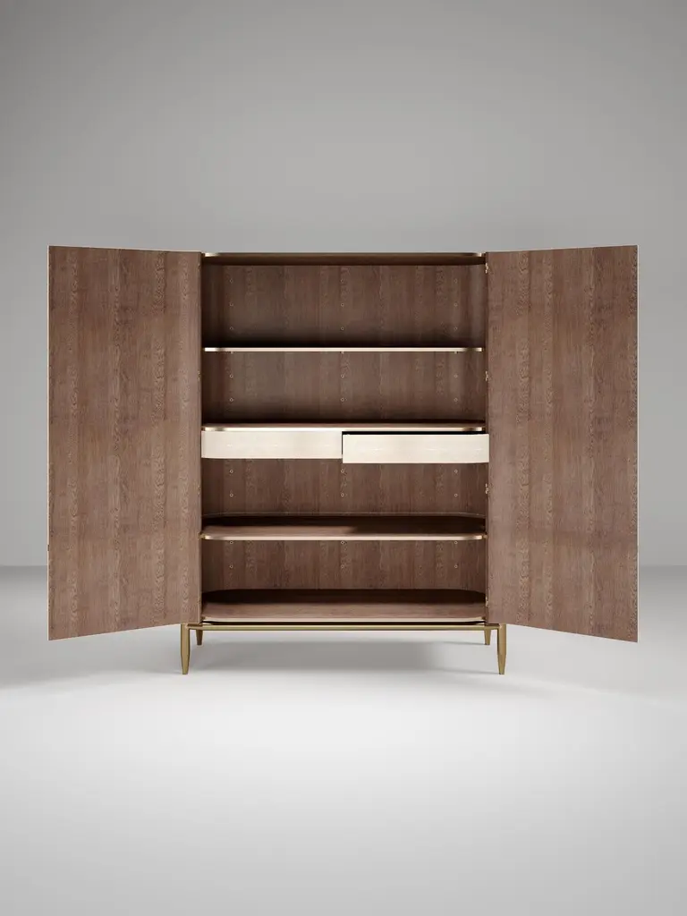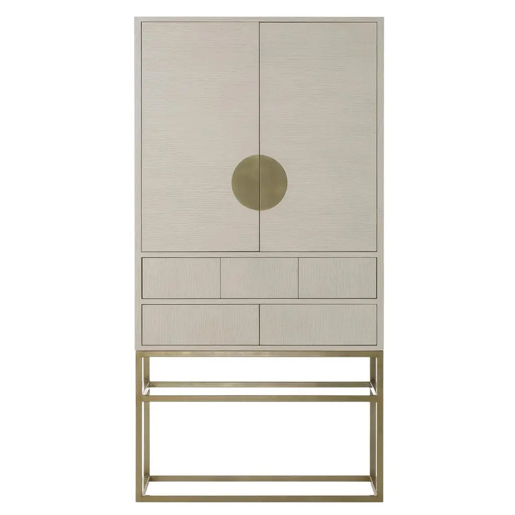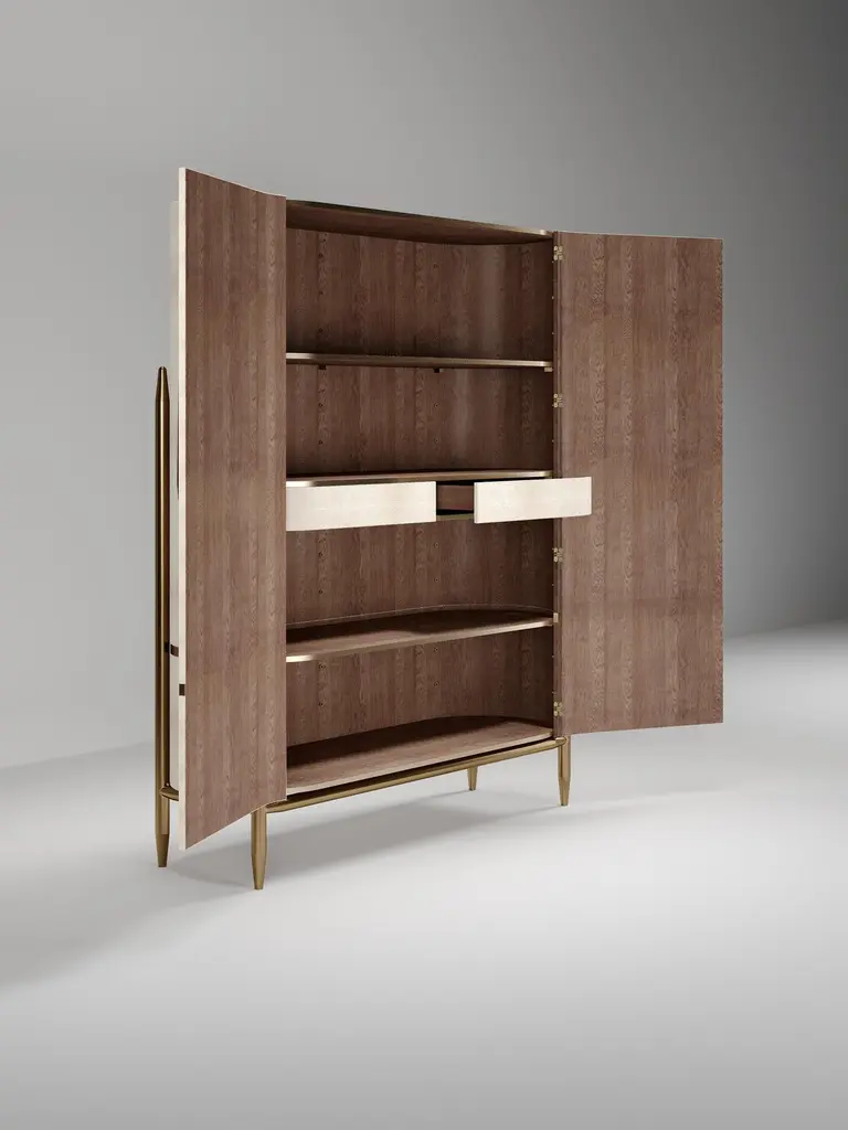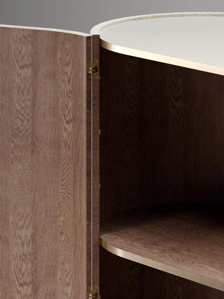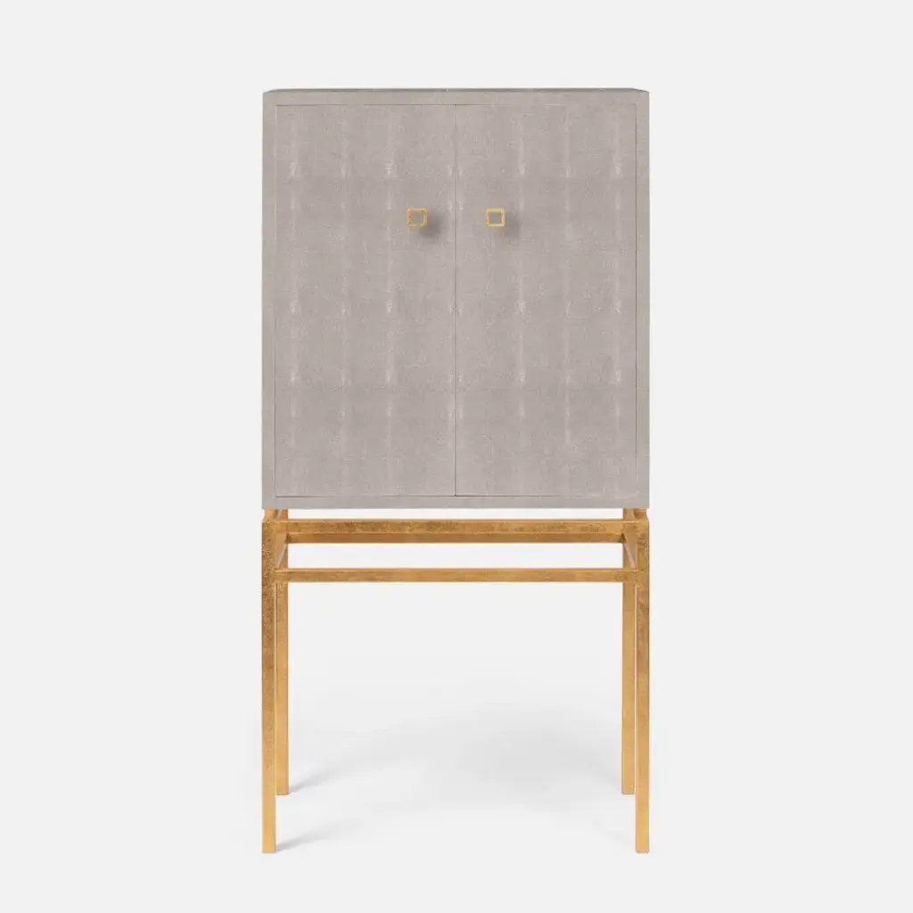 The Paris based label has distinguished themselves since their launch, with their iconic use of shagreen mixed with brass and other exotic materials. All furniture is handcrafted by skilled artisans, ultimately making each piece unique, designed in Paris and produced in the Philippines.The Dandy Oval Cabinet by Kifu Paris is an elegant and a luxurious home accent, inlaid in cream shagreen with bronze-patina brass details. This piece includes 2 drawers total and 4 shelves. The interiors are inlaid in gemelina wood veneer. Available as chest of drawers versions and as bedside tables; see images at end of slide. This piece is designed by Kifu Augousti, the daughter of Ria and Yiouri Augousti. Custom sizing/finishing available on request.All shagreen pieces are hand-dyed by artisans.The dimensions of this piece are 130 x 45 x 160 cmAll Kifu Paris pieces are handmade by artisans, ultimately making each piece unique. Custom color or sizing available on request. Wipe clean with soft dry cloth.Although inspired by her parents, her collection of home accessories and furniture is a distinct identity of its own. Kifu uses handmade techniques of elaborate inlay patterns of shagreen, shells, semi-precious stones, materials she experienced as a child growing up in her parent’s studio, but interpreted in a younger quirkier way reflecting her youth. From her "jewelry inspired knobs" on decorative boxes, gold bar boxes and an extravagant inlay pattern mix of shagreen and shell inspired by galactic constellations, as seen on her enormous round mirror is refreshing to see. Kifu embodies whimsical elements throughout her collection and is not afraid to be daring and unexpected in her approach to design.All shagreen-covered items should be kept out of direct sunlight, color variants may occur on the stingray and other exotic finishes, but this showcases the Parisian label's commitment to creating authentic luxurious products using natural components.For all pieces inlaid with stone and semi-precious stones, due to the natural quality of the material color tonality and pattern placement may differ slightly per piece.
