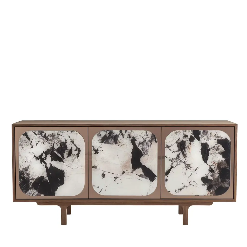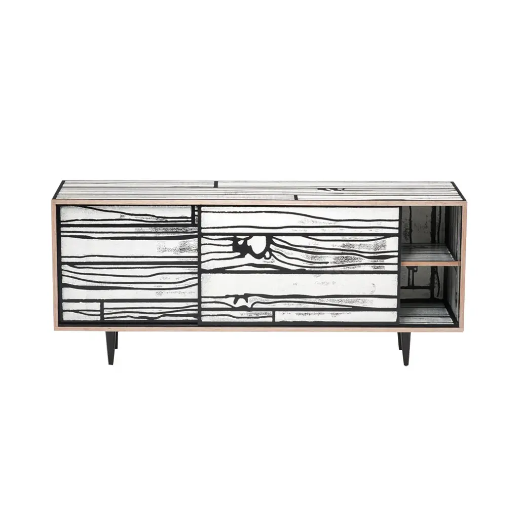 SHARP DRESSER CR-1A: Sideboard with n° 2 doors with n° 4 glass shelves. Made with mdf structure with matt lacquered interior. External finish and doors: matt lacquered, matt lacquered and printed mortar, covered with glass fiber printed fabric, directly printed with glossy lacquer with extra-gloss finish. Protective finish: non-toxic opaque and extra-gloss gloss.Including hardware for push pull opening.The price refers to the configuration shown in the picture.Available feet:- PH-3MBasement in lacquered metal in the colors: white, black, bronze, brass and matching lacquered finishing caps. Including leveling feet.- FO-3CCylindrical feet in powder coated metal in the colors: white, black, bronze and brass. Including leveling feet.- CO-3VBase composed of cylindrical feet in powder coated metal in the black colour and cover panel in mdf. External cover finishing in: matt lacquered, matt lacquered and printed mortar, covered with fibreglass printed fabric, direct printing gloss lacquered with extra-gloss finish. Including leveling feet.Handles avaible- RO-1V (Ø 10)Metal ball handle handmade with finish colors: gold and nickel. Possibility of inserting n °1 handle for single door.- RO-2V (L/W 10 x A/H 10)Metal square handle handmade with finish colors: gold and nickel. Possibility of inserting n °1 handle for single door.Momenti's Home & Contract collection offers a wide range of furniture products and accessories, all customizable. Each product can be customized through the choice of various details such as different bases or handles to make it unique. It is possible to choose between 3 Collections which include 36 graphics designed specifically for the Home & Contract collection. The result is a unique product, a mix of art and design, enhanced by a selection of refined and hand-crafted materials.Our furniture is created with: - wooden particle panels created by the use of salvaged wooden material, thus avoiding the cutting of new trees. Low-formaldehyde glues have been used for this product. - composite alluminium alloy panel, with an interposed core of polyethylene, the simplest of the synthetic polymers and the most present in nature.The working process takes place in full respect of the current environmental regulations. Our compound is then applied to these supports, which is made of non-toxic, odor-free, water-repellent and easy to clean resins.