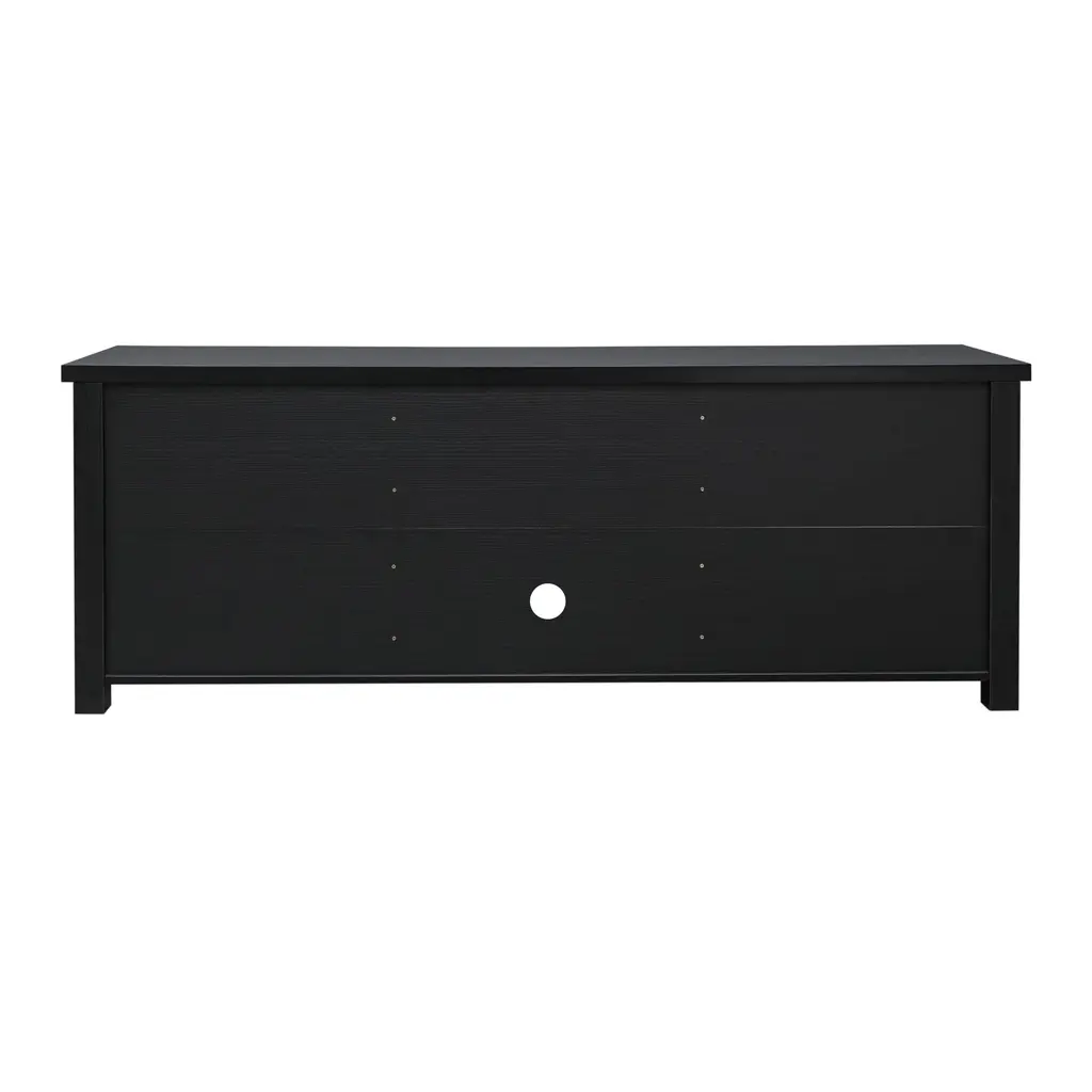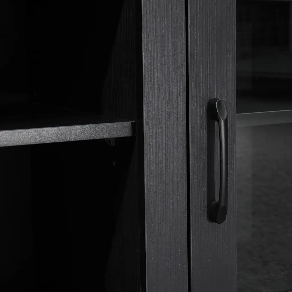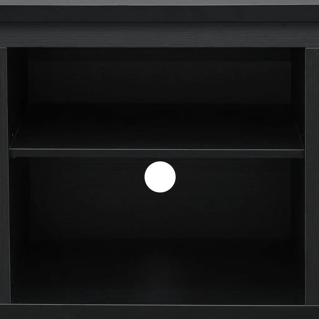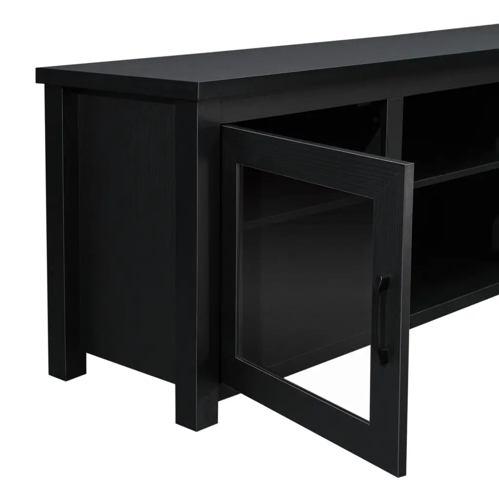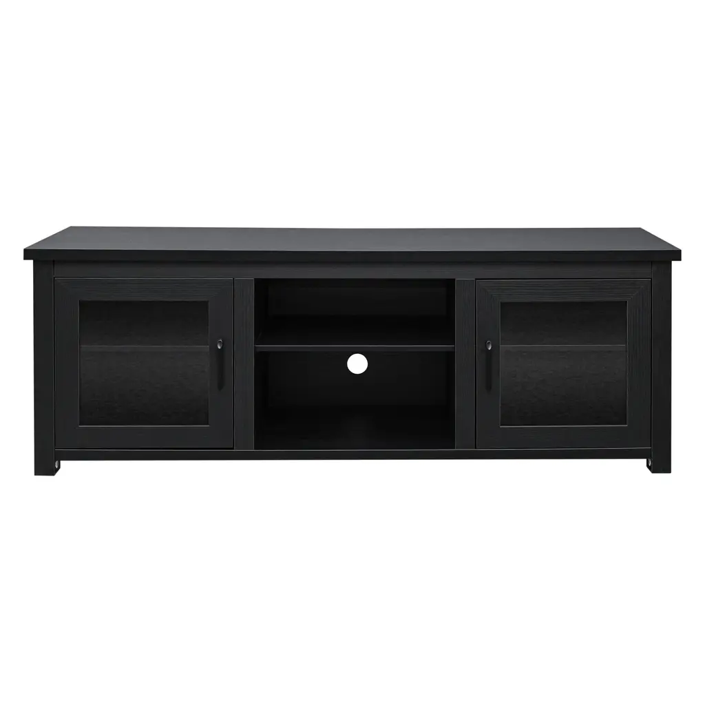 Refresh the look of your living space and add much needed storage with this on-trend TV stand for up to 80" TV's. This versatile engineered wood 3 shelf media console features glass fronted doors and a cord management port to keep your wires and cords tamed. Moving to a new home? Add the updated look of this media center in any room for an instant upgrade.When you're ready for a change of pace, mount your television on the wall above this entertainment center. Your soundbar, gaming console and other electronics will tuck neatly away behind the glass doors. The 65 inch top supports 200 lbs. static weight to keep your valuable possessions stable and safe. The height adjustable shelves hold up to 30 lbs. to accommodate your display items. DVD's, CD's or any other accessories can be stored in the side cabinets to show them off and keep them safe. Step-by-step illustrated instructions or online PDF allow you to assemble this TV console in under an hour. Fixed plastic floor glides protect your hard flooring surfaces from scuffs and scratches if bumped into. Furniture mover pads can be purchased to help move this unit with minimal effort. Wipe clean with water and dry cloth to keep this two door stand looking showroom new.