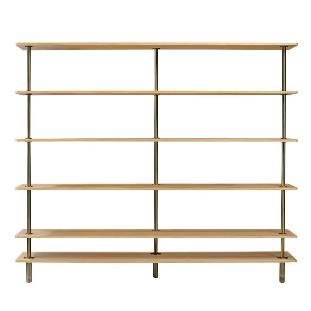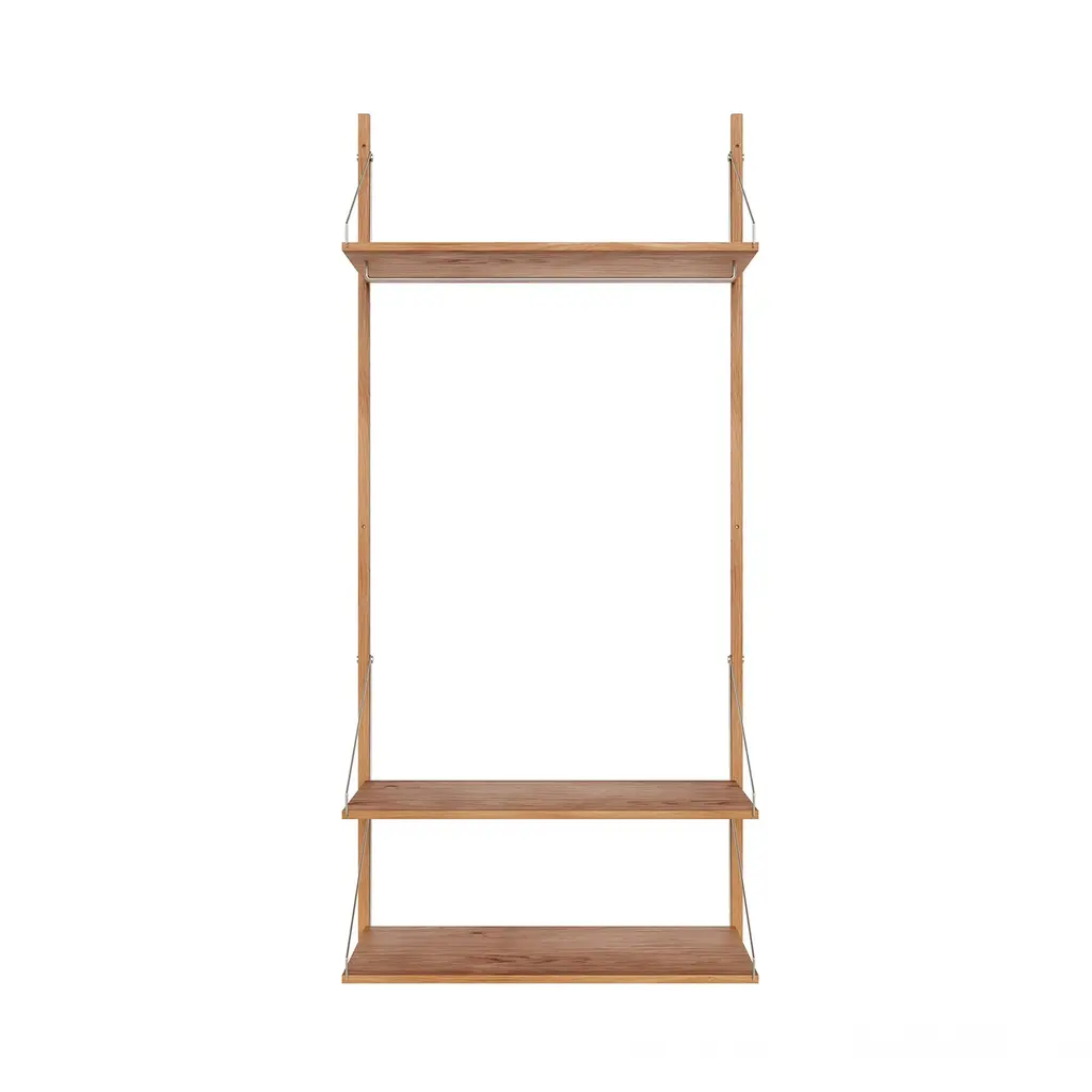 Frama's essential Shelf Library rethinks the tradition of Danish Modern wall storage in beautifully crafted solid oak. Made from durable and time-honored materials, designer Kim Richardt's modular system suits nearly any space, including the kitchen, bathroom, study and dressing areas. Easily fastened to the wall with wood rails and stainless steel screws, the units are available in 3 widths, a choice of heights and natural, white or dark oiled oak finishes. Each individual shelf holds up to 55 pounds (25 kg) and can be situated in a range of positions and the wall system can also be customized with a range of add-ons. Those seamlessly integrated options include high and low cabinets, a desk section which also works for larger items like record players, plants and art objects, and a wardrobe section with a convenient rail for hangers.
