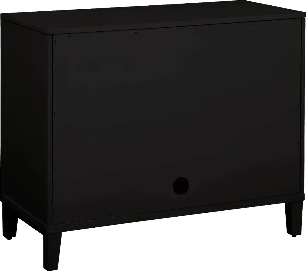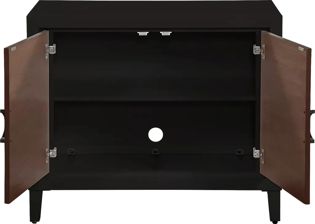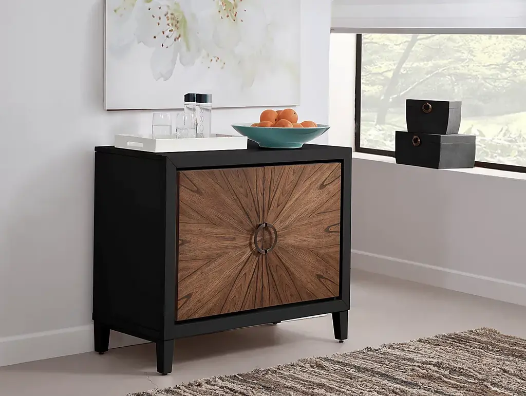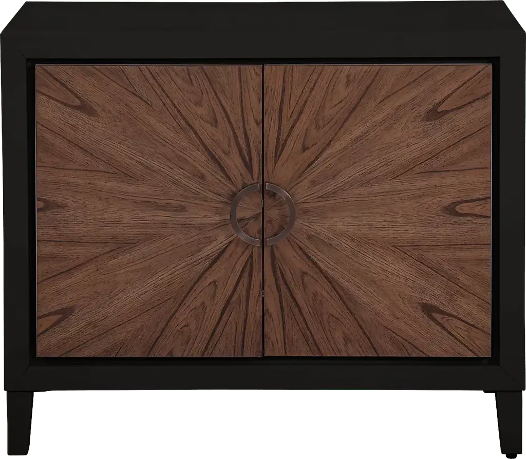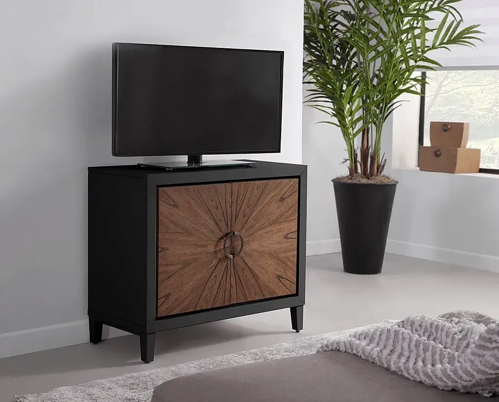 Introducing the Siamak accent chest, a fusion of organic modern styling and versatility. This elegant cabinet features a black frame and a stunning starburst pattern on its cinnamon front, adding a touch of sophistication to any space. With two doors, an adjustable removable shelf, and a convenient cable management cutout in the back, this chest combines functionality with exquisite design. Ideal for placement in the dining room as a space saving sideboard or in the bedroom to store linens. It may also be used as a TV stand, holding TVs up to 35-inches. Crafted from hardwood solids and cathedral Mindi veneers, with complementing plated brushed half-moon hardware, this accent chest is a testament to quality craftsmanship and timeless appeal. Assembled dimensions 38W x 18 D x 32 H. Customer assembly is required.