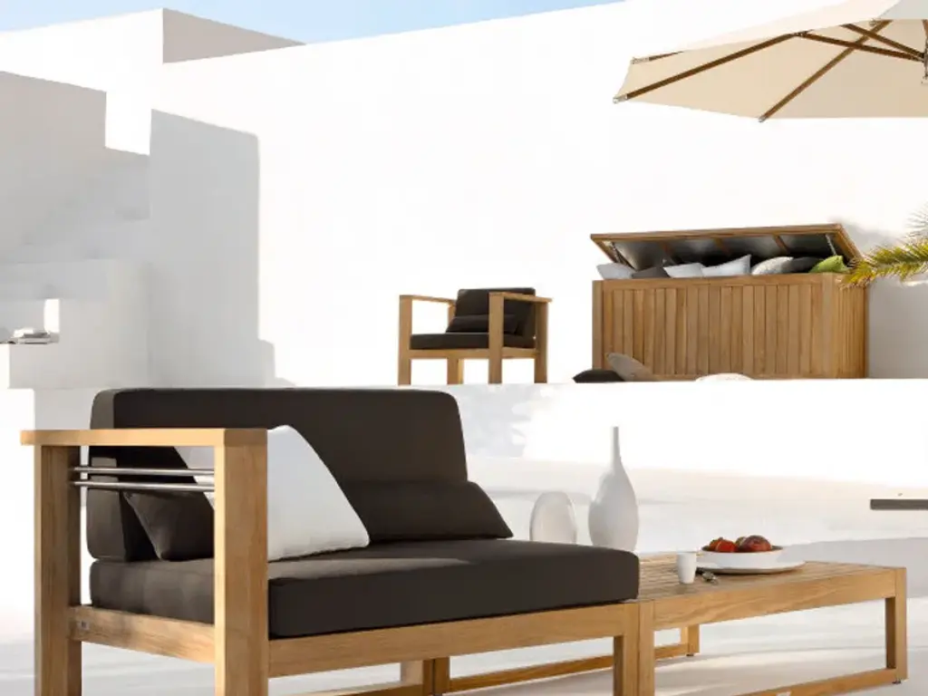 Your relaxation area made of sustainable teak with water-repellent coverings and cushions won’t have anything to fear from the weather. The coffee tables go perfectly with the sofas and are also an excellent accompaniment to the chairs and footrests. For lazy summer days by the pool, the “monsoon rain” teak shower can be moved around as you wish. The tables, loungers and cushion boxes have been designed using delicate slats for a feeling of timeless elegance.