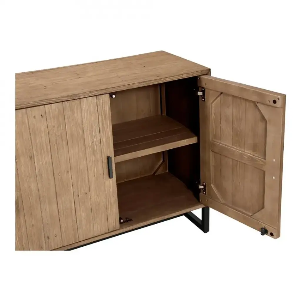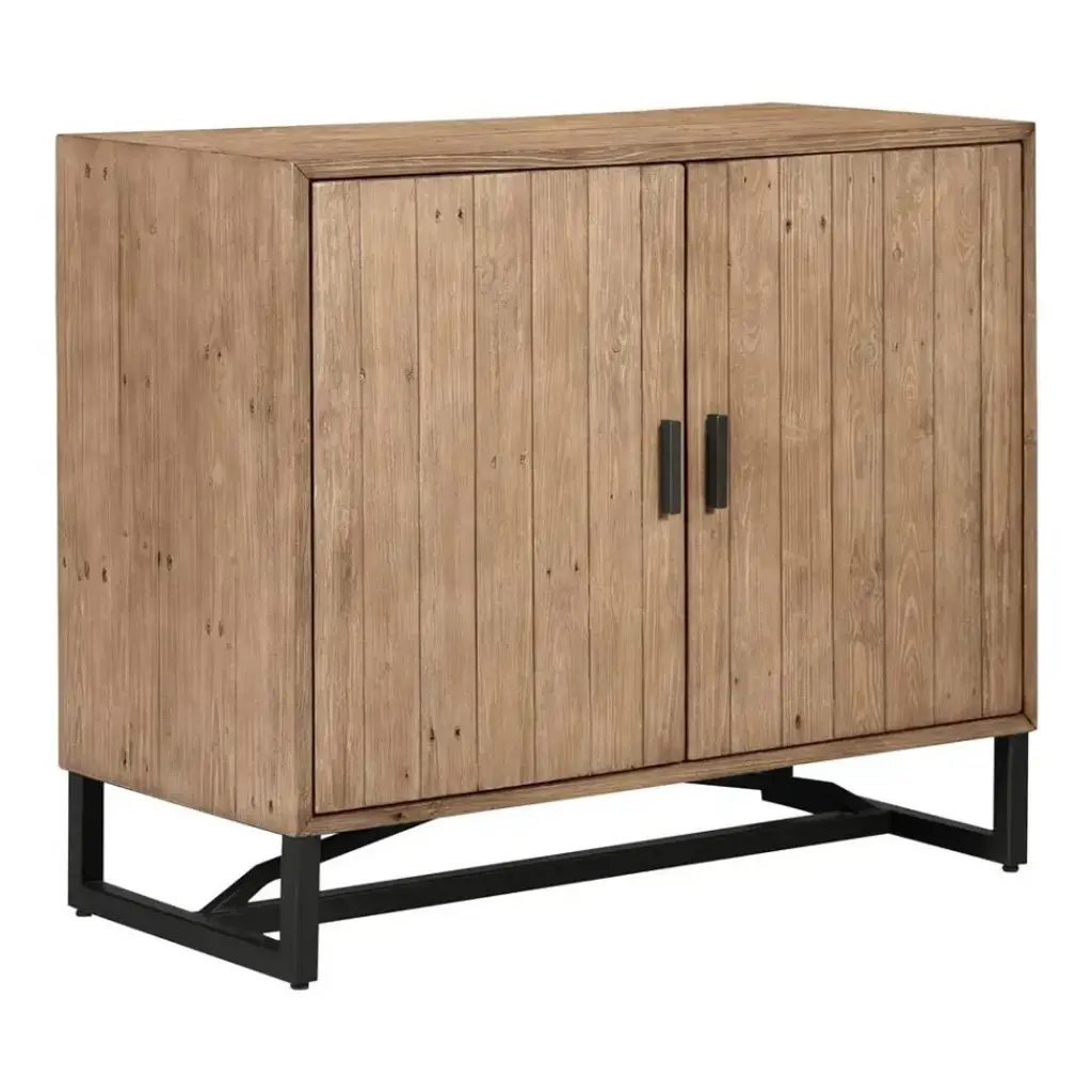 Made with solid reclaimed pine, the Sierra 2 door cabinet exhibits natural woodgrain and knot variances. Its single adjustable pine wood shelf provides ample space while a solid metal base & finished back give this 2 door cabinet its transitional design.