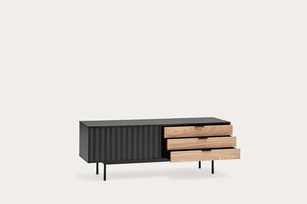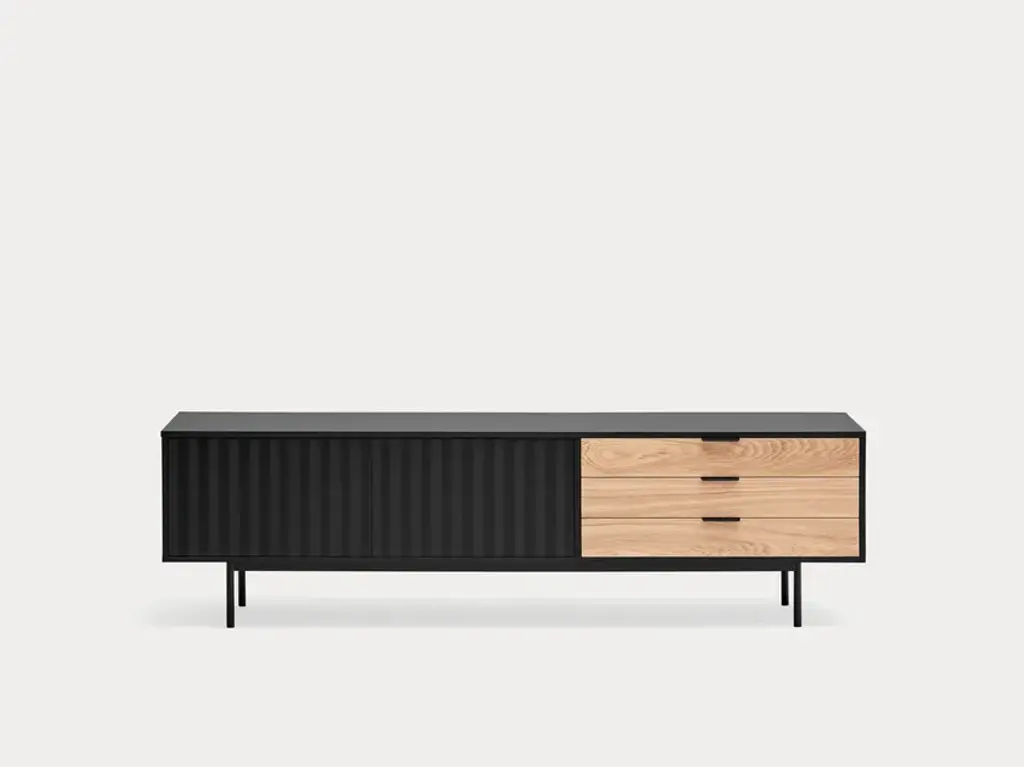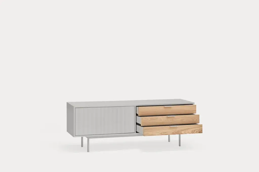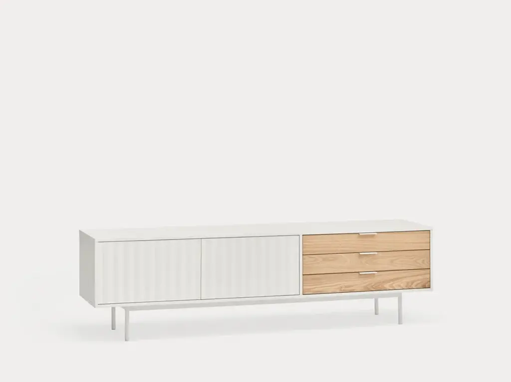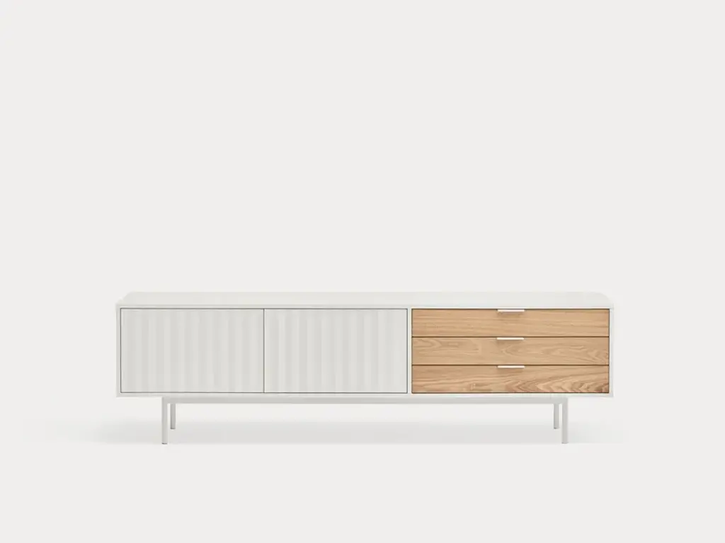 Sierra is a matt laquered MDF tv cabinet which stands out with its three drawers in natural oak veneer and it counts inside two shelves offering many storage options.Sierra collection is inspired by the mountainous depths. Infact the finish is inspired by the ups and downs of a serrated landscape that plays with lights, shadows and the perception of volume itself.