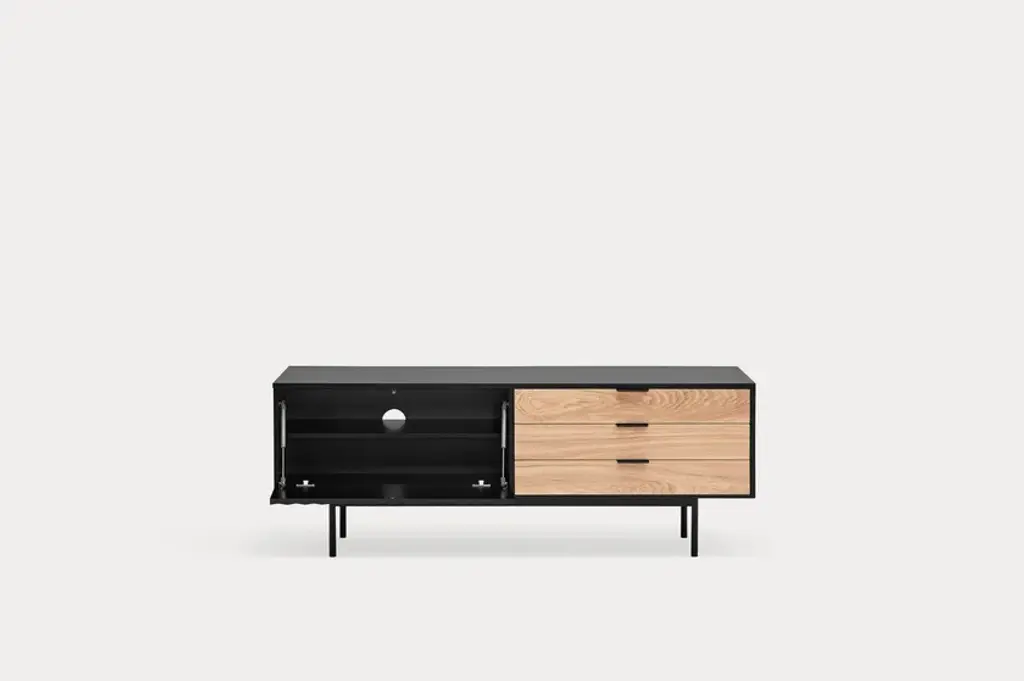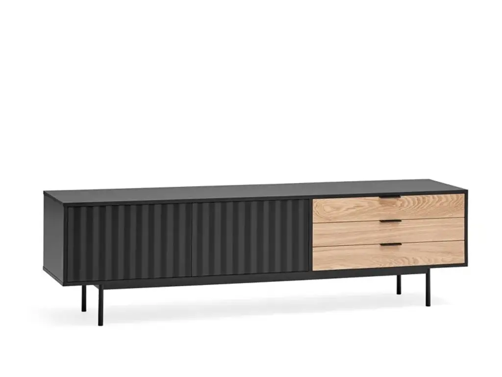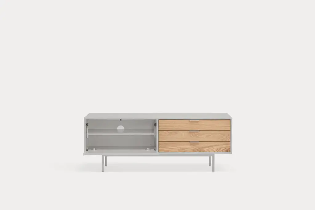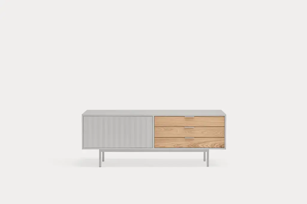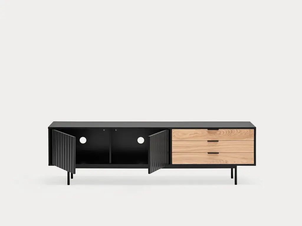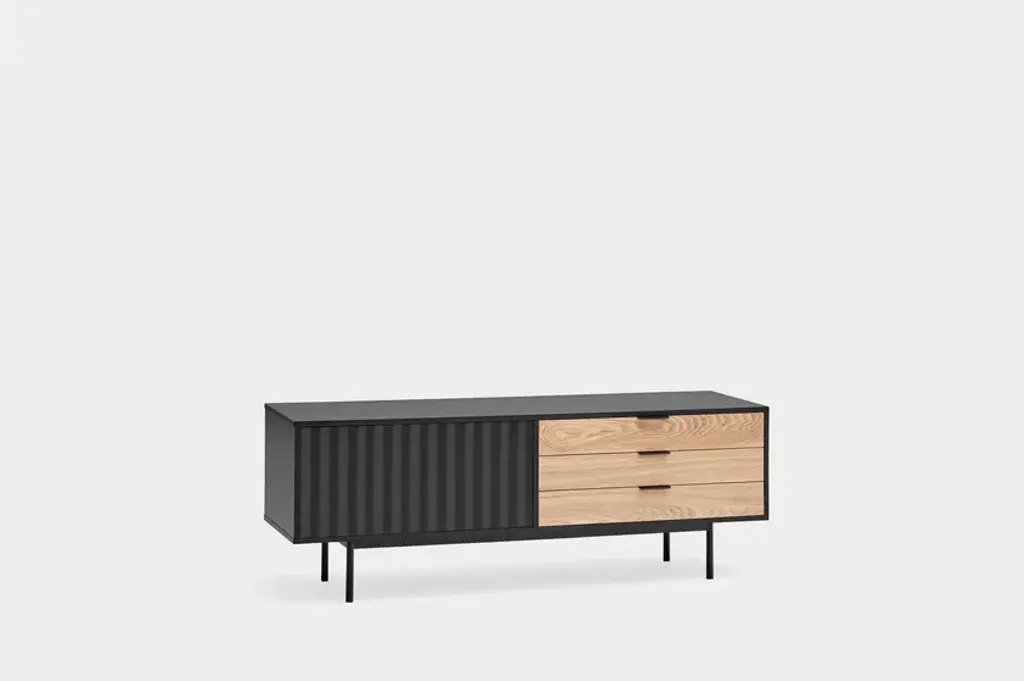 Sierra is a matt laquered MDF tv cabinet which stands out with its three drawers in natural oak veneer and it counts inside two shelves offering many storage options.Sierra collection is inspired by the mountainous depths. Infact the finish is inspired by the ups and downs of a serrated landscape that plays with lights, shadows and the perception of volume itself.