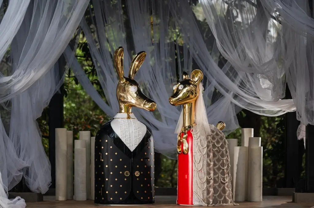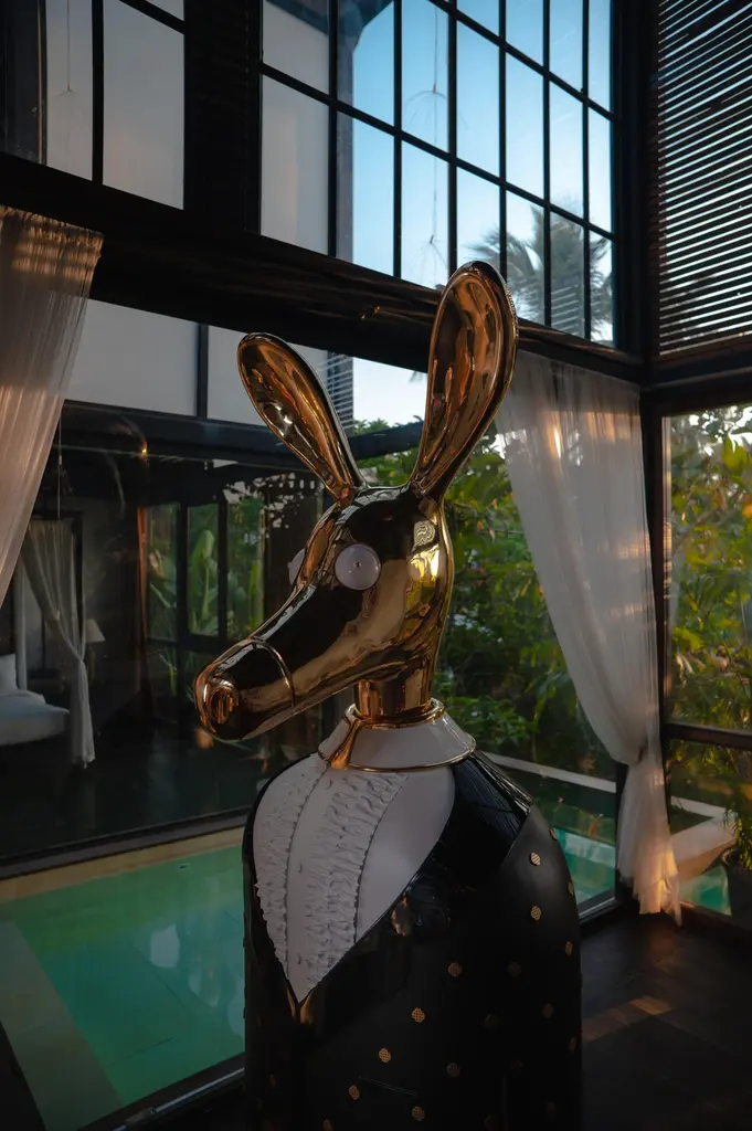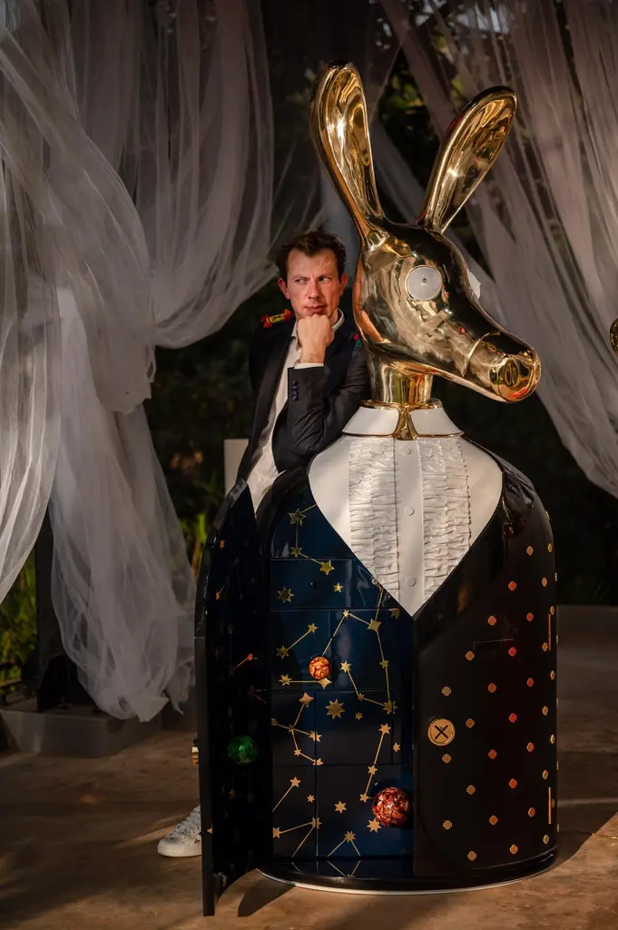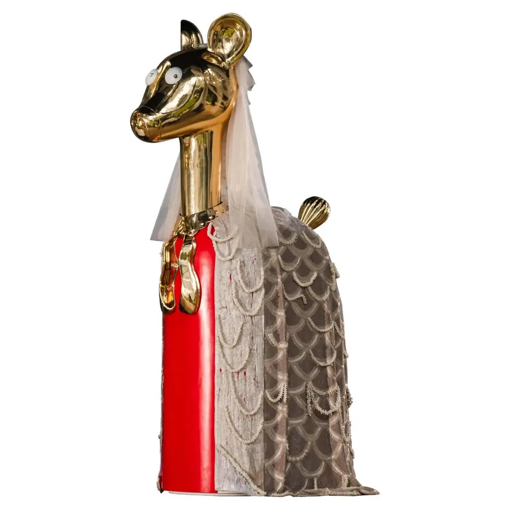 The Signor Ciuco donkey bar storage cabinet with brass inlay by Matteo Cibic is a special cabinet covered with our logo shaped gold studs on a rich black jacket. He holds a universe of love and joy within. Signor Ciuco cabinet has large brass donkey head on a wooden body, finished with brass and resin details. The cabinet has two doors with brass button knobs and a drawers inside.“Until one has loved an animal, a part of one’s soul remains unawakened.” Pushing the boundaries of shape and form, Matteo’s ANIMAGIC is a celebration of animal forms in andromorphous design. An odd mix of humour, luxury and utility, these pieces go beyond being furniture - they are magical, sculptural objects, almost life like, that make you smile every time you glance at them. Scarlet Splendour brings to you Matteo Cibic’s ANIMAGIC, an odd collaboration of humour and luxury, handcrafted in animal forms.Care: wipe gently with dry soft cloth. Liquid spillage must be wiped without delay. A premium wax maybe used occassionally to refresh the high gloss.Celebration of Authenticity: Slight variations or imperfections are the marks of an artisan, a testament to the individuality, emotion and originality of each work of art. We assert our right to make meaningful qualitative changes.Please note: Prices do not include VAT. VAT may be applied depending on the ship-to location.