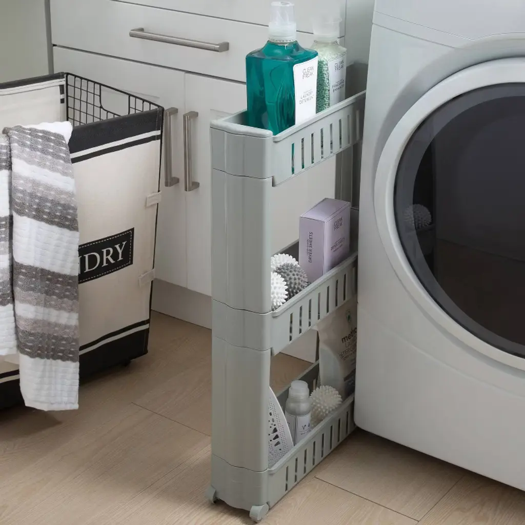 Maximize your storage space even in the smallest spaces with the Simplify 3 tier slide out cart. The slim design allows this cart to fit between your washer and dryer, appliances, side of cabinets and other small spaces. Designed with 3 tiers of shelving you can store your detergent, cleaning products, bathroom accessories, kitchen accessories and lots more. Ideal for kitchens, bathrooms and laundry rooms the cart conveniently slides in and out of where stored on its 4 wheels.