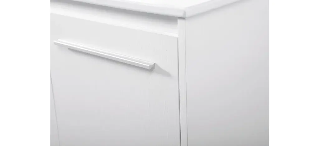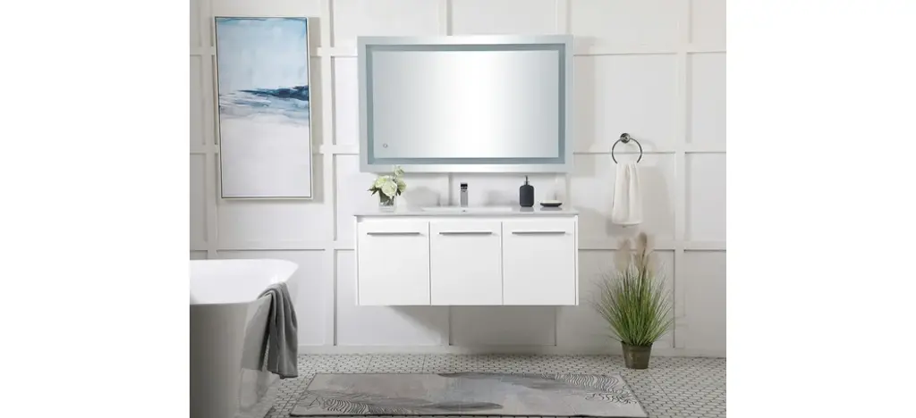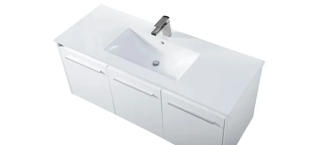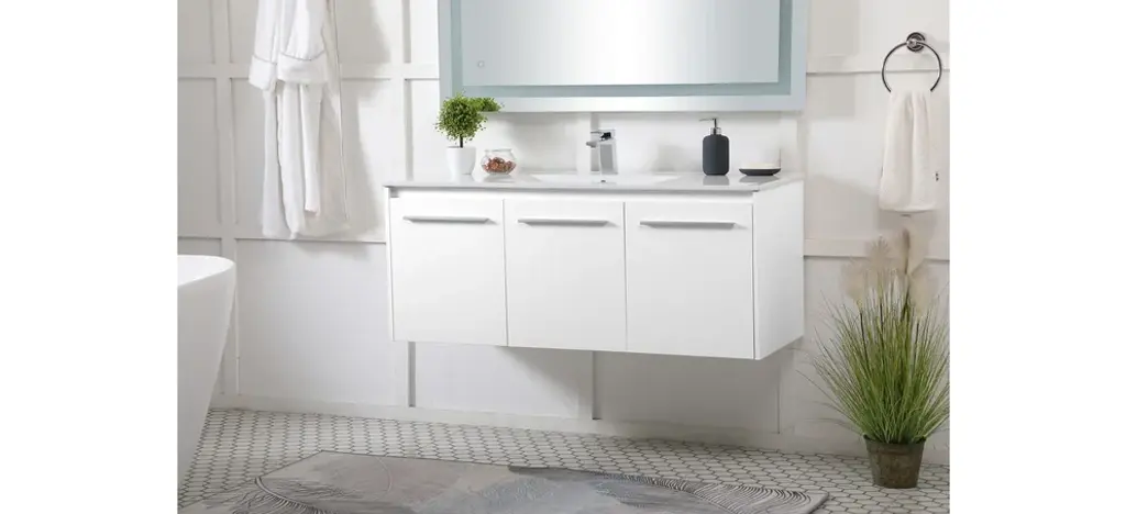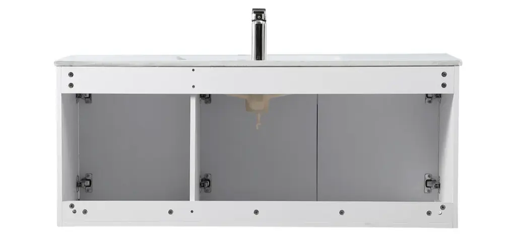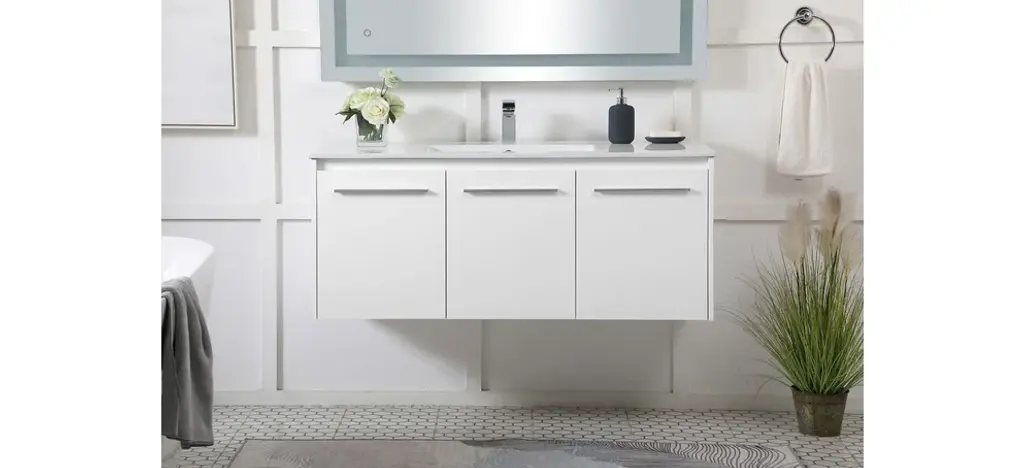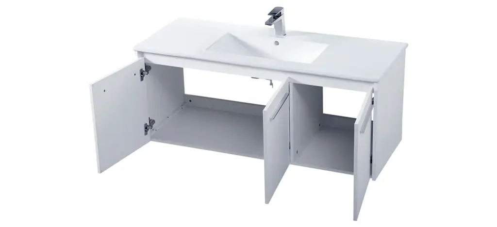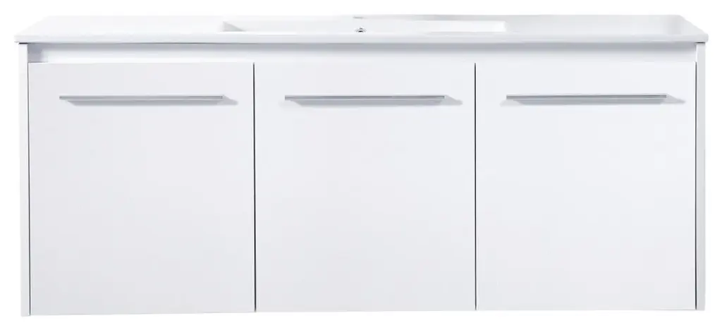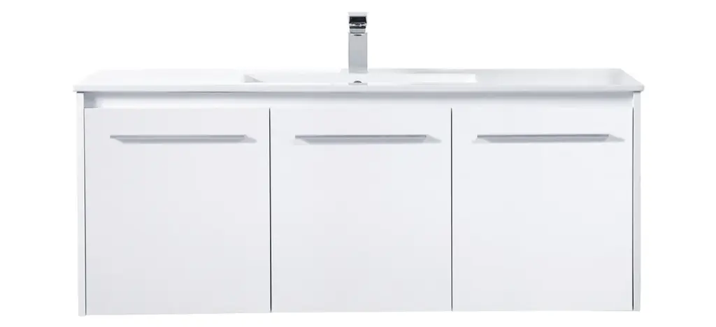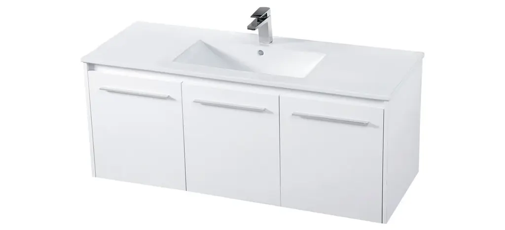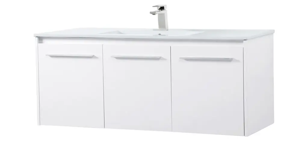 The contemporary simplicity of this 48" floating vanity in a white finish will help open the space and add stunning modern flair to your bathroom or powder room. The open space below makes it easy to show off your tiles and to clean the floor with ease--it's also the perfect place for a hamper. 3 doors open to reveal plentiful of storage pace to store all of your bathroom miscellany. The clean lines that permeate through the design will surely create a fresh look in your home. (FAUCET NOT INCLUDED)Engineered with durable resin countertopBrushed nickel finish hardwareCrafted from MDFIntegrated undermount resin sinkDeep cabinet space for your storage needsInstall floating vanity at any heightNo assembly required