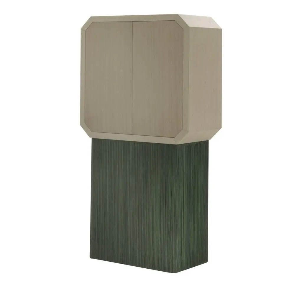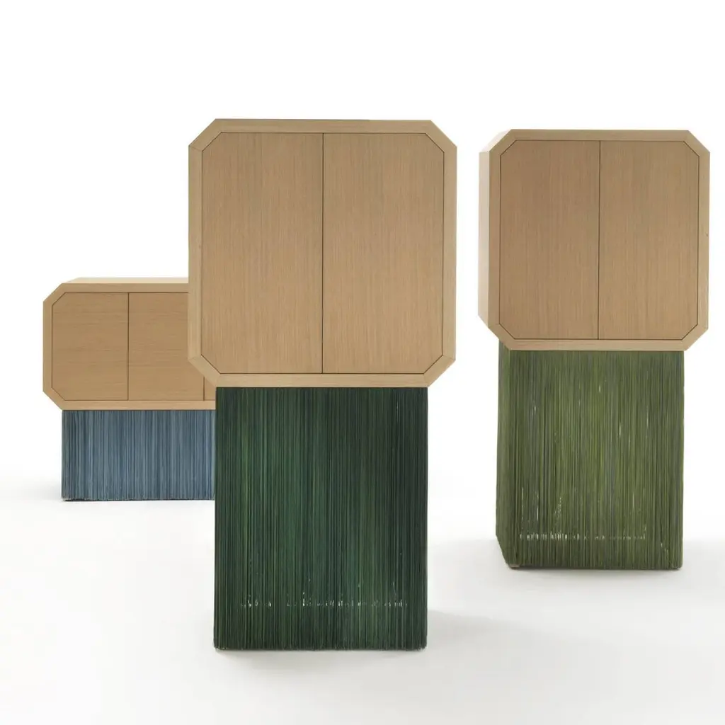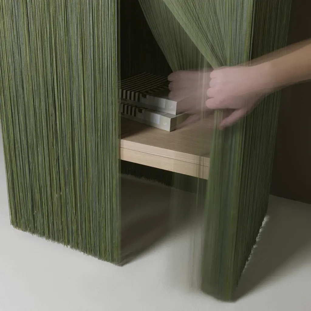 Inspired by the atmosphere of the theatre, this unique cabinet is part of the Sipario series. The top cabinet is available in oak or "Canaletto" walnut wood with an interior glass shelf. The storage space below is covered with two long fringes of traditional Italian trimming available in different colors, made with the "Tripolino" technique, a very thick trimming obtained with one single thread carefully crocheted.
