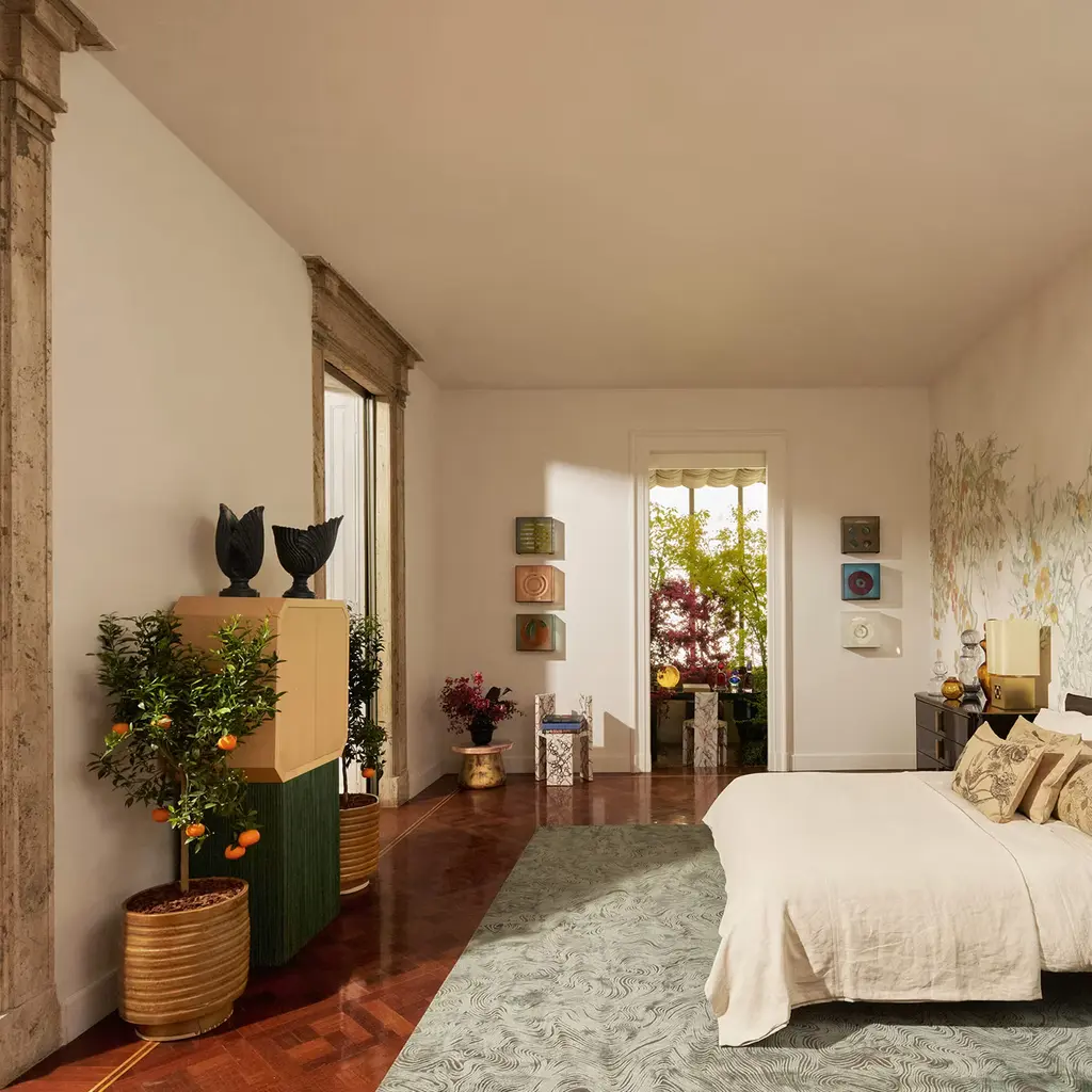 Inspired by the atmosphere of the theater, this unique cabinet is part of the Sipario series. The top cabinet is available in oak or "Canaletto" walnut wood with an interior glass shelf. The storage space below is covered with two long fringes of traditional Italian trimming available in different colors, made with the "Tripolino" technique, a very thick trimming obtained with one single thread carefully crocheted.