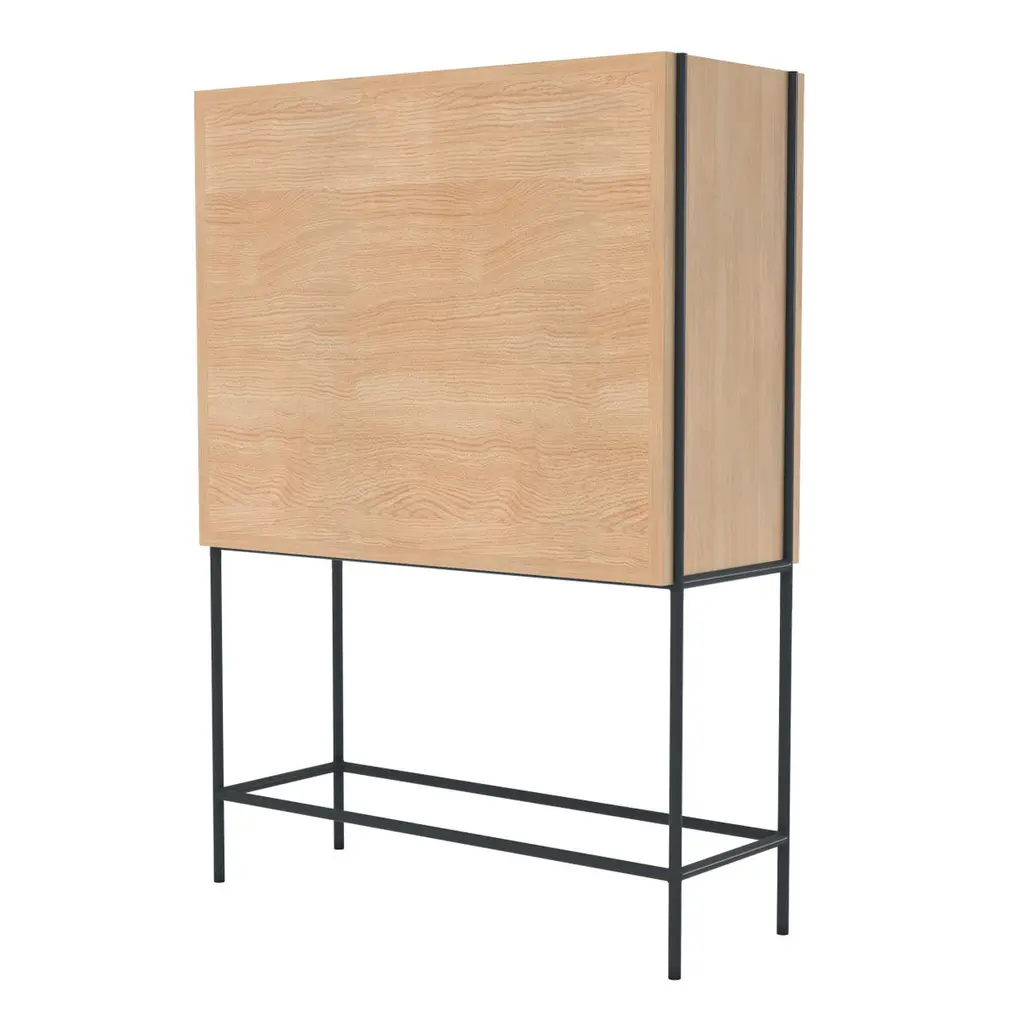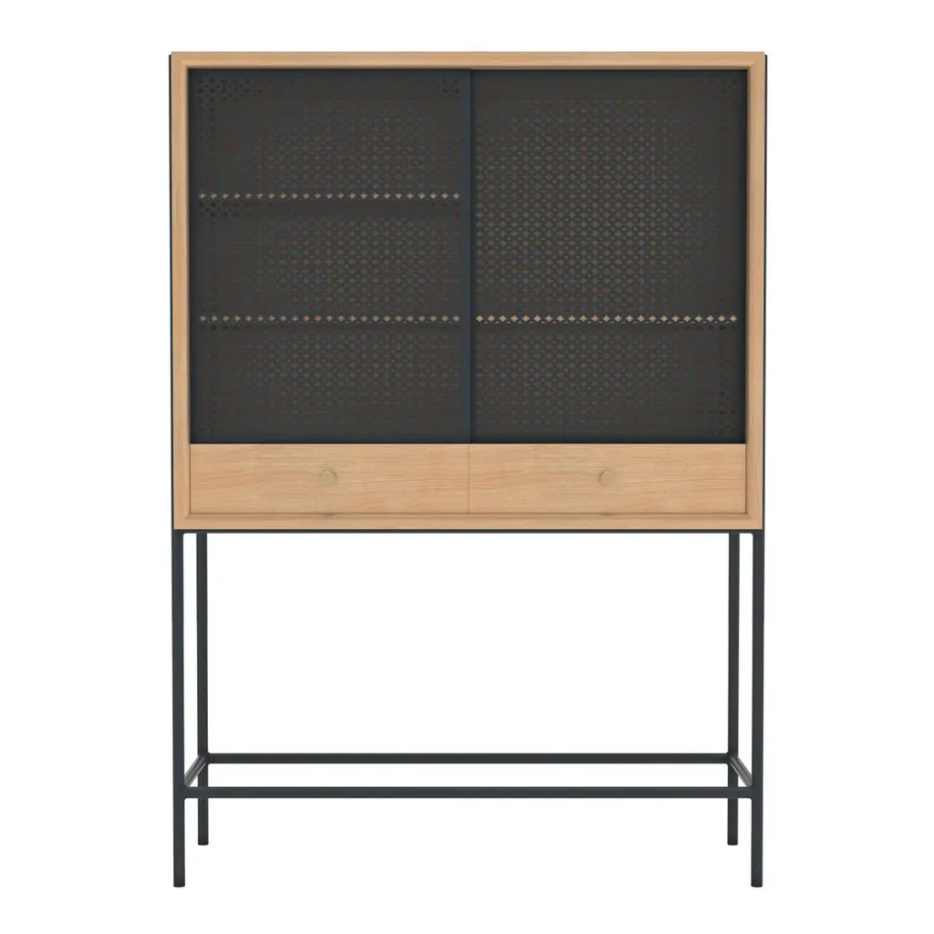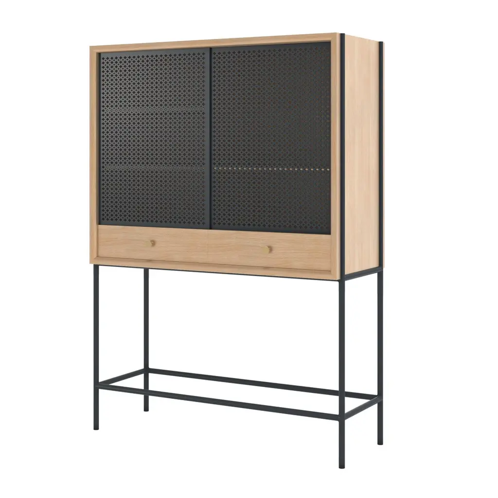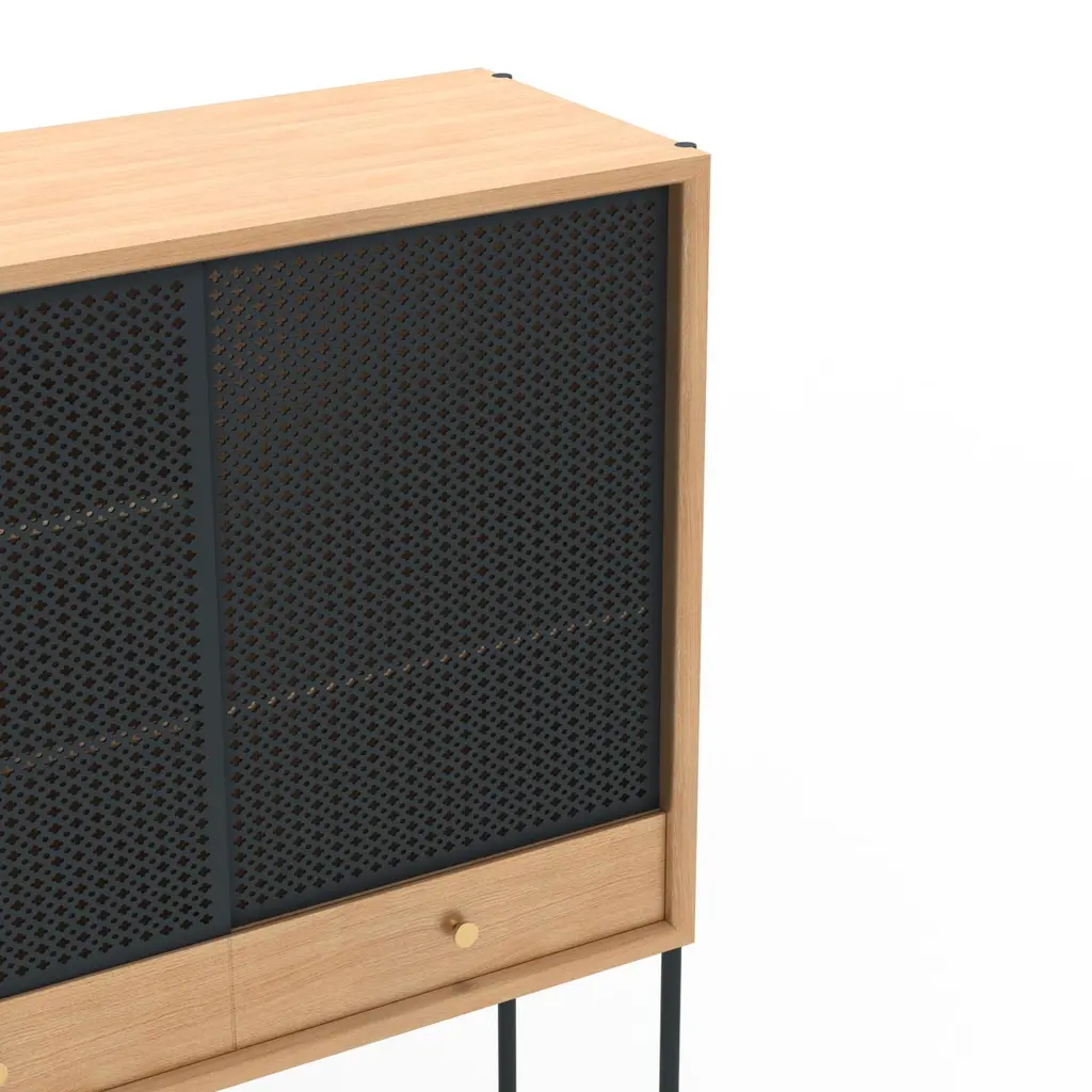 Slate Grey Metal Gabin Cabinet Natural Oak by HARTODimensions: W 100 x D 40 x H 140 cm. Materials: MDF wood veneer, Painted metal.Weight: 59.5 kgThe Gabin cabinet is ideal for creating a bar area in your living room. Behind its openwork metal doors, you can store glasses and bottles, its large drawer will hold all the necessary equipment and its retractable shelf will serve as a work surface to prepare your best cocktail recipes. The Gabin Cabinet is made in Portugal, it is made of solid oak, oak veneered MDF, a metal structure and perforated and lacquered metal doors. The Gabin collection is a creation of Mathieu Galard.About: Hartô, a French furniture brand, was born in 2012 from the desire of its founders to offer a different design, less elitist, which combines the useful with the beautiful. A light, joyful design, as if to say "I'm fed up" (with boring furniture): this is the meaning of the word harto in Spanish. The first pieces of the collection, the desks offer a new vision on a market that was then quite sparse, and offer functional tips and a joyful, colorful design, out of step with the archetypes. The foundations of the Hartô spirit are laid: a free spirit, a design of the useful, curved shapes, colors. In a word: creativity! And of course, from the beginning, this translates into collaborations with talented designers. This spirit crosses the years and the collections, evolves, refines itself, without ever denying itself. Today, audacity and creativity are still there, and are translated in a subtle way, all in elegance. At Hartô, the freedom to create is also based on strong commitments to quality and durability: the furniture is made by the best local craftsmen, who use noble materials to give life to pieces that will last through the ages.