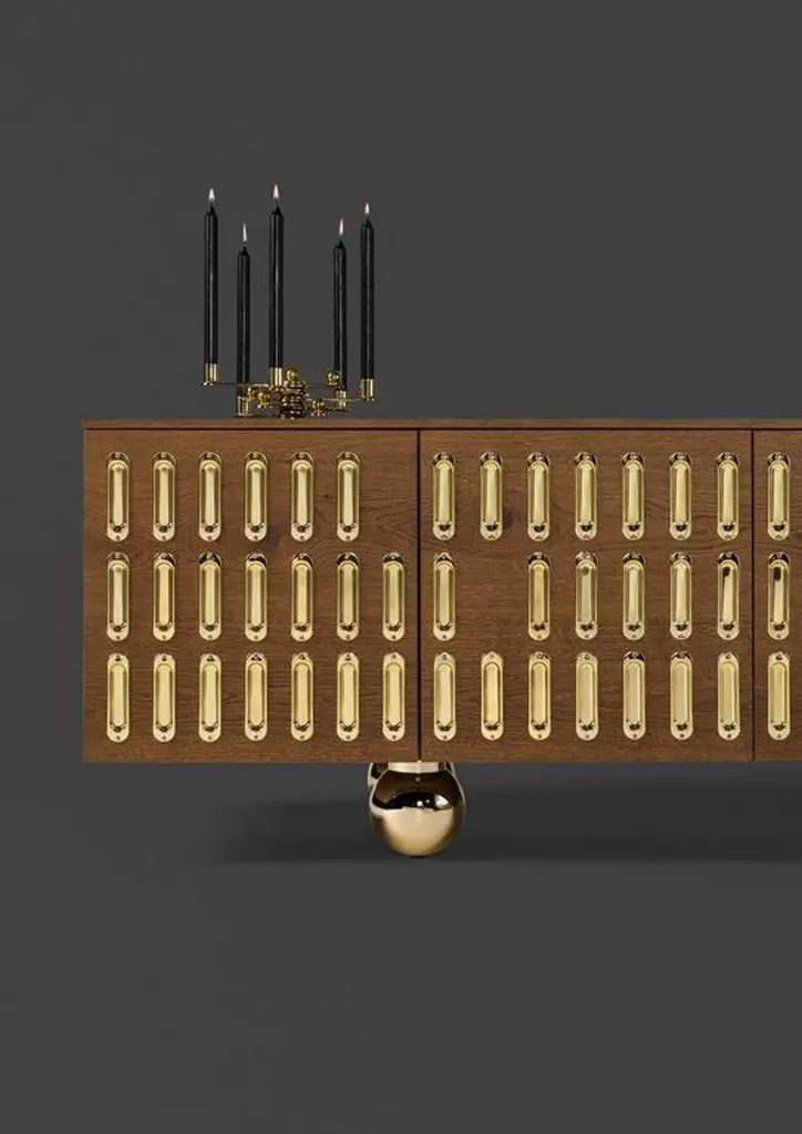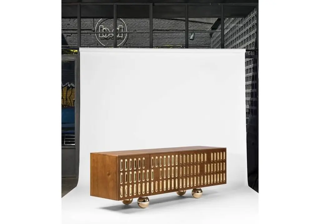 Sliding cabinet limited edition of one, designed by Ramón Úbeda for BD Barcelona.Container, frontals and shelves veneered in natural stained dark oak. Legs in aluminium with a brass coat. Accessories in polished varnished brass.Dimensions: 200 x 50 x H 67 cm.Remix project Vol.1 & Vol.2.Recuperate, reuse and reinterpret. BD is joining the prefixed RE conscientiousness, with a project that is without any complex inspired in our grandmother’s kitchen. Cooking with leftovers is something as old as necessary and nevertheless creative. In our recipe book exist memorable dishes that are prepared with hard bread from the previous day, and chicken leftovers from Sunday’s roast. Leftovers that are wisely reused and reinterpreted. For example, the canelón or cannelloni that can be transformed into a kitchen masterpiece.Company warehouses in the design sector also accumulate leftovers. Generally, these are loose pieces or components of furniture parts that have been forgotten about and put in a drawer, because there was once an excess in fabrication or have been discontinued. It’s a considerable amount of stock that has no way out and that grows with time until it becomes a problem. It loses all its value but continues taking up space and ends up being legally certified (mandatory) to be destroyed.BD has accumulated outdated materials as well, but before considering destroying it we thought we could give it a second chance. Amongst the materials, there are the door handles and knobs designed by Cristian Cirici, which had a lot of success during the eighties of the past century, but stopped being sold when the company changed direction to focus on other markets. In our actual catalogue, there are no door handles or knobs, but we have unique pieces; so why not convert these leftovers into design and art pieces? We offer a limited edition until stocks last.This project has been named REmix, since it has something of a mix, like disco music that was fashionable at the same time the original pieces were designed. To complete it we have had the help and participation of different authors. REmix Vol.1 is a limited set of candle holders made by Curro Claret. Because of his profile and trajectory, we couldn’t have chosen a better designer to start with the project. REmix Vol.2 is a limited set of cabinets, developed by Ramón Úbeda and the BD technical team.