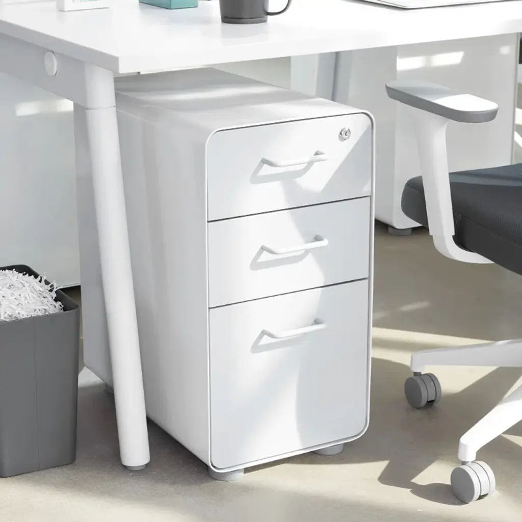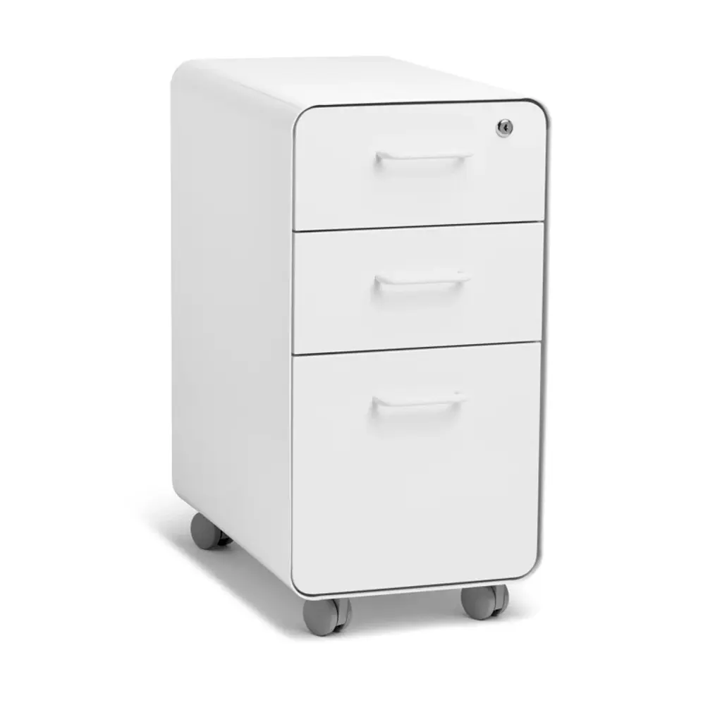 Our Slim Stow File Cabinet is designed for use with 47" desks, providing plenty of room for both your docs and your knees. Powder-coated steel construction with matching painted steel interior keeps your stuff super safe. One lock secures all three drawers, giving the entire cabinet the privacy it deserves.