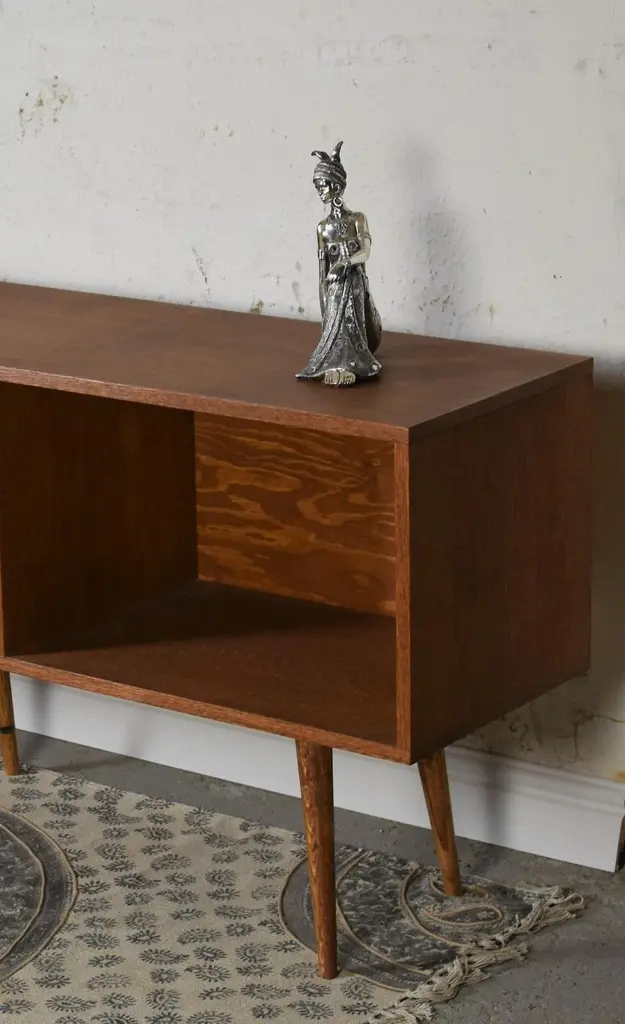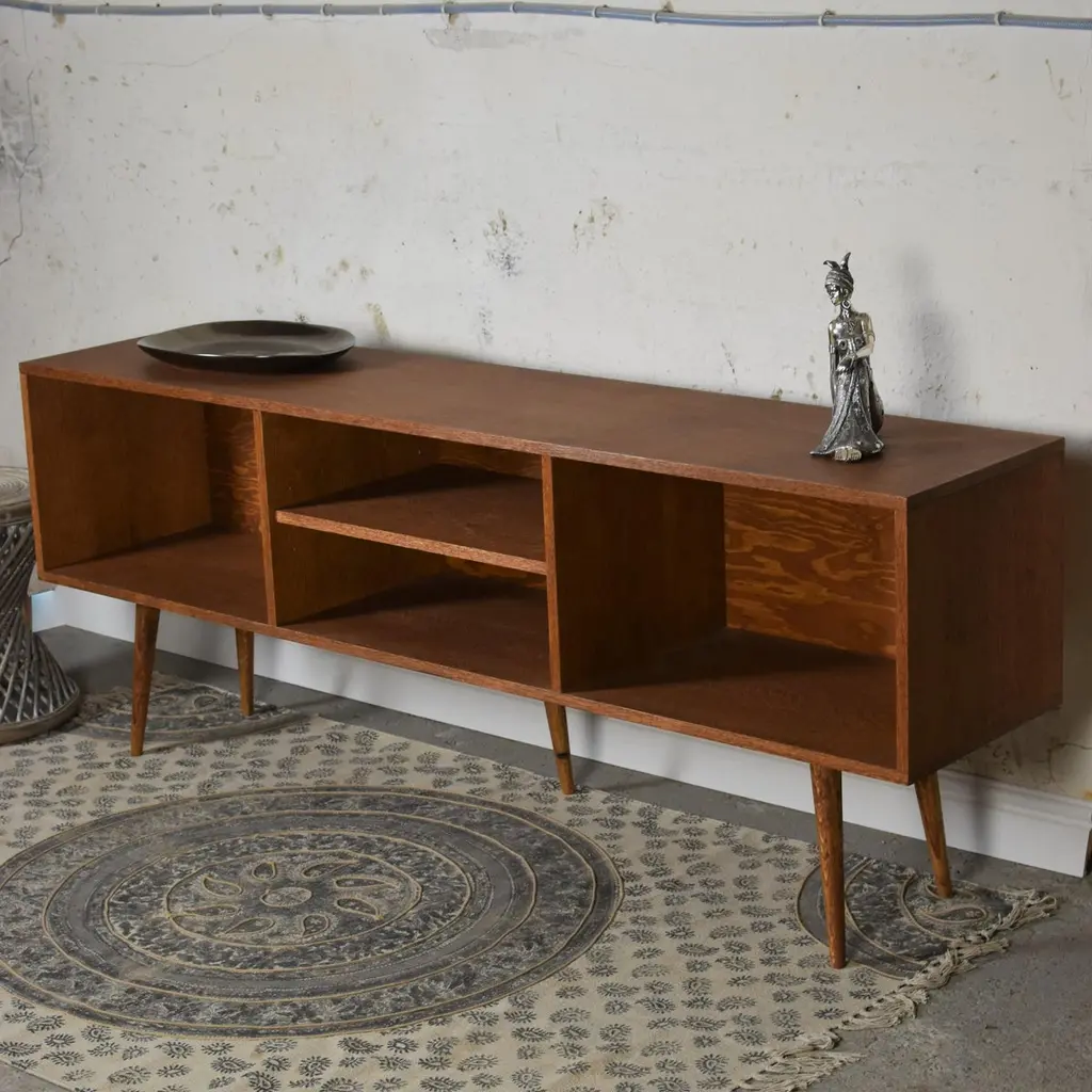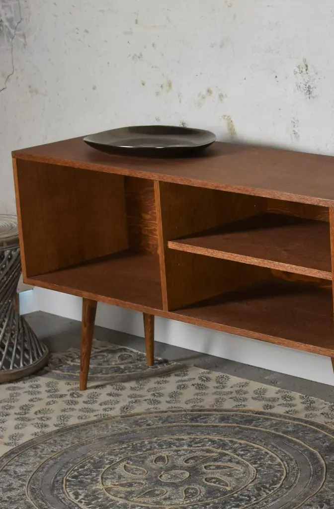 Small TV Open Cabinet by PastformDimensions: D 40 x W 180 x H 75 cm.Materials: Stained and varnished wood.Available in different wood color finishes: Whiskey, Rum, BPA, Nobel, Brandy, Schwarz, Natura, Honey, Dark Brown, Nevada, and Cognac. Prices may vary. Available in two different widths: 180/250 cm. Please contact us.Rooted in a good traditionThe Pastform Furniture studio dates back to the 1990s. Having in mind the idea of a traditional family company, Dawid Gełeta established a carpenter’s shop in 1997. The company specializes in the manual production of utility furniture. Times have changed and with them, fashion has changed. In 2016 we decided to change the direction, following the growing demand for vintage furniture.My name is Mateusz Gełeta, I am the son of the carpenter who founded the company. From an early age, I have watched my dad’s work. He put his whole heart into creating furniture, polishing every detail with his strong hands and making sure that nothing escaped our attention before sending the product to the customer. He made sure that every piece of furniture was perfect and refined. We remain true to these principles.Following the blow, I decided to create a harmonious combination of modern quality with the classic style of the 1960s. This is why I designed and created a unique collection of wonderful furniture, which, in addition to its well-thought-out functionality, also creates a perfect design and composes original arrangements.The golden age of interior designIn the 1960s interiors used to take on a very characteristic touch. All over the world, this style was called a mid-century modern, locally it was simply – retro furniture. Simple, elegant minimalistic form, without unnecessary decorations and splendor. Decorating with the idea of an uncomplicated composition, it allows for an undisturbed selection of the arrangement accessories and emphasizes a high level of functional comfort. One might say – a perfect piece of furniture. Comfortable, hiding surprisingly many items despite quite neat dimensions, made of noble species of wood and created by hand, with a focus on carefully refined details. No wonder its popularity is growing so much.Unique, refined, with a soulEach piece of the Pastform collection represents a unique style. Thoughtful concept of usable comfort, refined details, carefully selected raw materials, and proven accessories. We use only high-quality boards which we veneer with oak, American walnut, and other durable wood species. They are carefully oiled with the best, hard, ecological oil waxes, giving the furniture its final shape. This technology brings out the natural beauty of wood, exposes the grain and unique design of each piece, highlights the beautiful color, and allows to achieve timeless durability.This is how unique, thoughtful, and refined furniture with a soul is created.Thinking about futureWe are trying to positively create the world of which we are a part, contributing to a better tomorrow. We cooperate with local suppliers, support small companies and production plants, care for ecology, and respect the needs of the land. We always strive to establish long-lasting, based-on-trust relationships with customers and contractors.Flexible, with openness and heart on handWe sincerely like what we do. Playing with the shape, structure, and texture of wood is fascinating. Creating new arrangements and coming up with innovations that will meet your expectations. We are proud of our products and we are happy to present you with our collection of refined furniture.All our vintage furniture can be made on request – fulfilling the boldest dreams and fantasies. See our offer and if you want to know more, feel free to contact us. We are waiting for you!