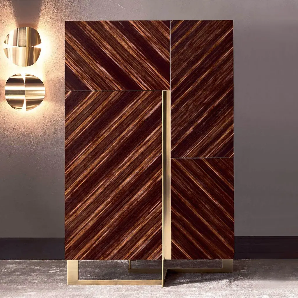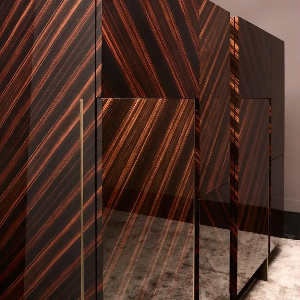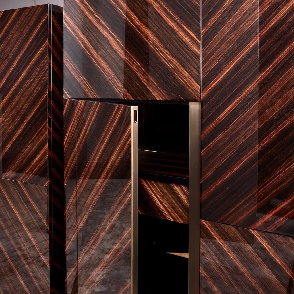 Cabinet Smart Ebo with structure in solid ebony woodin varnished finish outside and inside. WIth solid brass base and details in bronzed finish. Cabinet with 3 shelvesand 1 drawer on the left side and with 3 shelves on the right side.