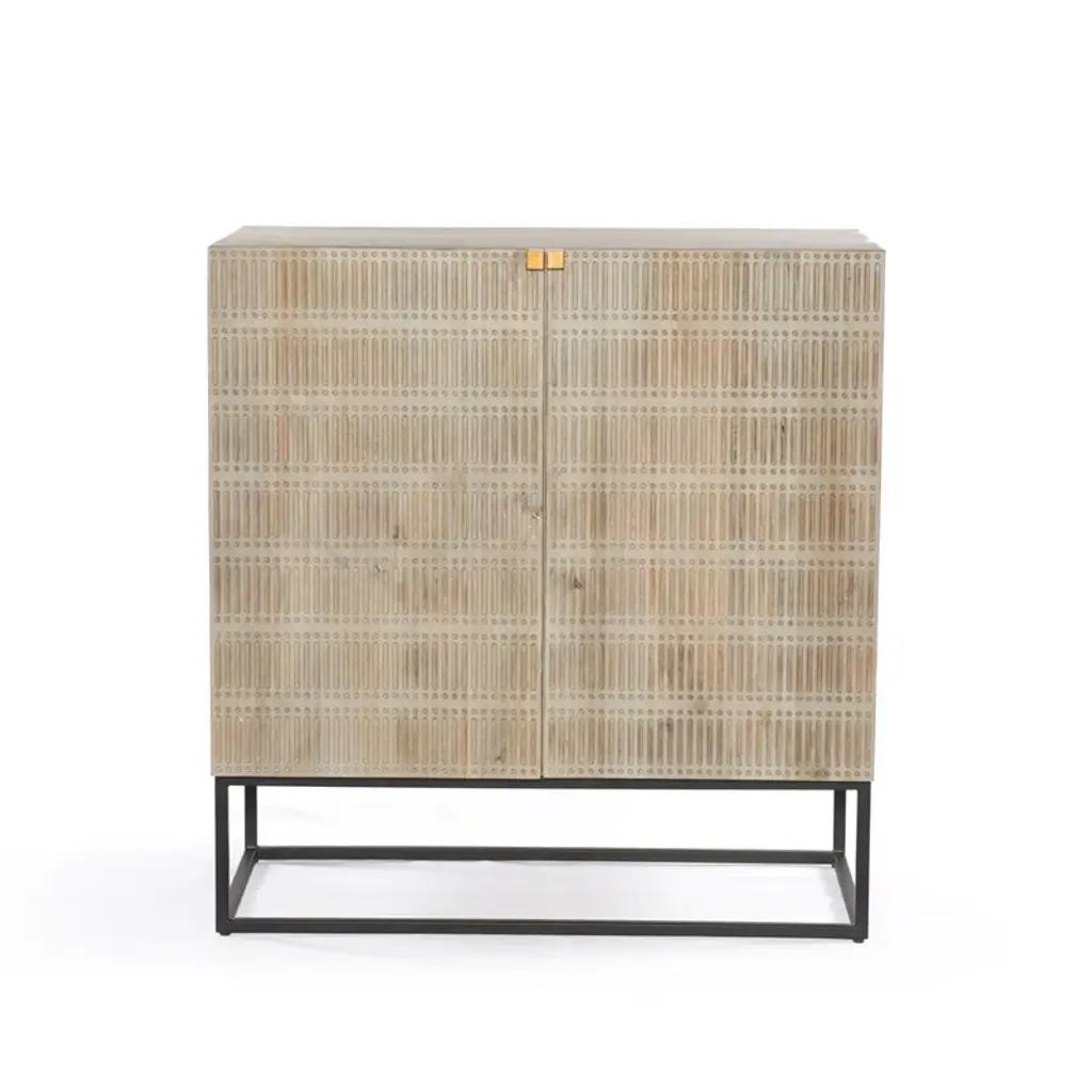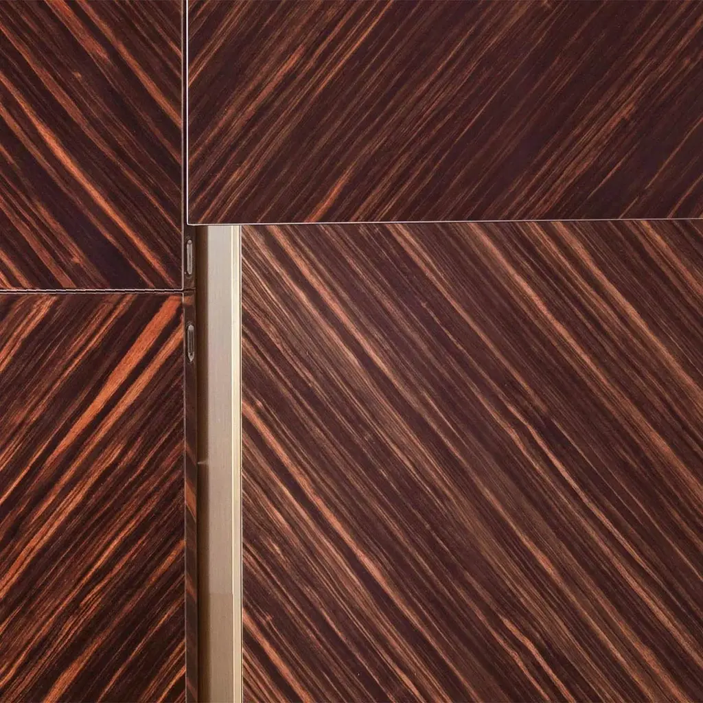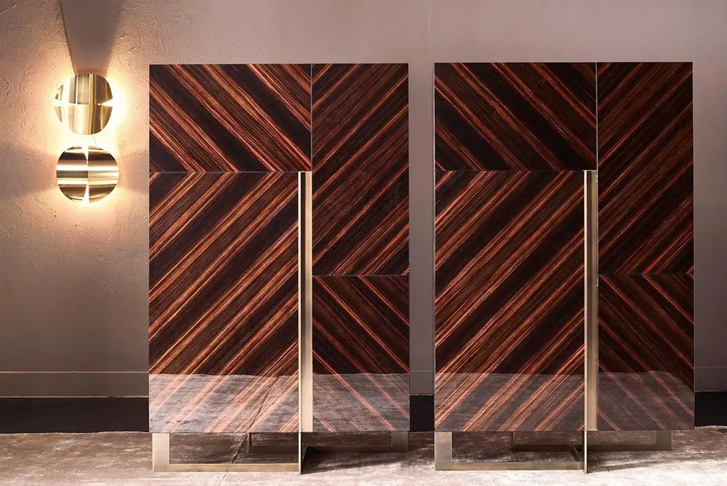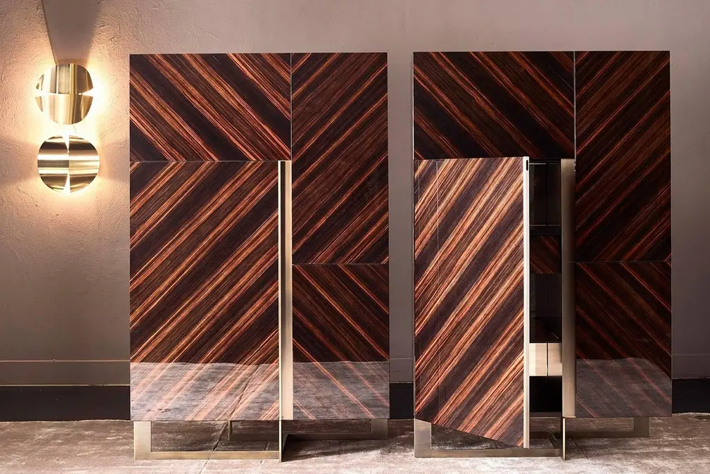 Cabinet Smart Ebo with structure in solid ebony woodin varnished finish outside and inside. WIth solid brass base and details in bronzed finish. Cabinet with 3 shelvesand 1 drawer on the left side and with 3 shelves on the right side.