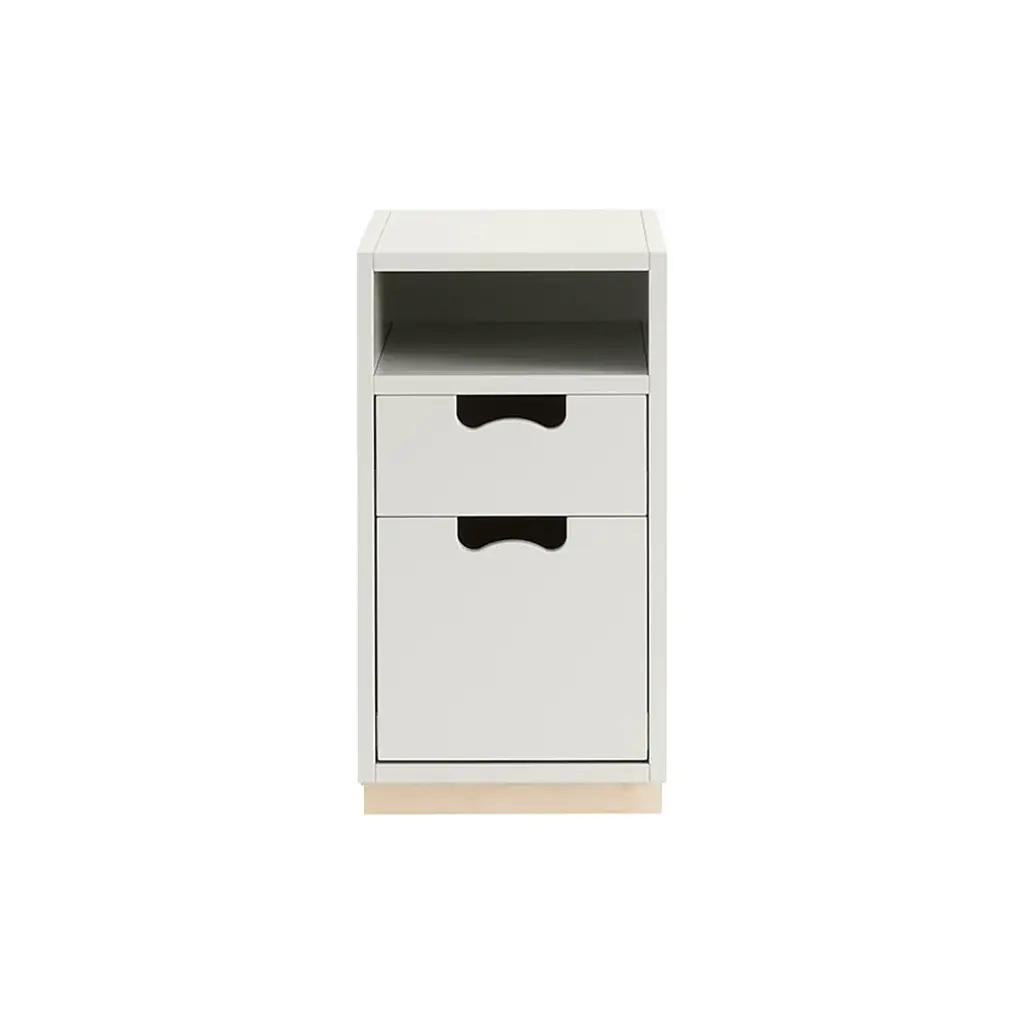 A compact storage piece, Snow G3 is designed with a small drawer, a medium drawer and an open shelf for utmost versatility. From Thomas Sandell and Jonas Bohlin and now considered a Swedish classic, the design features the familiar cutout drawer handles as the sole decorative element (and also functioning as a comfortable grip.) In a choice of soft Nordic hues, the lacquered MDF cabinet has a contrasting natural birch base. Asplund produces the fundamentally handcrafted and made-to-order collection in the small southern Swedish town of Tibro, known for its furniture-making tradition.