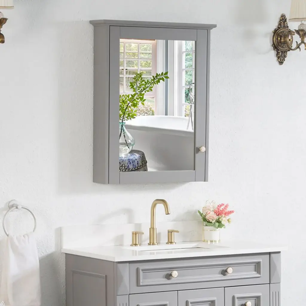 Solid Wood Bathroom Medicine Cabinet With Silver Coated Mirror, Titanium Grey, 24"x30"