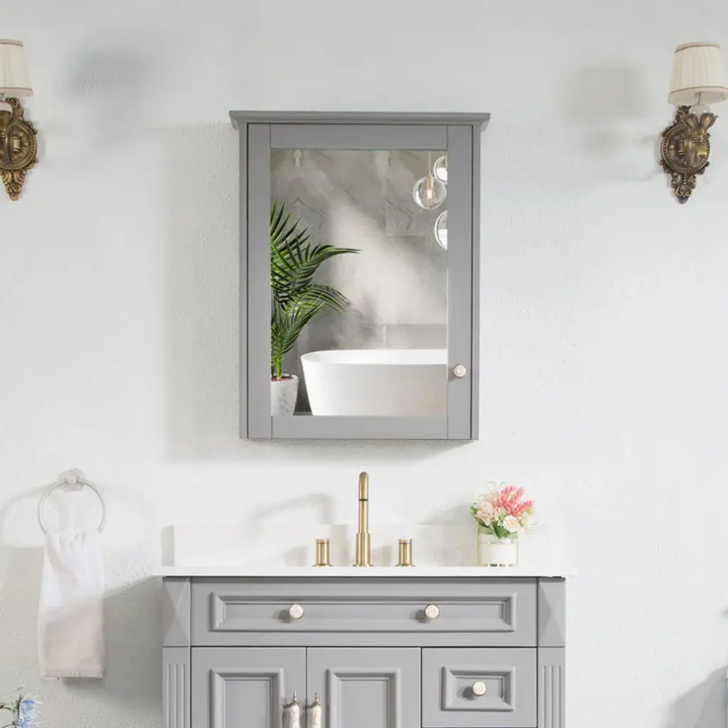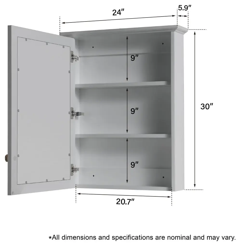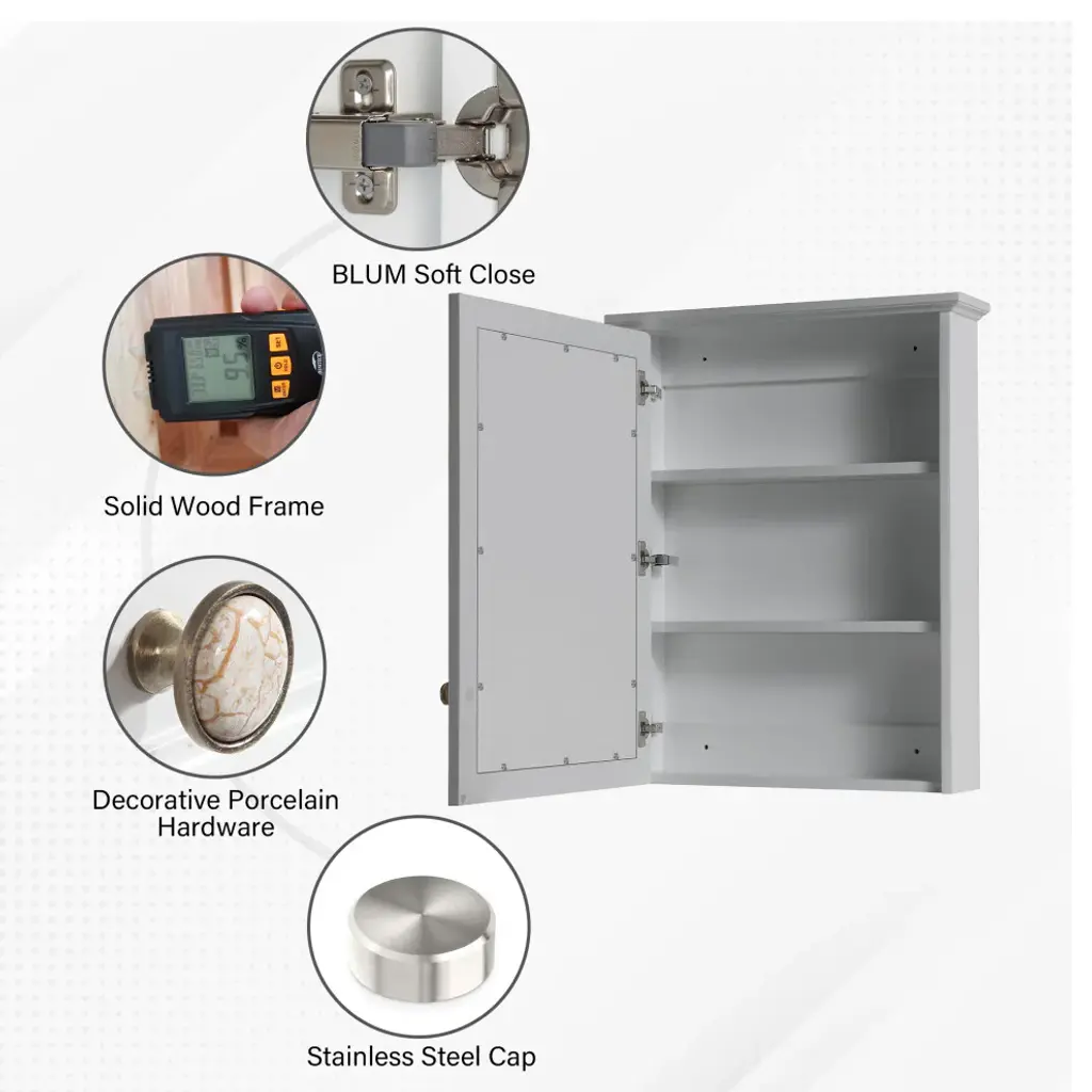 1. Well Made Frame: The frame is made of solid wood and veneer plywood, sturdy and durable. Crafted with 5 layers of high-gloss paint on the surface, which can prevent moisture and extend its service life. 2. HD Mirror: The mirror is constructed of 5mm scopper free clear silver coated mirror which is explosion-proof and scatter prevention, natural and no distortion.3. Extra Storage Space: This bathroom mirror cabinet with wall-mounted design, which can save your floor space. What''s more, the cabinet also has 2 inner shelves to make your bathroom more tidy.4. Soft-close Door: With the soft-close door, there will be no slamming when using this cabinet, protecting both your glass mirror to store your items well. 5. Modern and Elegant: The mirror with modern and simple style is suitable to decorate the bathroom, it will brighten and add visual appeal.6. Mirror Dimension: 24W• 5.9D• 30H inches7. Mirror Net Weight: 27.56 lbs8. Color: White/Titainum Grey/Navy Blue9. Never put any sharp or heavy material on the mirror surface.10. Requires two people installation.