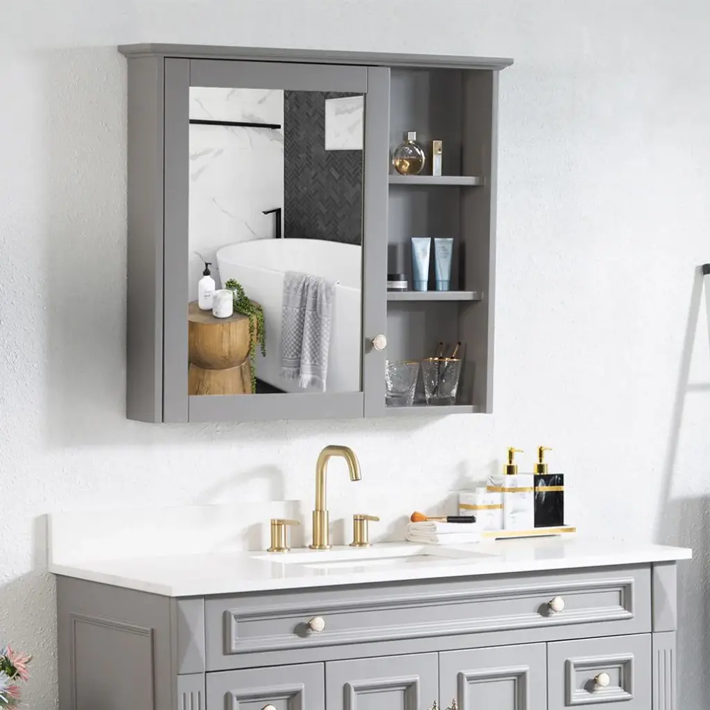 Solid Wood Bathroom Medicine Cabinet With Silver Coated Mirror, Titanium Grey, 34"x30"