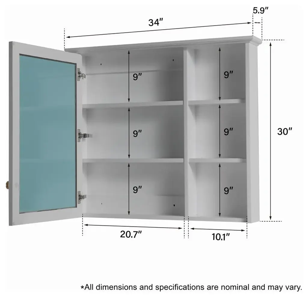 1. Well Made Frame: The frame is made of solid wood and veneer plywood, sturdy and durable. Crafted with 5 layers of high-gloss paint on the surface, which can prevent moisture and extend its service life. 2. HD Mirror: The mirror is constructed of 5mm scopper free clear silver coated mirror which is explosion-proof and scatter prevention, natural and no distortion.3. Extra Storage Space: This bathroom mirror cabinet with wall-mounted design, which can save your floor space. What''s more, the cabinet also has 2 inner shelves to make your bathroom more tidy.4. Soft-close Door: With the soft-close door, there will be no slamming when using this cabinet, protecting both your glass mirror to store your items well. 5. Modern and Elegant: The mirror with modern and simple style is suitable to decorate the bathroom, it will brighten and add visual appeal.6. Mirror Dimension: 34W• 5.9D• 30H inches7. Mirror Net Weight: 34.61 lbs8. Color: White/Titainum Grey/Navy Blue9. Never put any sharp or heavy material on the mirror surface.10. Requires two people installation.