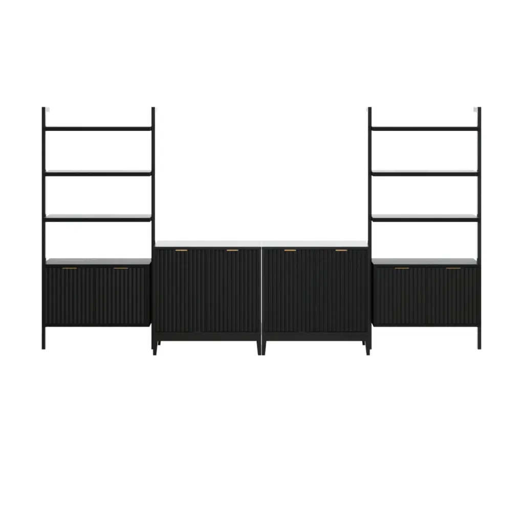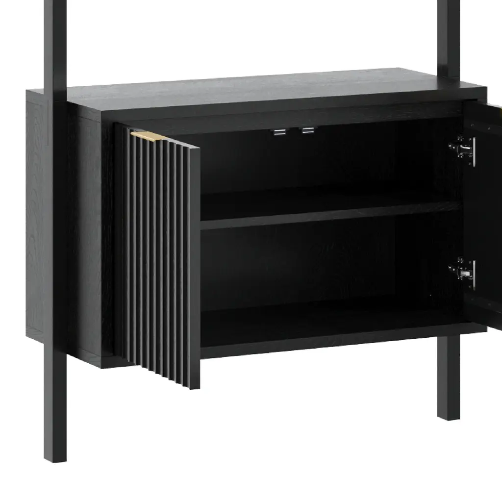 Meet the Jasper Entertainment Center—a stylish blend of function and flair for your living space. With fluted doors, tapered legs, and a black oak finish, this combo brings a touch of warmth and elegance to your home. The real wood veneer and brass hardware add a luxurious touch, while the solid wood bookshelf doors and supports ensure durability. Plus, the bookshelves secure directly to the wall, keeping everything safe and sound. Jasper is the perfect companion for your entertainment needs!