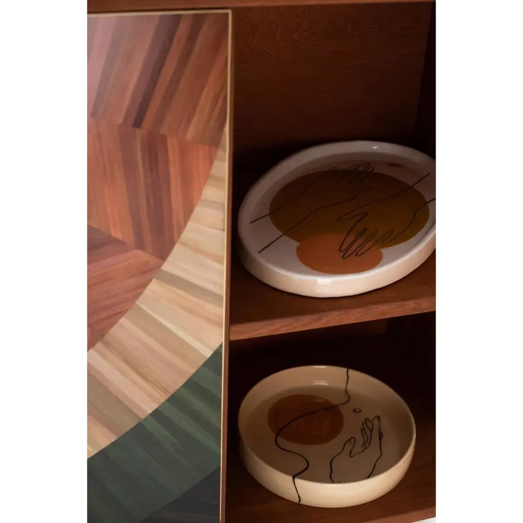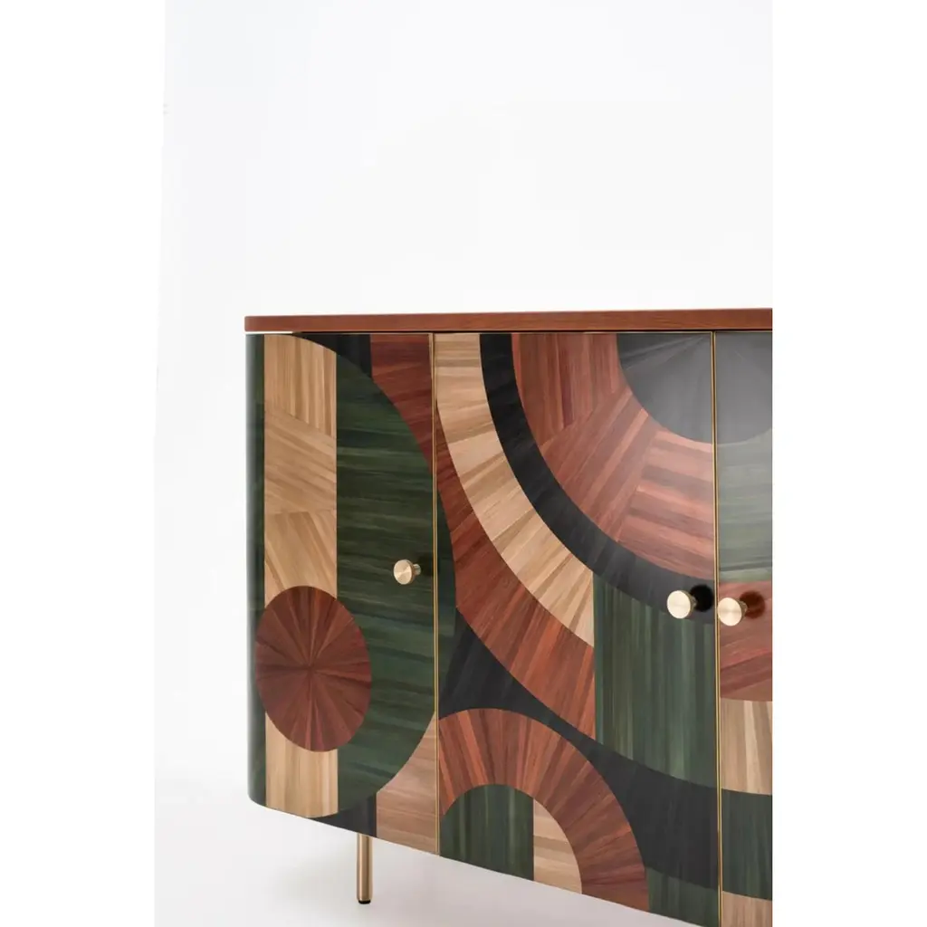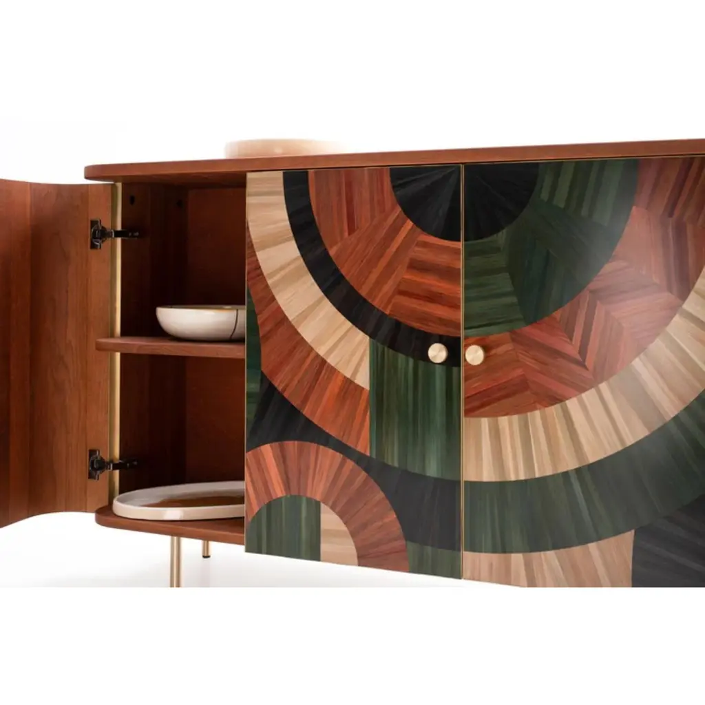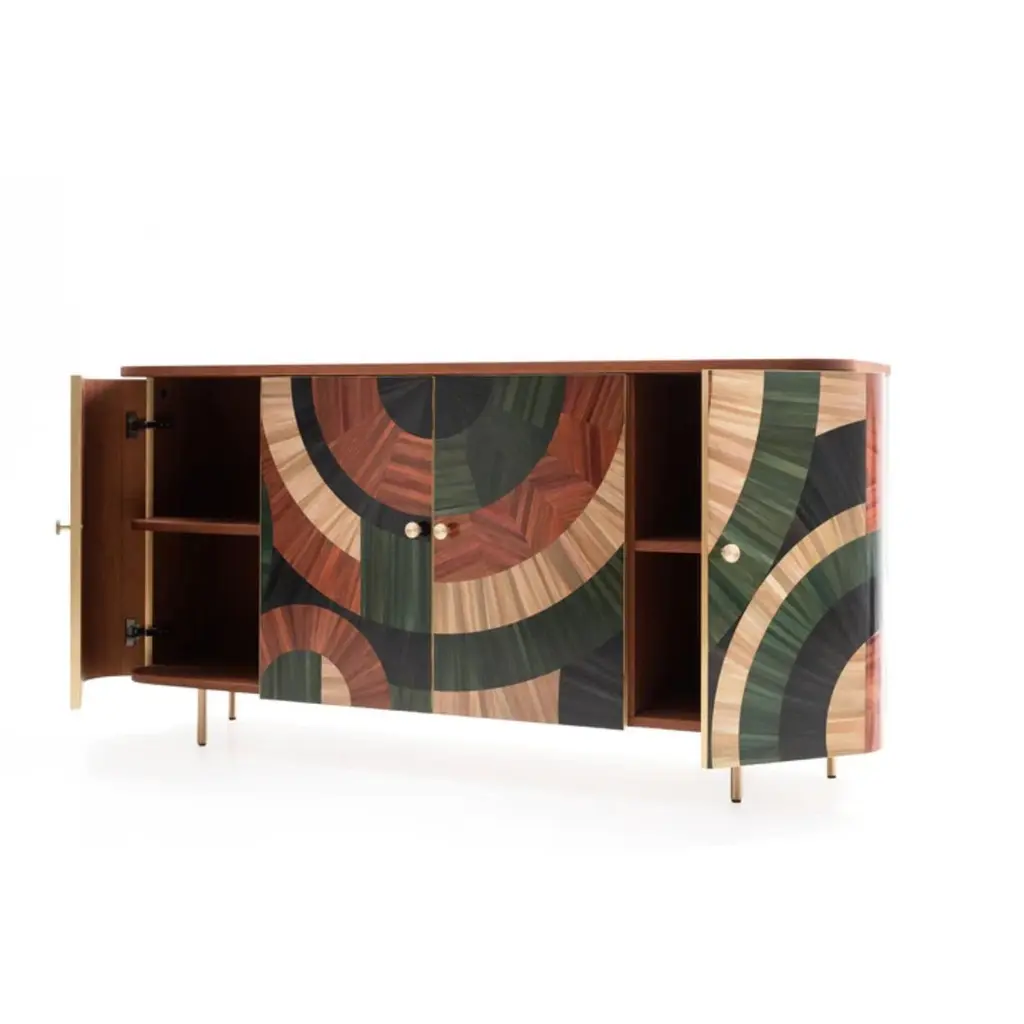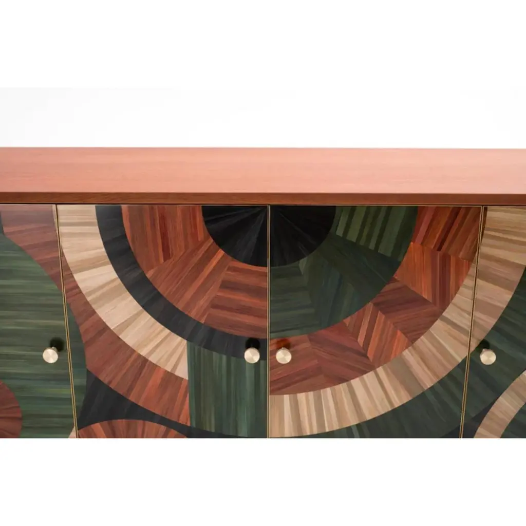 Solomia 4 Cabinet by Ruda StudioDimensions: D 45 x W 170 x H 75 cm.Materials: Solid wood (ash), rye straw inlay, plywood, glass and brass.Weight: 70 kg.Dimensions are customizable. Please contact us. Inspired by the wealth of Ukrainian land, RUDA Studio has created aninterior object – the Solomia cabinet. Seemingly trapped between the pastand the future, it serves as a timeless example. Combining vintage Art Decostylization with the philosophy of contemporary Ukrainian design, the cabinet was crafted by the studio's founder and designer, Oleksandra Rudenko. Made from oak and adorned with ornaments from rye straw, the cabinet's origin lies in Western Ukraine. There, the 80-year-old grandfather, Orestes, collects strawfor our products, carefully sorting them by length and diameter. Duringthis process, the oak frame—the foundation of the cabinet—is created. The countertop undergoes stitching, revealing the texture of the wood. In our workshop, the straw undergoes a staining stage before being intricately inlaid into the cabinet itself.Design brand RUDA Studio was founded in 2017 by Oleksandra Rudenko and Yuriy Vovnyanko. RUDA Studio - Ukrainian artisanal atelier with harvest of Fine Craft Design.In the atelier we create unique household items. The studio seeks to make each project individual and special, focusing on feelings, custom items, and the combination of the historical and the modern. Our creations are inspired by natural materials and ancient craft techniques. Each product has its own function, but is more like an object of art that touchesthe soul. The vision of interior items encourages us to preserve and actualize our cultural heritage. In our works, we restore knowledge about Ukrainian folklore, pay attention to socially important topics and focus on the interaction between humans and nature. In the studio, objects are created from local materials - brass, copper, clay, straw, algae, trees, andstone.