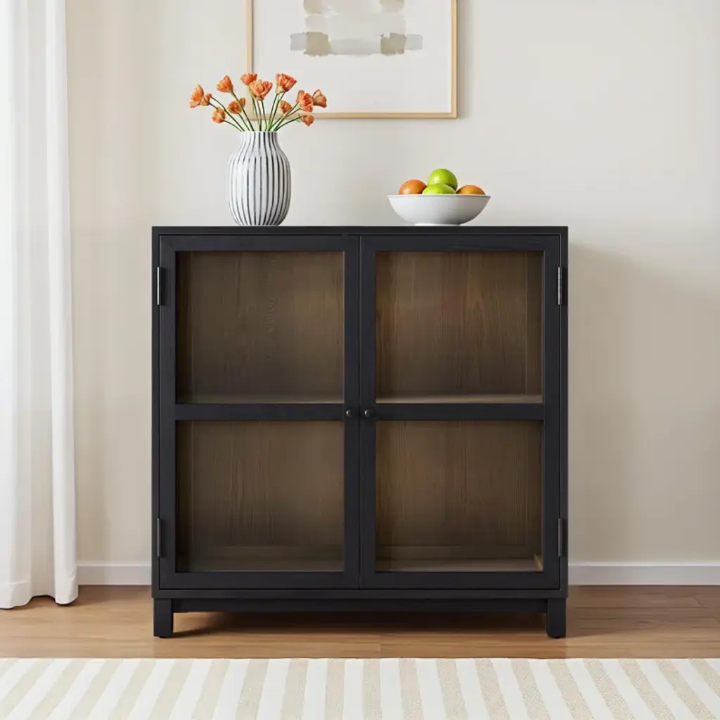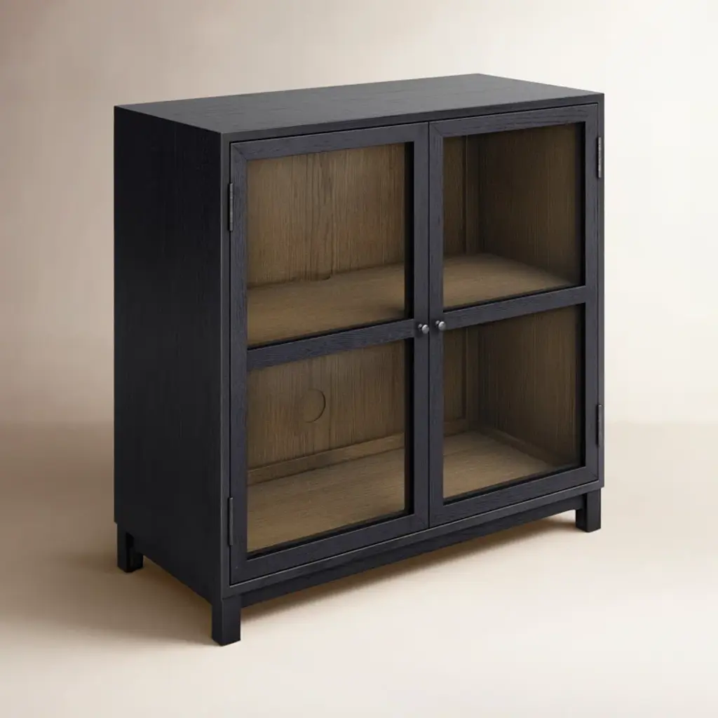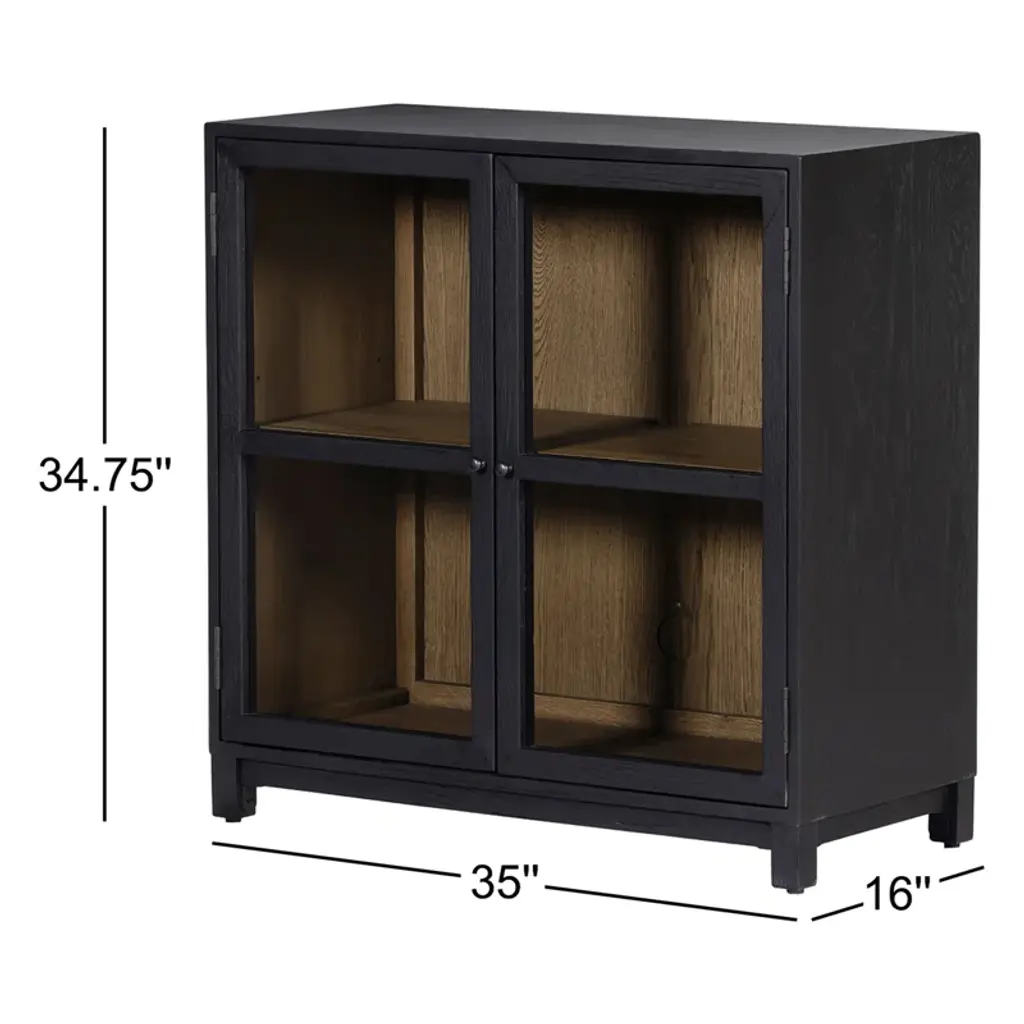 Black drifted oak frames lighter interior shelving for a subtle but striking contrast. Glass doors allow for prized possessions to dazzle on display. Rear cutout for cord management.