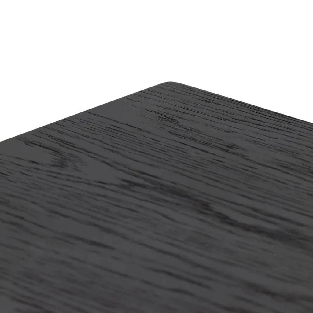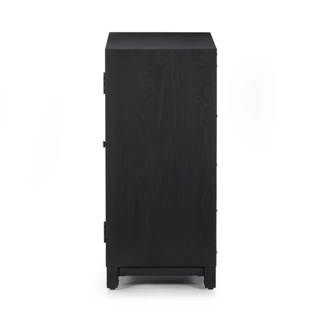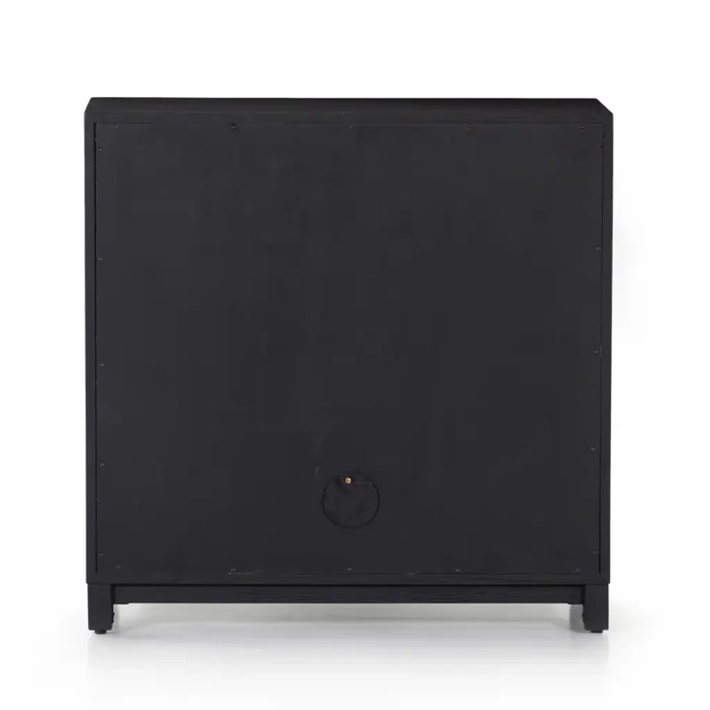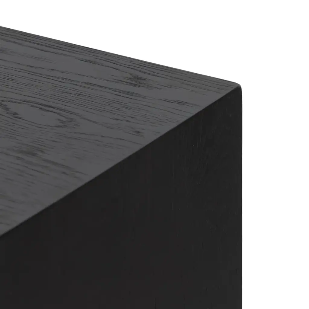 Black drifted oak frames lighter interior shelving for a subtle but striking contrast. Glass doors allow for prized possessions to dazzle on display. Rear cutout for cord management.