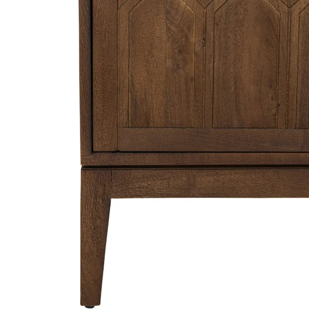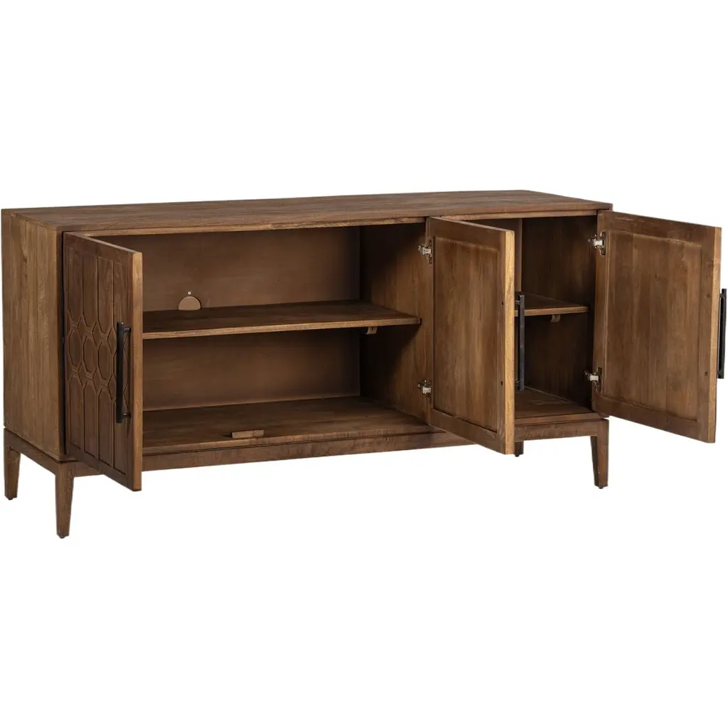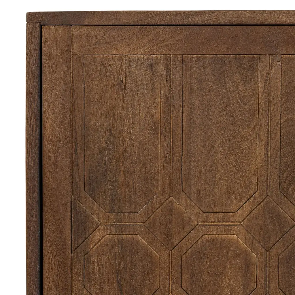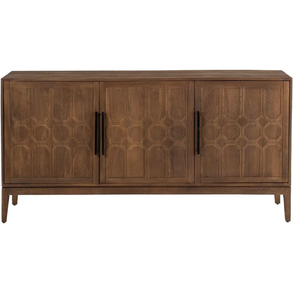 The Sorrel cabinet is a beautifully crafted piece featuring a solid wood structure. Its front cabinet doors showcase an intricate trellis-inspired design, adding depth and character to the piece. The cabinet is accented with sleek metal handles and hinges, offering both style and durability. Perfect for enhancing any room, the Sorrel Cabinet blends functionality with a unique, decorative touch.